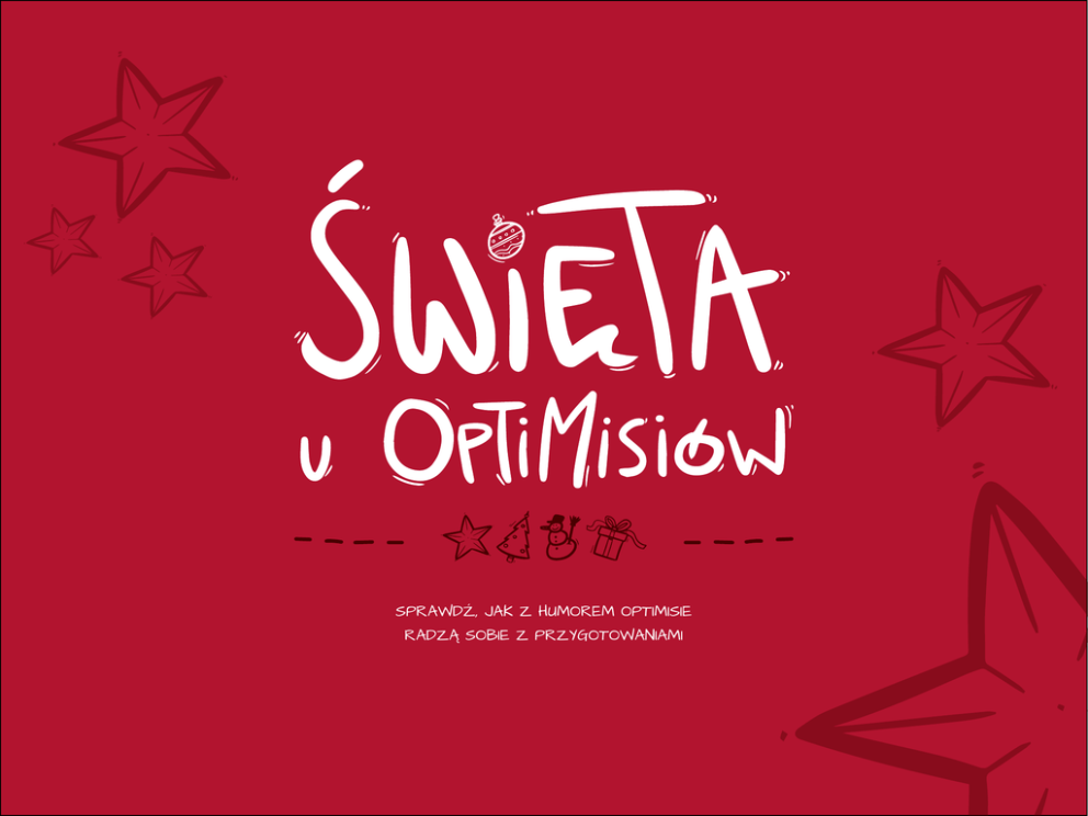 SPRAWDŹ, JAK Z HUMOREM OPTIMISIE RADZĄ SOBIE Z PRZYGOTOWANIAMI Jakie powinny być idealne Święta? Niekoniecznie białe, bo jak wiadomo pogoda płata czasem figla, a pani zima znika nagle, by niespodziewanie pojawić się tuż po Wigilii. Jednak na niebie zawsze świeci ta jedna, najważniejsza gwiazda, której wypatrują dzieci i dorośli (nawet jeśli ci drudzy nie chcą się przyznać). Co jest najważniejsze? Na pewno nie dwanaście potraw, perfekcyjnie wyprasowany obrus, dwumetrowa choinka, czy wypastowana na błysk podłoga. To tylko szczegóły, tak naprawdę nieważne, bo to nie z nimi do wigilijnego stołu. Najważniejsze jest niewidoczne dla oka. Zdrowie, domowe ciepło, wyrozumiałość i miłość — jej nie zastąpi nawet najwspanialszy prezent. Świąteczną gorączkę niech umili Wam wizyta w domku Optimisiów, a tam… oj dużo dzieje się przed świętami. A może i u Was jest podobnie? zasiadamy Co spotkało Optimisia, czyżby psocił trochę dzisiaj? Co z choinką, z piernikami, a z karpiami i śledziami? Czy mu szczęście dopisało, mało by mu brakowało, żeby poległ w gruzach plan, bo Optimiś wszystko sam… Ale zaraz pomaleńku, co zmalował w mig poznacie, gdy bajeczkę przeczytacie. ODCINEK 1 ODCINEK 2 CHWILĘ PÓŹNIEJ... CHWILĘ PÓŹNIEJ... ODCINEK 3 ODCINEK 4 CHWILĘ PÓŹNIEJ... ODCINEK 5 ODCINEK 6 CHWILĘ PÓŹNIEJ... Misiowości i słodkości, brzuszków pełnych i radości, wśród najbliższych leniuchować i plotkować, byle tylko nie pracować! Wykorzystaj czas z rodziną, koniec z każdą kwaśną miną. Niech te święta będą białe, doskonałe i wspaniałe! Czerp garściami upominki te najlepsze - od rodzinki i te które nieuchwytnemiłość, ciepło, zrozumienie, a gdy trzeba wybaczenie. Z naszej parki przykład bierz, bądź jak słodki Opti-zwierz! Miodzio Świąt Bożego Narodzenia!!! PODGLĄDAŁA W Optimie znajdziesz pożyczki dopasowane do Twoich potrzeb z możliwością obsługi w domu lub ze spłatą rat na konto. Pożyczkę możesz spłacić jednorazowo lub w wygodnych miesięcznych ratach. Nowością w ofercie Optima jest pożyczka on-line, która dostarczana jest do domu. Oprócz bezpiecznych i szybkich pożyczek, w Optima znajdziesz także pożyczki pod zastaw, kredyty konsolidacyjne, usługi Western Union i możliwość opłacania rachunków. Optima należy do międzynarodowej grupy finansowej Dollar Financial Group, działającej na rynku usług finansowych na całym świecie już ponad 30 lat. Od 1999 roku Optima jest członkiem założycielem Konferencji Przedsiębiorstw Finansowych w Polsce, która zrzesza obecnie kilkadziesiąt kluczowych przedsiębiorstw z rynku finansowego w Polsce, a jej misją jest wyznaczenie wysokich standardów postępowania w relacjach z Klientami i Kontrahentami. WIĘC EJ : WWW.OPTI MA.PL PODGLĄDAŁA