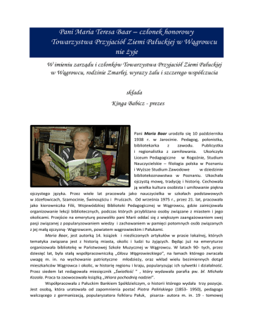 Pani Maria Teresa Baar – członek honorowy Towarzystwa Przyjaciół Ziemi Pałuckiej w Wągrowcu nie żyje W imieniu zarządu i członków Towarzystwa Przyjaciół Ziemi Pałuckiej w Wągrowcu, rodzinie Zmarłej, wyrazy żalu i szczerego współczucia składa Kinga Babicz - prezes Pani Maria Baar urodziła się 10 października 1938 r. w Jarocinie. Pedagog, polonistka, bibliotekarka z zawodu. Publicystka i regionalistka z zamiłowania. Ukończyła Liceum Pedagogiczne w Rogoźnie, Studium Nauczycielskie – filologia polska w Poznaniu i Wyższe Studium Zawodowe w dziedzinie bibliotekoznawstwa w Poznaniu. Ukochała ojczystą mowę, tradycję i historię. Cechowała ją wielka kultura osobista i umiłowanie piękna ojczystego języka. Przez wiele lat pracowała jako nauczycielka w szkołach podstawowych w Józefowicach, Szamocinie, Świnoujściu i Pruścach. Od września 1975 r., przez 21. lat, pracowała jako kierowniczka Filii, Wojewódzkiej Biblioteki Pedagogicznej w Wągrowcu, gdzie zainicjowała organizowanie lekcji bibliotecznych, podczas których przybliżano osoby związane z miastem i jego okolicami. Przejście na emeryturę pozwoliło pani Marii oddać się z większym zaangażowaniem swej pasji związanej z popularyzowaniem wiedzy i zachowaniem w pamięci potomnych osób związanych z jej małą ojczyzną- Wągrowcem, powiatem wągrowieckim i Pałukami. Maria Baar, jest autorką 14. książek i niezliczonych artykułów w prasie lokalnej, których tematyka związana jest z historią miasta, okolic i ludzi tu żyjących. Będąc już na emeryturze organizowała bibliotekę w Państwowej Szkole Muzycznej w Wągrowcu. W latach 90- tych, przez dziesięć lat, była stałą współpracowniczką „Głosu Wągrowieckiego”, na łamach którego zwracała uwagę m. in. na wychowanie patriotyczne młodzieży, oraz wkład wielu bezimiennych dotąd mieszkańców Wągrowca i okolic, w historię regionu i kraju, popularyzując ich sylwetki i działalność. Przez siedem lat redagowała miesięcznik „Światłość ” , który wydawała parafia pw. bł. Michała Kozala. Praca ta zaowocowała książką „Wiara pochodnią nadziei”. Współpracowała z Pałuckim Bankiem Spółdzielczym, o historii którego wydała trzy pozycje. Jest osobą, która uratowała od zapomnienia postać Piotra Palińskiego (1853- 1950), pedagoga walczącego z germanizacją, popularyzatora folkloru Pałuk, pisarza- autora m. in. 19 - tomowej kroniki wydarzeń I Wojny Światowej, autora pierwszej monografii o Wągrowcu, działacza społecznooświatowego, którego twórczość i działalność popierał gorąco Henryk Sienkiewicz, uważając że umacnia gospodarczą pozycję Polaków, redaktora prasy lokalnej. To dzięki jej zabiegom imię tego wybitnego Polaka, regionalisty i patrioty otrzymała 27. 10. 1982 r. jedna z ulic w naszym mieście; 22.10.1987 r. Biblioteka Pedagogiczna w Wągrowcu, zaś on sam w roku 1988 otrzymał pośmiertnie Medal Rodła. To nie jedyny mieszkaniec Wągrowca, któremu poświęciła miesiące wytężonej pracy, by przybliżyć jego działalność. Jest także autorką biografii Tadeusza Nożyńskiego, Bronisława Zielińskiego czy ks. Piotra Ratajczaka. Dzięki swemu zaangażowaniu , na trwałe wpisała się w historię naszego miasta i regionu Pałuk . Jest postacią rozpoznawalną w mieście i regionie, budzącą szacunek i uznanie. Mimo, iż nie pochodzi z Wągrowca, mocno wrosła w krajobraz tej ziemi sławiąc jej piękno, wykazując się wielką kulturą słowa, doceniając wartość ludzkiej pracy w dziedzinie propagowania kultury, przypominając sylwetki ludzi związanych z regionem. Swe prace kierowała szczególnie do młodzieży. To dla niej pragnęła zachować w pamięci tych wszystkich , którzy swą mozolną pracą, często nienależycie docenianą za ich życia, tworzyli naszą małą Ojczyznę. Pani Maria Baar za swą działalność została uhonorowana Nagrodą Ministra Oświaty w roku 1975, 1980 i 1990. Otrzymała medal „za wybitne zasługi w rozwoju województwa pilskiego”, „za wybitne osiągnięcia w zakresie Postępu Pedagogicznego”, odznaczenie „Zasłużony Działacz Kultury”, „Medal Rodła”, „Medal Komisji Edukacji Narodowej” oraz „Złoty Krzyż Zasługi”. Jest honorowym mieszkańcem miasta Wągrowca, a w październiku 2011 r. otrzymała” Złoty Liść 2011”- Doroczną Honorową Nagrodę „Głosu Wągrowieckiego” przyznawaną ludziom „zwykłym za ich niezwykłość”, ludziom „przeciętnym za ich nieprzeciętność”. Jej działalność wpisuje się w misję wspierania inicjatyw indywidualnych na rzecz rozwoju kultury w Wielkopolsce, integruje mieszkańców regionu wokół wartości kulturowych wpisujących się do dorobku ogólnopolskiego, rozwija świadomość obywatelską, wyzwala aktywność społeczności lokalnej. Pani Maria Baar zmarła w dniu 2 listopada 2016 r. w Jozefowie k./Warszawy. Jej pogrzeb odbędzie się w dniu 14 listopada 2016 r. o godz. 1300 w Szamocinie. Cześć Jej pamięci !