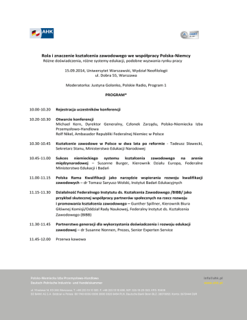 Rola i znaczenie kształcenia zawodowego we współpracy Polska-Niemcy Różne doświadczenia, różne systemy edukacji, podobne wyzwania rynku pracy 15.09.2014, Uniwersytet Warszawski, Wydział Neofilologii ul. Dobra 55, Warszawa Moderatorka: Justyna Golonko, Polskie Radio, Program 1 PROGRAM* 10.00-10.20 Rejestracja uczestników konferencji 10.20-10.30 Otwarcie konferencji Michael Kern, Dyrektor Generalny, Członek Zarządu, Polsko-Niemiecka Izba Przemysłowo-Handlowa Rolf Nikel, Ambasador Republiki Federalnej Niemiec w Polsce 10.30-10.45 Kształcenie zawodowe w Polsce w dwa lata po reformie - Tadeusz Sławecki, Sekretarz Stanu, Ministerstwo Edukacji Narodowej 10.45-11.00 Sukces niemieckiego systemu kształcenia zawodowego na arenie międzynarodowej – Susanne Burger, Kierownik Działu Europa, Federalne Ministerstwo Edukacji i Badań 11.00-11.15 Polska Rama Kwalifikacji jako narzędzie wspierania rozwoju kwalifikacji zawodowych – dr Tomasz Saryusz-Wolski, Instytut Badań Edukacyjnych 11.15-11.30 Działalność Federalnego Instytutu ds. Kształcenia Zawodowego /BIBB/ jako przykład skutecznej współpracy partnerów społecznych na rzecz rozwoju i promowania kształcenia zawodowego – Gunther Spillner, Kierownik Biura Głównej Komisji/Oddział Rady Naukowej, Federalny Instytut ds. Kształcenia Zawodowego (BIBB) 11.30-11.45 Partnerstwo generacji dla wykorzystania doświadczenia i rozwoju edukacji zawodowej – dr Susanne Nonnen, Prezes, Senior Experten Service 11.45-12.00 Przerwa kawowa 12.00-13.00 Panel dyskusyjny: Jak państwo może wspierać kształcenie zawodowe? Wprowadzenie (10 min.): Katarzyna Kozłowska-Błoch, Kierownik Działu „Rozwój Kompetencji Fachowych i Kształcenie Zawodowe” Volkswagen Poznań, prezentacja doświadczeń firmy w zakresie kształcenia przyszłej kadry Uczestnicy: Katarzyna Kozłowska-Błoch, Kierownik Działu „Rozwój Kompetencji Fachowych i Kształcenie Zawodowe” Volkswagen Poznań Ilona Antoniszyn-Klik, Podsekretarz Stanu, Ministerstwo Gospodarki Susanne Burger, Kierownik Działu Europa, Federalne Ministerstwo Edukacji i Badań Krystyna Boczkowska, Prezes Zarządu, Robert Bosch Polska Tadeusz Sławecki, Sekretarz Stanu, Ministerstwo Edukacji Narodowej 13.00-14.00 Panel dyskusyjny: Zróżnicowane zainteresowanie młodych Polaków i Niemców kształceniem zawodowym Wprowadzenie (10 min.): Mariusz Seneczyn, Kierownik Działu Szkoleń, Häring Polska, prezentacja doświadczeń firmy prowadzącej własne szkoły w Polsce i Niemczech Uczestnicy: Mariusz Seneczyn, Kierownik Działu Szkoleń, Häring Polska Krystyna Woźniak, Członek Zarządu, Solaris Bus & Coach Cornelius Ochmann, Dyrektor i Członek Zarządu, Fundacja Współpracy PolskoNiemieckiej Sławomir Fater, Dyrektor, Centrum Kształcenia Ustawicznego Nowoczesnych Technologii w Łodzi 14.00-14.15 Przerwa kawowa 14.15-15.15 Panel dyskusyjny: Partnerstwo dla kształcenia zawodowego Wprowadzenie (10 min): Ursula Poller, Z-ca Dyrektora Generalnego, IHK Nürnberg, prezentacja doświadczeń IHK Nürnberg Uczestnicy: Ursula Poller, Zastępca Dyrektora Generalnego, IHK Nürnberg dr Susanne Nonnen, Prezes, Senior Experten Service Prof. dr hab. Jacek Męcina, Sekretarz Staniu, Ministerstwo Pracy i Polityki Społecznej Barbara Kaśnikowska, Prezes Zarządu, Wałbrzyska Specjalna Strefa Ekonomiczna Mirosława Rudzka, Dyrektor Działu Szkoleń, Mercedes-Benz Polska 15.15-15.30 Podsumowanie Maria Montowska, Dyrektor, Kształcenie Zawodowe i Szkolenia, Polsko-Niemiecka Izba Przemysłowo-Handlowa 15.30 Get- together * Organizator zastrzega sobie prawo do korekty i zmian niektórych punktów programu na etapie realizacji projektu.