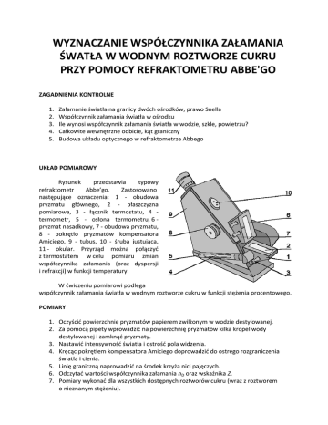 WYZNACZANIE WSPÓŁCZYNNIKA ZAŁAMANIA ŚWATŁA W WODNYM ROZTWORZE CUKRU PRZY POMOCY REFRAKTOMETRU ABBE'GO ZAGADNIENIA KONTROLNE 1. 2. 3. 4. 5. Załamanie światła na granicy dwóch ośrodków, prawo Snella Współczynnik załamania światła w ośrodku Ile wynosi współczynnik załamania światła w wodzie, szkle, powietrzu? Całkowite wewnętrzne odbicie, kąt graniczny Budowa układu optycznego w refraktometrze Abbego UKŁAD POMIAROWY Rysunek przedstawia typowy refraktometr Abbe’go. Zastosowano następujące oznaczenia: 1 - obudowa pryzmatu głównego, 2 - płaszczyzna pomiarowa, 3 - łącznik termostatu, 4 termometr, 5 - osłona termometru, 6 pryzmat nasadkowy, 7 - obudowa pryzmatu, 8 - pokrętło pryzmatów kompensatora Amiciego, 9 - tubus, 10 - śruba justująca, 11 - okular. Przyrząd można połączyć z termostatem w celu pomiaru zmian współczynnika załamania (oraz dyspersji i refrakcji) w funkcji temperatury. W ćwiczeniu pomiarowi podlega współczynnik załamania światła w wodnym roztworze cukru w funkcji stężenia procentowego. POMIARY 1. Oczyścić powierzchnie pryzmatów papierem zwilżonym w wodzie destylowanej. 2. Za pomocą pipety wprowadzić na powierzchnię pryzmatów kilka kropel wody destylowanej i zamknąć pryzmaty. 3. Nastawić intensywność światła i ostrość pola widzenia. 4. Kręcąc pokrętłem kompensatora Amiciego doprowadzić do ostrego rozgraniczenia światła i cienia. 5. Linię graniczną naprowadzić na środek krzyża nici pajęczych. 6. Odczytać wartości współczynnika załamania nD oraz wskaźnika Z. 7. Pomiary wykonać dla wszystkich dostępnych roztworów cukru (wraz z roztworem o nieznanym stężeniu). Stężenie, % Poprawki Współczynnik Wskaźnik załamania nD Z A B Dyspersja ν δ Refrakcja właściwa Rw, m3/kg 0 2 4 6 8 10 X OBLICZENIA 1. Sporządzić wykres zależności współczynnika załamania światła wodnego roztworu cukru w funkcji stężenia procentowego. 2. Metodą regresji liniowej obliczyć współczynniki prostej, najlepiej pasującej do punktów pomiarowych (wraz z niepewnościami). 3. Z równania prostej obliczyć stężenie nieznanego roztworu. 4. Korzystając z prawa przenoszenia niepewności obliczyć niepewność wyznaczenia nieznanego stężenia. 5. Zapisać wynik i jego niepewność w prawidłowym formacie. 6. Z tablic refraktometrycznych określić wartości poprawek A, B i δ. 7. Obliczyć współczynnik dyspersji (współczynnik Abbego) ν dla każdego stężenia n −1 ν= D . A + δB 8. Sporządzić wykres zależności współczynnika dyspersji wodnego roztworu cukru w funkcji stężenia procentowego. 9. Obliczyć współczynnik refrakcji właściwej Rw dla każdego stężenia. n2 − 1 1 Rw = 2 ⋅ , n +2 ρ gdzie ρ – gęstość roztworu (jest funkcją. 10. Sporządzić wykres zależności współczynnika refrakcji właściwej wodnego roztworu cukru w funkcji stężenia procentowego. 11. Skomentować otrzymane zależności graficzne.