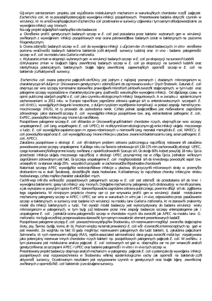 Głównym zamierzeniem projektu jest wyjaśnienie molekularnych mechanizmów warunkujących chorobotwórczość pałeczek Escherichia coli, które posiadają potencjał do wywołania infekcji pozajelitowych. Prezentowane badania dotyczą czynników wirulencji, które umożliwiają pałeczkom Escherichia coli przetrwanie w surowicy człowieka i tym samym są odpowiedzialne za wywołanie infekcji uogólnionych. Na cały projekt składają się następujące cele badawcze: a. Określenie profili genetycznych badanych szczepów E. coli pod posiadania przez bakterie wybranych genów wirulencji związanych z wywołaniem infekcji pozajelitowych oraz ocena pokrewieństwa badanych izolatów bakteryjnych na poziomie filogenetycznym. b. Ocena zdolności badanych szczepów E. coli do wywołania infekcji z użyciem dwóch metod badawczych: in vitro- określenie poziomu wrażliwości badanych bakteriina bakteriobójczą aktywość surowicy ludzkiej oraz in vivo - badanie patogenności szczepów E. coli na modelu larw Galleria mellonella. c. Wykazanie zmian w ekspresjii wybranych genów wirulencji badanych szczepów E. coli po ekspozycji na surowicę ludzką. d.Wykazanie zmian w białkach błony zewnętrznej badanych szczepów E. coli po ekspozycji na surowicę ludzką oraz identyfikacja potencjalnych, bakteryjnych białek błony zewnętrznej zapewniającyh oporność szczepów E. coli na bakteriobójczą aktywność surowicy. Escherichia coli zwana potocznie pałeczką okrężnicy jest jednym z najlepiej poznanych i zbadanych mikroorganizmów, charakteryzuje się dużym zróżnicowaniem genetycznym i zdolnościami do zajmowania wielu różnych środowik. Gatunek E. coli obejmuje zarówno szczepy komensalne stanowiące prawidłową mikroflorę jelitową zwierząt stałocieplnych, w tym ludzi oraz patogenne szczepy wyposażone w charakterystyczne geny zjadliwości warunkujące wywołanie infekcji. Od dłuższego czasu w opinii publicznej utarł się pogląd o E. coli jako czynniku etiologicznych infekcji biegunkowych. A w zwiazku z epidemicznymi zachorowaniami w 2011 roku w Europie największe zagrożenie zdrowia upatruje się w enterokrwotocznych szczepach E. coli (EHEC), wywołujących biegunki krwotoczne, z dużym ryzykiem wystąpienie komplikacji w postaci zespołu hemolitycznomocznicowego (HUS), który prowadzi do uszkodzenia nerek. Często jednak społeczeństwo jest nieświadome zagrożenie zdrowotnego jakie stanowią szczepy E. coli wywołujące infekcje pozajelitowe tzw. ang. extraintestinal pathogenic E. coli, ExPEC, powodujące infekcje uogólnione lub narządowe. Pozajelitowe patogenne szczepy E. coli są bardzo zróżnicowaną grupą bakterii chorobotwórczych, obejmują zarówno szczepy uropatogenne E. coli (ang. uropathogenic E. coli UPEC), które sączynnikiem etiologicznym głównie infekcji układu moczowego u ludzi; E. coli wywołujące zapalenie opon mózgowo-rdzeniowych u niemowląt (ang. neonatal menigitidis E. coli, NMEC); E. coli powodujące sepsę oraz E. coli wywołujące uogólnione infekcje u ptactwa zwane kolibakteriozamiu (ang. avian pathogenic E. coli, APEC). Zakażenia pozajelitowe o etiologii E. coli są istotnym problem zdrowia publicznego,a najczęściej notowane są zakażenia powodowane przez szczepy uropatogenne. Każdego roku na świecie odnotowuje się 130-175 mln zachorowań o etiologii UPEC, czego konsekwencją są ogromne koszty związane z opieką zdrowotną. Szacuje się, że około 60% kobiet powyżej 18 roku życia przechodzi infekcje układu moczowego najczęściej o etiologii UPEC przynajmniej raz w ciągu życia. Jednakze większym zagrożeniem zdrowotnym jest fakt, że szczepy uropatogenne E. coli mogą przedostać się do krwiobiegu powodując sepsę tzw. urosepsą, która stanowi około 25% wszystkich przypadków zachorowań na tą jednostke chorobową. Natomiast szczepy APEC wywołujące wielonarządowe infekcje u ptactwa, są przyczyną milionowych straty w przemyśle drobiarskim na w skali światowej, dziesiątkując stada hodowlane. Kolibakteriozy to najczęstsze choroby infekcyjne drobiu hodowlanego, często mające charakter zakażeń wtórnych. Cechą wspólną dla większości pozajelitowych patogennych szczepów E. coli jest zdolność do przedostania się do krwi i wywołania bakteriemii, spesy lub infekcji uogólnionych. Dokładne mechanizmy patogenezy tych drobnoustrojów nie są poznane, a jak wykazano w powyżym opisie ExPEC stanowią poważne zagrożenie zdrowia publicznego, powinno dążyć się do zgłębienia tego zagadanienia. W niniejszym projekcie chcemy oprócz porównywania profili genów wirulencji zbadać molekularne mechanizmy patogenezy szczepów APEC i UPEC zarówno w warunkach in vitro jak i in vivo, odpowiednio przez pasażowanie szczepów bakteryjnych w surowicy oraz badanie ich wirulencji na modelu larw Galleria mellonella, które stanowią znakomity model dla infekcji bakteryjnych u ludzi. Ten owadzi model badawczy jest wykorzystywany do badania wirulencji wielu mikroorganizmów patogennych, w tym były już testowane przez inne zespoły badawcze szczepy enteropatogenne jak i uropatogenne E. coli . Jednakże ocena patogenności szczepów chorobotwórcyzch dla zwierząt jak APEC na modelu larw G. mellonella nie była wcześniej przeprowadzana stanowiąc tym samym nowatorski element prezentowanych badań. Pozajelitowe patogenne szczepy E. coli powszechnie występują w środowisku, ich rezerwuarem mogą być zwierzęta stałocieplne (koty, psy, świnie, bydło, konie, drób). Poziom wiedzy na temat prewalencji E. coli wśród zwierząt zmiennocieplnych np. gadów jest niewielki. Ze względu na fakt iż gady mogą byc rezerwuarem patogennych dla ludzi bakterii, tj. zakażenia pałeczkami Salmonella, których rezerwurem są gady (RAS, reptile-associated salmonellosis) dana grupa zwierząt może byc rozpatrywana jako potencjalny rezerwuar innych chorobotwórczych bakterii np. pozajelitowych patogennych pałeczek E. coli. W 
