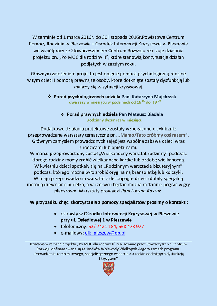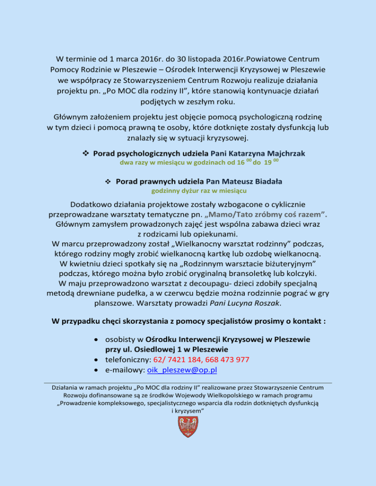 W terminie od 1 marca 2016r. do 30 listopada 2016r.Powiatowe Centrum Pomocy Rodzinie w Pleszewie – Ośrodek Interwencji Kryzysowej w Pleszewie we współpracy ze Stowarzyszeniem Centrum Rozwoju realizuje działania projektu pn. „Po MOC dla rodziny II”, które stanowią kontynuacje działań podjętych w zeszłym roku. Głównym założeniem projektu jest objęcie pomocą psychologiczną rodzinę w tym dzieci i pomocą prawną te osoby, które dotknięte zostały dysfunkcją lub znalazły się w sytuacji kryzysowej. Porad psychologicznych udziela Pani Katarzyna Majchrzak dwa razy w miesiącu w godzinach od 16 00 do 19 00 Porad prawnych udziela Pan Mateusz Biadała godzinny dyżur raz w miesiącu Dodatkowo działania projektowe zostały wzbogacone o cyklicznie przeprowadzane warsztaty tematyczne pn. „Mamo/Tato zróbmy coś razem”. Głównym zamysłem prowadzonych zajęć jest wspólna zabawa dzieci wraz z rodzicami lub opiekunami. W marcu przeprowadzony został „Wielkanocny warsztat rodzinny” podczas, którego rodziny mogły zrobić wielkanocną kartkę lub ozdobę wielkanocną. W kwietniu dzieci spotkały się na „Rodzinnym warsztacie biżuteryjnym” podczas, którego można było zrobić oryginalną bransoletkę lub kolczyki. W maju przeprowadzono warsztat z decoupagu- dzieci zdobiły specjalną metodą drewniane pudełka, a w czerwcu będzie można rodzinnie pograć w gry planszowe. Warsztaty prowadzi Pani Lucyna Roszak. W przypadku chęci skorzystania z pomocy specjalistów prosimy o kontakt : osobisty w Ośrodku Interwencji Kryzysowej w Pleszewie przy ul. Osiedlowej 1 w Pleszewie telefoniczny: 62/ 7421 184, 668 473 977 e-mailowy: [email protected] Działania w ramach projektu „Po MOC dla rodziny II” realizowane przez Stowarzyszenie Centrum Rozwoju dofinansowane są ze środków Wojewody Wielkopolskiego w ramach programu „Prowadzenie kompleksowego, specjalistycznego wsparcia dla rodzin dotkniętych dysfunkcją i kryzysem”