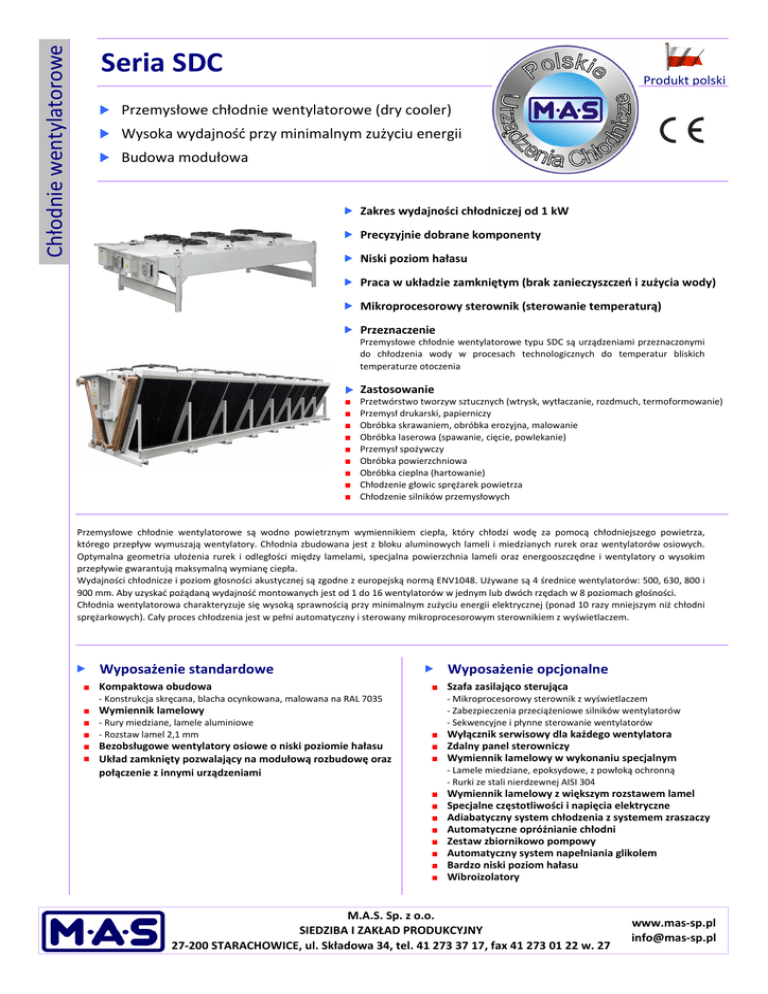 Chłodnie wentylatorowe Seria SDC Produkt polski Przemysłowe chłodnie wentylatorowe (dry cooler) Wysoka wydajność przy minimalnym zużyciu energii Budowa modułowa Zakres wydajności chłodniczej od 1 kW Precyzyjnie dobrane komponenty Niski poziom hałasu Praca w układzie zamkniętym (brak zanieczyszczeń i zużycia wody) Mikroprocesorowy sterownik (sterowanie temperaturą) Przeznaczenie Przemysłowe chłodnie wentylatorowe typu SDC są urządzeniami przeznaczonymi do chłodzenia wody w procesach technologicznych do temperatur bliskich temperaturze otoczenia Zastosowanie ■ ■ ■ ■ ■ ■ ■ ■ ■ Przetwórstwo tworzyw sztucznych (wtrysk, wytłaczanie, rozdmuch, termoformowanie) Przemysł drukarski, papierniczy Obróbka skrawaniem, obróbka erozyjna, malowanie Obróbka laserowa (spawanie, cięcie, powlekanie) Przemysł spożywczy Obróbka powierzchniowa Obróbka cieplna (hartowanie) Chłodzenie głowic sprężarek powietrza Chłodzenie silników przemysłowych Przemysłowe chłodnie wentylatorowe są wodno powietrznym wymiennikiem ciepła, który chłodzi wodę za pomocą chłodniejszego powietrza, którego przepływ wymuszają wentylatory. Chłodnia zbudowana jest z bloku aluminowych lameli i miedzianych rurek oraz wentylatorów osiowych. Optymalna geometria ułożenia rurek i odległości między lamelami, specjalna powierzchnia lameli oraz energooszczędne i wentylatory o wysokim przepływie gwarantują maksymalną wymianę ciepła. Wydajności chłodnicze i poziom głosności akustycznej są zgodne z europejską normą ENV1048. Używane są 4 średnice wentylatorów: 500, 630, 800 i 900 mm. Aby uzyskać pożądaną wydajność montowanych jest od 1 do 16 wentylatorów w jednym lub dwóch rzędach w 8 poziomach głośności. Chłodnia wentylatorowa charakteryzuje się wysoką sprawnością przy minimalnym zużyciu energii elektrycznej (ponad 10 razy mniejszym niż chłodni sprężarkowych). Cały proces chłodzenia jest w pełni automatyczny i sterowany mikroprocesorowym sterownikiem z wyświetlaczem. Wyposażenie standardowe ■ Kompaktowa obudowa - Konstrukcja skręcana, blacha ocynkowana, malowana na RAL 7035 ■ Wymiennik lamelowy ■ - Rury miedziane, lamele aluminiowe ■ - Rozstaw lamel 2,1 mm ■ Bezobsługowe wentylatory osiowe o niski poziomie hałasu ■ Układ zamknięty pozwalający na modułową rozbudowę oraz połączenie z innymi urządzeniami Wyposażenie opcjonalne ■ Szafa zasilająco sterująca - Mikroprocesorowy sterownik z wyświetlaczem - Zabezpieczenia przeciążeniowe silników wentylatorów - Sekwencyjne i płynne sterowanie wentylatorów ■ Wyłącznik serwisowy dla każdego wentylatora ■ Zdalny panel sterowniczy ■ Wymiennik lamelowy w wykonaniu specjalnym - Lamele miedziane, epoksydowe, z powłoką ochronną - Rurki ze stali nierdzewnej AISI 304 ■ Wymiennik lamelowy z większym rozstawem lamel ■ Specjalne częstotliwości i napięcia elektryczne ■ Adiabatyczny system chłodzenia z systemem zraszaczy ■ Automatyczne opróżnianie chłodni ■ Zestaw zbiornikowo pompowy ■ Automatyczny system napełniania glikolem ■ Bardzo niski poziom hałasu ■ Wibroizolatory M.A.S. Sp. z o.o. SIEDZIBA I ZAKŁAD PRODUKCYJNY 27-200 STARACHOWICE, ul. Składowa 34, tel. 41 273 37 17, fax 41 273 01 22 w. 27 www.mas-sp.pl [email protected]