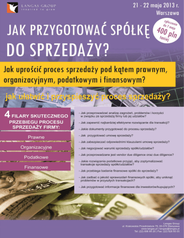 Jak przygotować spółkę do sprzedaży? Jak uprościć proces sprzedaży pod kątem prawnym, organizacyjnym, podatkowym i finansowym? 4 FILARY SKUTECZNYCH PRZYGOTOWAŃ SPÓŁKI DO SPRZEDAŻY Szanowni Państwo, jak rzetelnie przygotować firmę do sprzedaży i udanego zamknięcia transakcji? Bez względu na powód dla którego właściciele firmy decydują się na sprzedaż firmy lub jej udziałów, czy jest to związane z pojawieniem się nowej szansy na rynku, czy problemów, odpowiednie przygotowanie spółki do transakcji daje szansę, aby zwiększyć jej wartość, a co za tym idzie także i cenę sprzedaży. Zapraszamy do udziału w dwudniowym, przekrojowym szkoleniu, podczas którego dowiedzą się Państwo, jak przygotować proces sprzedaży firmy bądź jej udziałów pod kątem prawnym, organizacyjnym, podatkowym i finansowych. O co należy zadbać w na etapie przygotowań i czego można się spodziewać podczas przebiegu całego procesu zarówno z perspektywy sprzedającego, jak i kupującego. 4 FILARY SKUTECZNEGO PRZEBIEGU PROCESU SPRZEDAŻY FIRMY: Prawne Organizacyjne Podatkowe Finansowe PRAWO JAK PRAWNIE ZABEZPIECZYĆ TRANSAKCJE? ORGANIZACJA JAK ZADBAĆ O BEZPIECZNĄ ORGANIZACJĘ PROCESU SPRZEDAŻY? PODATKI JAKIE ROZWIĄZANIA PODATKOWE PRZYJĄĆ? FINANSE JAK PRZYGOTOWAĆ SPÓŁKĘ POD KĄTEM FINANSOWYM? PODCZAS SZKOLENIA DOWIEDZĄ SIĘ PAŃSTWO: Jakie są wymogi prawne związane z przygotowanie spółki do sprzedaży? Jakie rozwiązania podatkowe przyjąć, aby zoptymalizować transakcje? Jakie obowiązki spoczywają po stronie sprzedającego/kupującego? Jakie dokumenty przygotować do procesu sprzedaży spółki lub jej udziałów? W jaki sposób zorganizowany jest proces badania prawnego sprzedawanej spółki? Jakie dokumenty przygotować do procesu sprzedaży? Jak przygotować umowę sprzedaży? Jak zabezpieczać transakcję sprzedaży? Jak negocjować warunki sprzedaży spółki/udziałów? Jak przeprowadzane jest vendor due diligence oraz due diligence? Jakie rozwiązania podatkowe przyjąć, aby zoptymalizować transakcje sprzedaży spółki/udziałów? Jak przebiega badanie finansowe spółki do sprzedaży? Jak zadbać o jakość sprawozdań finansowych spółki, aby uniknąć problemów w przyszłych transakcjach? Jak przygotować informacje finansowe dla inwestorów/kupujących? METODOLOGIA: Szkolenie ma charakter wykładowy połączony z analizą case study, przepisów, dyskusjami nad procesem i przebiegiem sprzedaży spółek oraz ich udziałów. Wieloaspektowe omówienie przebiegu takiego procesu pozwoli przyjrzeć się najbardziej kluczowym elementom przygotowań wewnętrznych. Poznanie najbardziej aktualnych reguł i przepisów przy praktycznym podejściu prowadzących ma zapewnić uczestnikom nie tylko wiedzę, ale i pewność podejmowanych działań w przyszłości. W przypadku jakichkolwiek pytań Proszę o kontakt telefoniczny z zespołem Langas Group pod numerem telefonu (22) 696 80 20, lub za pomocą poczty elektronicznej: [email protected] Z poważaniem, Barbara Zielińska Kierownik Projektu SZKOLENIE SKIEROWANE DO: Właścicieli firm Dyrektorów Finansowych Dyrektorów Biur Prawnych Kierowników ds. Inwestycji Dyrektorów ds. Rozwoju Dyrektorów Operacyjnych Kierowników ds. korporacyjnych Koordynator ds. organizacyjno-prawnych AGENDA SZKOLENIA DZIEŃ I DZIEŃ II 09.30 - rozpoczęcie 09.30 – 11.00 sesja I 11.00 – 11.15 przerwa 11.15 – 12.45 sesja II 12.45– 13.30 obiad 13.30 – 15.00 sesja III 15.00 – 15.15 przerwa 15.15 - 16.30 sesja IV 09.00 - rozpoczęcie 09.00 – 10.30 sesja I 10.30 – 10.45 przerwa 10.45 – 12.30 sesja II 12.30 – 12.45 przerwa 12.45 – 14.15 sesja III 14.15 – 15.00 obiad 15.00 – 16.00 sesja III Langas Group ul. Krakowskie Przedmieście 79, 00-079 Warszawa www.langas.pl | [email protected] Tel: (22) 696 80 20 | Fax: (22) 826 85 05 4 filary skutecznego przebiegu procesu sprzedaży firmy – prawo, organizacja, finanse, podatki JAK PRZYGOTOWAĆ SPÓŁKĘ DO SPRZEDAŻY? Dzień I F O R M Y S P R Z E D A Ż Y P R Z Y G O T O W A N I E D O S P R Z E D A Ż Y PROCES SPRZEDAŻY SPÓŁKI – ASPEKTY PRAWNE I ORGANIZACYJNE mec. Andrzej Tropaczyński, ekspert ds. procesów połączeń, restrukturyzacji i przejęć (M&A) FORMY SPRZEDAŻY DZIAŁALNOŚCI GOSPODARCZEJ Jakie są możliwości prawno-organizacyjne w zakresie transakcji sprzedaży? Sprzedaż udziałów lub akcji Sprzedaż przedsiębiorstwa lub jego zorganizowanej części Konsekwencje prawne wyboru każdego z wariantów Obowiązki i odpowiedzialność każdej ze stron CASE STUDY: wybór odpowiedniego modelu sprzedaży MODELOWANIE FINANSOWANIA DLA TRANSAKCJI KUPNA Jak kształtować rozwiązania finansowe dla procesu kupna? Dzień II BEZPIECZEŃSTWO PRAWNE TRANSAKCJI SPRZEDAŻY SPOŁEK/UDZIAŁÓW PRZYGOTOWANIE DO TRANSAKCJI SPRZEDAŻY KLAUZULE ZABEPIECZAJĄCEGO TRANSAKCJE SPRZEDAZY SPÓŁKI/UDZIAŁÓW O co zadbać przed sprzedażą? W jaki sposób badany jest stan prawny spółki przez sprzedającego? W jaki sposób zapewnić ochronę interesów na etapie tworzenia zapisów umowy? Tzw. vendor’s due diligence: a) przygotowanie i przebieg procesu b) identyfikacja problemów i zagrożeń Restrukturyzacja finansowa poprzedzająca sprzedaż Zawieranie odpowiednich umów z osobami kluczowymi dla procesu sprzedaży Przygotowanie informacji dla kupującego Formy wystawienia spółki na sprzedaż CASE STUDY: przygotowanie informacji dla kupującego – popełniane błędy i ich konsekwencje DUE DILIGENCE KUPUJĄCEGO W jaki sposób kupujący przeprowadzają analizę due diligence? Przygotowanie i przebieg procesu z perspektywy kupującego Przepływ informacji podczas procesu due diligence Rodzaje stosowanych raportów due diligence oraz metody oceny sytuacji prawnej spółki CASE STUDY: badanie prawne kupującego Umowa sprzedaży i pozostała dokumentacja transakcyjna Kluczowe kwestie i negocjacje warunków z perspektywy sprzedającego i kupującego Kierunki rozwoju proce