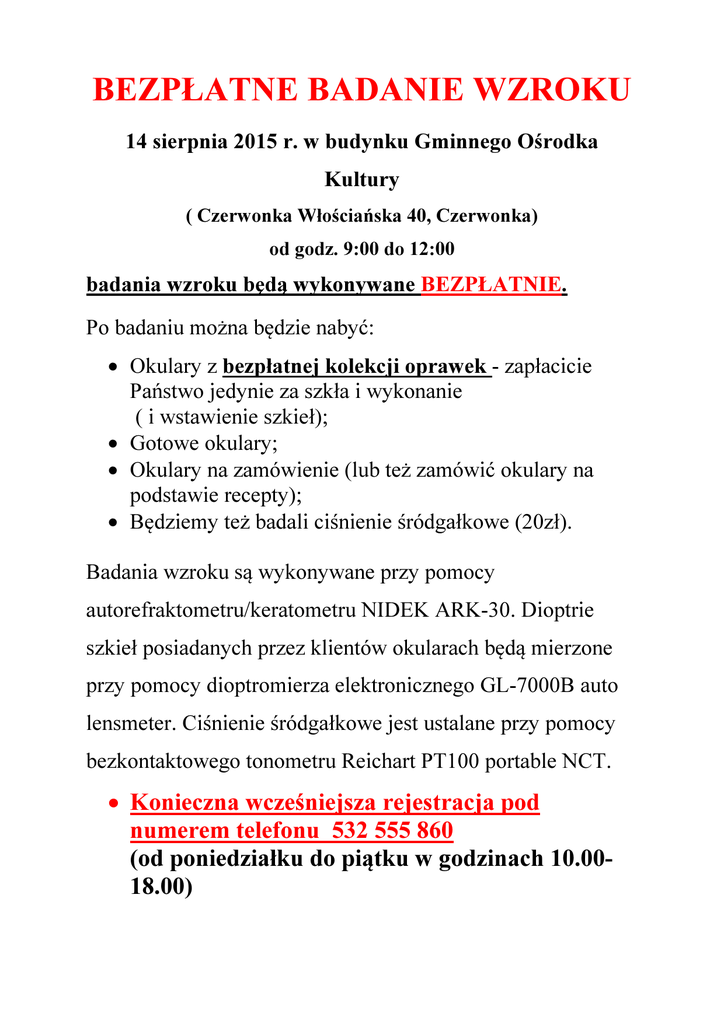 BEZPŁATNE BADANIE WZROKU 14 sierpnia 2015 r. w budynku Gminnego Ośrodka Kultury ( Czerwonka Włościańska 40, Czerwonka) od godz. 9:00 do 12:00 badania wzroku będą wykonywane BEZPŁATNIE. Po badaniu można będzie nabyć: • Okulary z bezpłatnej kolekcji oprawek - zapłacicie Państwo jedynie za szkła i wykonanie ( i wstawienie szkieł); • Gotowe okulary; • Okulary na zamówienie (lub też zamówić okulary na podstawie recepty); • Będziemy też badali ciśnienie śródgałkowe (20zł). Badania wzroku są wykonywane przy pomocy autorefraktometru/keratometru NIDEK ARK-30. Dioptrie szkieł posiadanych przez klientów okularach będą mierzone przy pomocy dioptromierza elektronicznego GL-7000B auto lensmeter. Ciśnienie śródgałkowe jest ustalane przy pomocy bezkontaktowego tonometru Reichart PT100 portable NCT. • Konieczna wcześniejsza rejestracja pod numerem telefonu 532 555 860 (od poniedziałku do piątku w godzinach 10.0018.00)