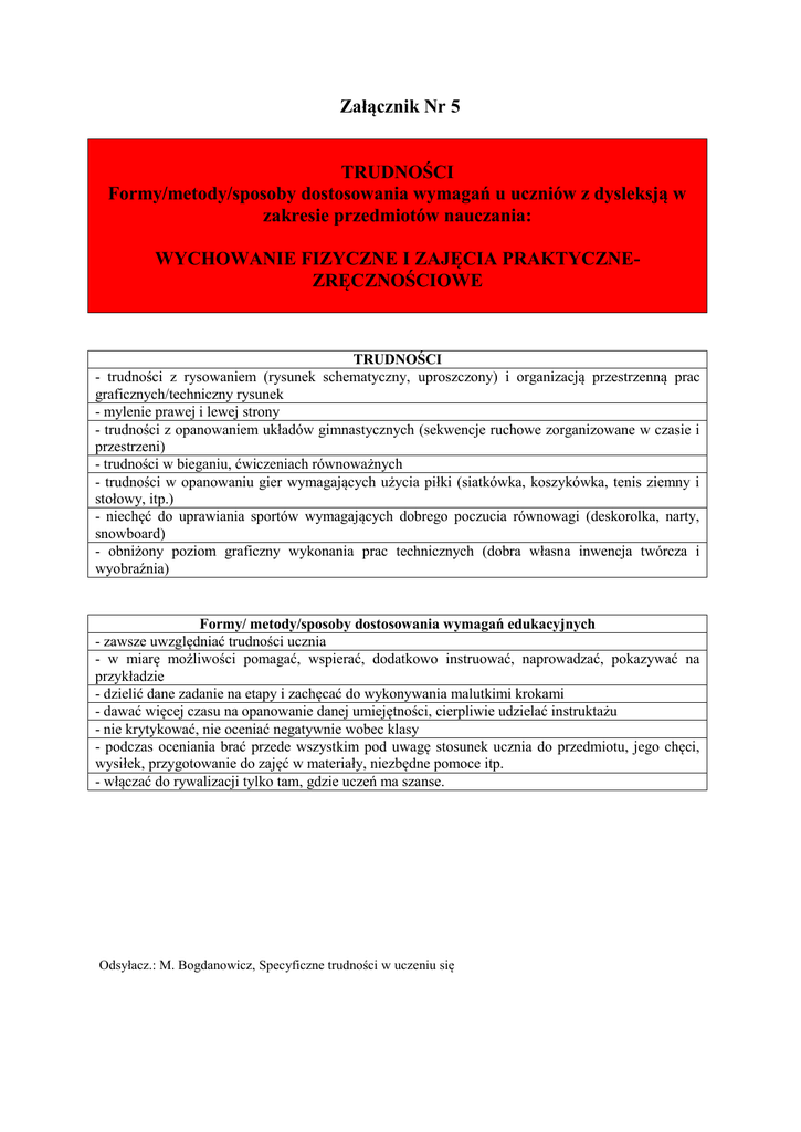 Załącznik Nr 5 TRUDNOŚCI Formy/metody/sposoby dostosowania wymagań u uczniów z dysleksją w zakresie przedmiotów nauczania: WYCHOWANIE FIZYCZNE I ZAJĘCIA PRAKTYCZNEZRĘCZNOŚCIOWE TRUDNOŚCI - trudności z rysowaniem (rysunek schematyczny, uproszczony) i organizacją przestrzenną prac graficznych/techniczny rysunek - mylenie prawej i lewej strony - trudności z opanowaniem układów gimnastycznych (sekwencje ruchowe zorganizowane w czasie i przestrzeni) - trudności w bieganiu, ćwiczeniach równoważnych - trudności w opanowaniu gier wymagających użycia piłki (siatkówka, koszykówka, tenis ziemny i stołowy, itp.) - niechęć do uprawiania sportów wymagających dobrego poczucia równowagi (deskorolka, narty, snowboard) - obniżony poziom graficzny wykonania prac technicznych (dobra własna inwencja twórcza i wyobraźnia) Formy/ metody/sposoby dostosowania wymagań edukacyjnych - zawsze uwzględniać trudności ucznia - w miarę możliwości pomagać, wspierać, dodatkowo instruować, naprowadzać, pokazywać na przykładzie - dzielić dane zadanie na etapy i zachęcać do wykonywania malutkimi krokami - dawać więcej czasu na opanowanie danej umiejętności, cierpliwie udzielać instruktażu - nie krytykować, nie oceniać negatywnie wobec klasy - podczas oceniania brać przede wszystkim pod uwagę stosunek ucznia do przedmiotu, jego chęci, wysiłek, przygotowanie do zajęć w materiały, niezbędne pomoce itp. - włączać do rywalizacji tylko tam, gdzie uczeń ma szanse. Odsyłacz.: M. Bogdanowicz, Specyficzne trudności w uczeniu się