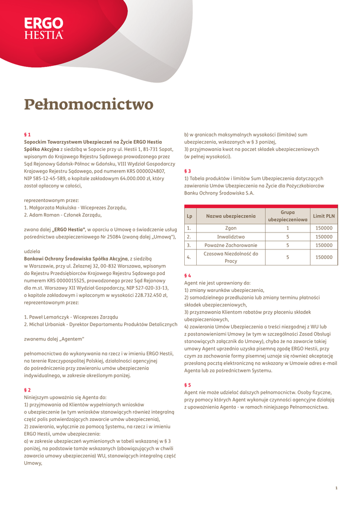 Pełnomocnictwo §1 Sopockim Towarzystwem Ubezpieczeń na Życie ERGO Hestia Spółka Akcyjna z siedzibą w Sopocie przy ul. Hestii 1, 81-731 Sopot, wpisanym do Krajowego Rejestru Sądowego prowadzonego przez Sąd Rejonowy Gdańsk-Północ w Gdańsku, VIII Wydział Gospodarczy Krajowego Rejestru Sądowego, pod numerem KRS 0000024807, NIP 585-12-45-589, o kapitale zakładowym 64.000.000 zł, który został opłacony w całości, reprezentowanym przez: 1. Małgorzata Makulska - Wiceprezes Zarządu, 2. Adam Roman - Członek Zarządu, zwana dalej „ERGO Hestia”, w oparciu o Umowę o świadczenie usług pośrednictwa ubezpieczeniowego Nr 25084 (zwaną dalej „Umową”), udziela Bankowi Ochrony Środowiska Spółka Akcyjna, z siedzibą w Warszawie, przy ul. Żelaznej 32, 00-832 Warszawa, wpisanym do Rejestru Przedsiębiorców Krajowego Rejestru Sądowego pod numerem KRS 0000015525, prowadzonego przez Sąd Rejonowy dla m.st. Warszawy XII Wydział Gospodarczy, NIP 527-020-33-13, o kapitale zakładowym i wpłaconym w wysokości 228.732.450 zł, reprezentowanym przez: 1. Paweł Lemańczyk - Wiceprezes Zarządu 2. Michał Urbaniak - Dyrektor Departamentu Produktów Detalicznych zwanemu dalej „Agentem” pełnomocnictwa do wykonywania na rzecz i w imieniu ERGO Hestii, na terenie Rzeczypospolitej Polskiej, działalności agencyjnej do pośredniczenia przy zawieraniu umów ubezpieczenia indywidualnego, w zakresie określonym poniżej. §2 Niniejszym upoważnia się Agenta do: 1) przyjmowania od Klientów wypełnionych wniosków o ubezpieczenie (w tym wniosków stanowiących również integralną część polis potwierdzających zawarcie umów ubezpieczenia), 2) zawierania, wyłącznie za pomocą Systemu, na rzecz i w imieniu b) w granicach maksymalnych wysokości (limitów) sum ubezpieczenia, wskazanych w § 3 poniżej, 3) przyjmowania kwot na poczet składek ubezpieczeniowych (w pełnej wysokości). §3 1) Tabela produktów i limitów Sum Ubezpieczenia dotyczących zawierania Umów Ubezpieczenia na Życie dla Pożyczkobiorców Banku Ochrony Środowiska S.A. Lp Nazwa ubezpieczenia Grupa ubezpieczeniowa Limit PLN 1. Zgon 1 150000 2. Inwalidztwo 5 150000 3. Poważne Zachorowanie 5 150000 4. Czasowa Niezdolność do Pracy 5 150000 §4 Agent nie jest uprawniony do: 1) zmiany warunków ubezpieczenia, 2) samodzielnego przedłużania lub zmiany terminu płatności składek ubezpieczeniowych, 3) przyznawania Klientom rabatów przy płaceniu składek ubezpieczeniowych, 4) zawierania Umów Ubezpieczenia o treści niezgodnej z WU lub z postanowieniami Umowy (w tym w szczególności Zasad Obsługi stanowiących załącznik do Umowy), chyba że na zawarcie takiej umowy Agent uprzednio uzyska pisemną zgodę ERGO Hestii, przy czym za zachowanie formy pisemnej uznaje się również akceptację przesłaną pocztą elektroniczną na wskazany w Umowie adres e-mail Agenta lub za pośrednictwem Systemu. §5 Agent nie może udzielać dalszych pełnomocnictw. Osoby fizyczne, przy pomocy których Agent wykonuje czynności agencyjne działają z upoważnienia Agenta - w ramach niniejszego Pełnomocnictwa. ERGO Hestii, umów ubezpieczenia: a) w zakresie ubezpieczeń wymienionych w tabeli wskazanej w § 3 poniżej, na podstawie tamże wskazanych (obowiązujących w chwili zawarcia umowy ubezpieczenia) WU, stanowiących integralną część Umowy, 1 §6 Jeżeli Agent posługuje się inną osobą przy wykonywaniu Umowy, ponosi odpowiedzialność za działania lub zaniechania tej osoby jak za własne działania lub zaniechania. Przy wykonywaniu czynności agencyjnych w ramach Umowy Agent zobowiązany jest do posługiwania się tylko i wyłącznie osobami fizycznymi, posiadającymi uprawnienia do wykonywania czynności agencyjnych i wpisanymi do Rejestru Agentów Ubezpieczeniowych; osoby te działają na podstawie upoważnienia Agenta. §7 Terminy użyte w niniejszym Pełnomocnictwie przyjmują znaczenie nadane im w Umowie, w tym w szczególności w WU. §8 1. Pełnomocnictwo niniejsze obowiązuje od dnia 31 marca 2015 r. 2. Pełnomocnictwo może być w każdym czasie odwołane. 3. Pełnomocnictwo nie upoważnia do udzielania dalszych pełnomocnictw. 2 Małgorzata Makulska Adam Roman Wiceprezes Zarządu Członek Zarządu