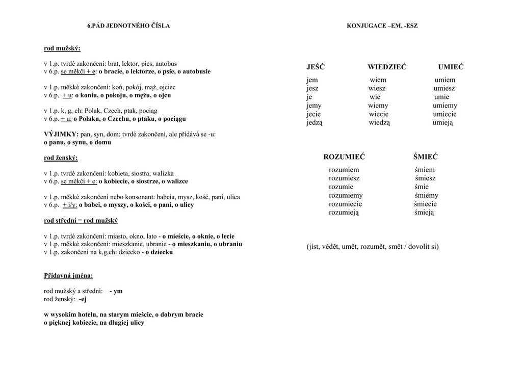 6.PÁD JEDNOTNÉHO ČÍSLA KONJUGACE –EM, -ESZ rod mužský: v 1.p. tvrdé zakončení: brat, lektor, pies, autobus v 6.p. se měkčí + e: o bracie, o lektorze, o psie, o autobusie v 1.p. měkké zakončení: koń, pokój, mąŜ, ojciec v 6.p. + u: o koniu, o pokoju, o męŜu, o ojcu v 1.p. k, g, ch: Polak, Czech, ptak, pociąg v 6.p. + u: o Polaku, o Czechu, o ptaku, o pociągu JEŚĆ WIEDZIEĆ jem jesz je jemy jecie jedzą wiem wiesz wie wiemy wiecie wiedzą UMIEĆ umiem umiesz umie umiemy umiecie umieją VÝJIMKY: pan, syn, dom: tvrdé zakončení, ale přídává se -u: o panu, o synu, o domu rod ženský: v 1.p. tvrdé zakončení: kobieta, siostra, walizka v 6.p. se měkčí + e: o kobiecie, o siostrze, o walizce v 1.p. měkké zakončení nebo konsonant: babcia, mysz, kość, pani, ulica v 6.p. + i/y: o babci, o myszy, o kości, o pani, o ulicy ROZUMIEĆ ŚMIEĆ rozumiem rozumiesz rozumie rozumiemy rozumiecie rozumieją śmiem śmiesz śmie śmiemy śmiecie śmieją rod střední = rod mužský v 1.p. tvrdé zakončení: miasto, okno, lato - o mieście, o oknie, o lecie v 1.p. měkké zakončení: mieszkanie, ubranie - o mieszkaniu, o ubraniu v 1.p. zakončení na k,g,ch: dziecko - o dziecku Přídavná jména: rod mužský a střední: rod ženský: -ej - ym w wysokim hotelu, na starym mieście, o dobrym bracie o pięknej kobiecie, na długiej ulicy (jíst, vědět, umět, rozumět, smět / dovolit si)