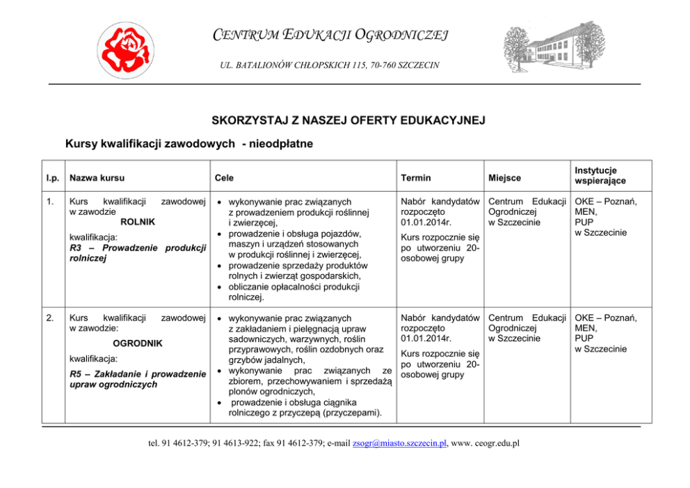 CENTRUM EDUKACJI OGRODNICZEJ UL. BATALIONÓW CHŁOPSKICH 115, 70-760 SZCZECIN SKORZYSTAJ Z NASZEJ OFERTY EDUKACYJNEJ Kursy kwalifikacji zawodowych - nieodpłatne Nazwa kursu Cele Termin 1. Kurs kwalifikacji zawodowej w zawodzie ROLNIK wykonywanie prac związanych z prowadzeniem produkcji roślinnej i zwierzęcej, prowadzenie i obsługa pojazdów, maszyn i urządzeń stosowanych w produkcji roślinnej i zwierzęcej, prowadzenie sprzedaży produktów rolnych i zwierząt gospodarskich, obliczanie opłacalności produkcji rolniczej. Nabór kandydatów Centrum Edukacji OKE – Poznań, rozpoczęto Ogrodniczej MEN, 01.01.2014r. w Szczecinie PUP w Szczecinie Kurs rozpocznie się po utworzeniu 20osobowej grupy wykonywanie prac związanych z zakładaniem i pielęgnacją upraw sadowniczych, warzywnych, roślin przyprawowych, roślin ozdobnych oraz grzybów jadalnych, wykonywanie prac związanych ze zbiorem, przechowywaniem i sprzedażą plonów ogrodniczych, prowadzenie i obsługa ciągnika rolniczego z przyczepą (przyczepami). Nabór kandydatów Centrum Edukacji OKE – Poznań, rozpoczęto Ogrodniczej MEN, 01.01.2014r. w Szczecinie PUP w Szczecinie Kurs rozpocznie się po utworzeniu 20osobowej grupy kwalifikacja: R3 – Prowadzenie produkcji rolniczej 2. Kurs kwalifikacji w zawodzie: zawodowej OGRODNIK kwalifikacja: R5 – Zakładanie i prowadzenie upraw ogrodniczych Miejsce Instytucje wspierające l.p. tel. 91 4612-379; 91 4613-922; fax 91 4612-379; e-mail [email protected], www. ceogr.edu.pl CENTRUM EDUKACJI OGRODNICZEJ UL. BATALIONÓW CHŁOPSKICH 115, 70-760 SZCZECIN 3. Kurs kwalifikacji w zawodzie: zawodowej TECHNIK OGRODNIK Kwalifikacja: R 18 – Planowanie i organizacja prac ogrodniczych (dla kandydatów posiadających kwalifikację R5) planowanie i wykonywanie prac związanych z zakładaniem, pielęgnacją upraw ogrodniczych oraz zbiorem, przechowywaniem produktów ogrodniczych, przygotowaniem do sprzedaży i sprzedażą produktów ogrodniczych, prowadzenie i obsługa ciągnika rolniczego z przyczepą (przyczepami), planowanie i zakładanie terenów zieleni, projektowanie i wykonywanie dekoracji roślinnych. Nabór kandydatów Centrum Edukacji OKE – Poznań, rozpoczęto Ogrodniczej MEN, 01.01.2014r. w Szczecinie PUP w Szczecinie. Kurs rozpocznie się po utworzeniu 20osobowej grupy tel. 91 4612-379; 91 4613-922; fax 91 4612-379; e-mail [email protected], www. ceogr.edu.pl CENTRUM EDUKACJI OGRODNICZEJ UL. BATALIONÓW CHŁOPSKICH 115, 70-760 SZCZECIN Kursy kompetencji zawodowych - odpłatne Miejsce Instytucje wspierające l.p. Nazwa kursu Cele Termin 1. Kurs florystyczny stopnia pierwszego - część teoretyczna – 25 godzin - część praktyczna – 80 godzin wykonywanie dekoracji roślinnych ślubnych, żałobnych, okolicznościowych, projektowanie florystyki komercyjnej szeroko rozumianej. Kurs rozpocznie Centrum Edukacji MEN, się po utworzeniu Ogrodniczej ZUT w Szczecinie 15-osobowej grupy w Szczecinie 2. Kurs projektowania terenów zieleni - część teoretyczna – 110 godzin - część praktyczna – 70 godzin Kurs rozpocznie Centrum Edukacji MEN, nabycie nowych umiejętności się po utworzeniu Ogrodniczej ZUT w Szczecinie zawodowych z zakresu architektury 15-osobowej grupy w Szczecinie krajobrazu, pogłębienie wiedzy botanicznej, ogrodniczej i projektowej, zagospodarowanie zielenią wybranego terenu. 3. Kurs z zakresu nauki szczepienia i okulizacji roślin - część teoretyczna – 10 godzin - część praktyczna – 11 godzin poznanie metod i technik szczepienia i okulizacji, ochrona, pielęgnacja i nawożenie okulantów i szczepów w pierwszym i drugim roku produkcji. Kurs rozpocznie Centrum Edukacji się po utworzeniu Ogrodniczej 20-osobowej grupy w Szczecinie OFERUJEMY UPRAWNIENIA, KTÓRYCH INNI CI NIE DADZĄ tel. 91 4612-379; 91 4613-922; fax 91 4612-379; e-mail [email protected], www. ceogr.edu.pl CENTRUM EDUKACJI OGRODNICZEJ UL. BATALIONÓW CHŁOPSKICH 115, 70-760 SZCZECIN Kursy i szkolenia - odpłatne l.p. Nazwa kursu Cele Termin Miejsce 1. Kurs prawa jazdy kategorii B uzyskanie dodatkowych uprawnień wrzesień 2013r. - Centrum Edukacji WORD i kwalifikacji zawodowych niezbędnych na czerwiec 2014r. Ogrodniczej w Szczecinie rynku pracy w Szczecinie 2. Kurs prawa jazdy kategorii T uzyskanie dodatkowych uprawnień wrzesień 2013r. – Centrum Edukacji WORD i kwalifikacji zawodowych niezbędnych na czerwiec 2014r. Ogrodniczej w Szczecinie rynku pracy w Szczecinie 3. Szkolenie z zakresu stosowania uzyskanie dodatkowych uprawnień nabór kandydatów Centrum Edukacji WIORiN środków ochrony roślin sprzętem i kwalifikacji zawodowych niezbędnych na od 01.01.2014r., Ogrodniczej w Koszalinie naziemnym rynku pracy kurs rozpocznie się w Szczecinie po utworzeniu 25-osobowej grupy NIE CZEKAJ - PRZYJDŹ - ZOBACZ - ZOSTAŃ tel. 91 4612-379; 91 4613-922; fax 91 4612-379; e-mail [email protected], www. ceogr.edu.pl Instytucje wspierające
