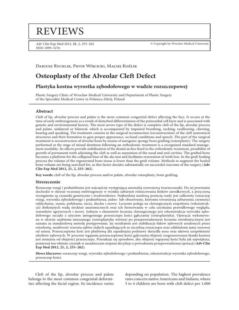 reviews Adv Clin Exp Med 2012, 21, 2, 255–262 ISSN 1899–5276 © Copyright by Wroclaw Medical University Dariusz Rychlik, Piotr Wójcicki, Maciej Koźlik Osteoplasty of the Alveolar Cleft Defect Plastyka kostna wyrostka zębodołowego w wadzie rozszczepowej Plastic Surgery Clinic of Wroclaw Medical University and Department of Plastic Surgery of the Specialist Medical Center in Polanica Zdrój, Poland Abstract Cleft of lip, alveolar process and palate is the most common congenital defect affecting the face. It occurs at the time of early embryogenesis as a result of disturbed differentiation of the primordial cell layer and is associated with genetic and environmental factors. The most severe type of the defect is complete cleft of the lip, alveolar process and palate, unilateral or bilateral, which is accompanied by impaired breathing, sucking, swallowing, chewing, hearing and speaking. The treatment consists in the surgical reconnection (reconstruction) of the cleft anatomical structures and their formation to gain proper appearance, occlusal conditions and speech. The part of the surgical treatment is reconstruction of alveolar bone by means of autogenic spongy bone grafting (osteoplasty). The surgery performed at the stage of mixed dentition following an orthodontic treatment is a recognized standard management modality. Its effects provide stabilization of the dental arches fixed in the orthodontic treatment, possibility of growth of permanent teeth adjoining the cleft as well as separation of the nasal and oral cavities. The grafted bone becomes a platform for the collapsed base of the ala nasi and facilitates restoration of teeth loss. In the graft healing process the volume of the regenerated bone tissue is lower than the graft volume. Methods to augment the healed bone volume are being searched for, as this factor decides substantially on successful outcome of the surgery (Adv Clin Exp Med 2012, 21, 2, 255–262). Key words: cleft of the lip, alveolar process and/or palate, alveolar osteoplasty, bone grafting. Streszczenie Rozszczep wargi i podniebienia jest najczęściej występującą anomalią rozwojową twarzoczaszki. Do jej powstania dochodzi w okresie wczesnej embriogenezy w wyniku zaburzeń różnicowania listków zarodkowych, a przyczyną wystąpienia są czynniki genetyczne i środowiskowe. Najbardziej nasiloną postacią wady jest całkowity rozszczep wargi, wyrostka zębodołowego i podniebienia, jedno- lub obustronny, któremu towarzyszą zaburzenia czynności oddychania, ssania, połykania, żucia, słuchu i mowy. Leczenie polega na chirurgicznym zespoleniu (rekonstrukcji) dotkniętych wadą struktur anatomicznych oraz ich formowaniu w celu uzyskania prawidłowego wyglądu, warunków zgryzowych i mowy. Jednym z elementów leczenia chirurgicznego jest rekonstrukcja wyrostka zębodołowego szczęki z użyciem autogennego przeszczepu kości gąbczastej (osteoplastyka). Operacja wykonywana w okresie uzębienia mieszanego (osteoplastyka wtórna) po przeprowadzonym leczeniu ortodontycznym jest uznana za standardową metodę postępowania. Jej rezultatem jest stabilizacja łuków zębowych ustalonych przez ortodontę, możliwość wzrostu zębów stałych sąsiadujących ze szczeliną rozszczepu oraz oddzielenie jamy nosowej od ustnej. Przeszczepiona kość jest platformą dla zapadniętej podstawy skrzydła nosa oraz ułatwia uzupełnienie ubytków zębowych. W procesie wgajania przeszczepionej kości gąbczastej objętość zregenerowanej tkanki kostnej jest mniejsza od objętości przeszczepu. Poszukuje się sposobów, aby objętość wgojonej kości była jak największa, ponieważ ten właśnie czynnik w zasadniczym stopniu decyduje o powodzeniu przeprowadzonej operacji (Adv Clin Exp Med 2012, 21, 2, 255–262). Słowa kluczowe: rozszczep wargi, wyrostka zębodołowego i podniebienia, rekonstrukcja wyrostka zębodołowego, przeszczep kości. Cleft of the lip, alveolar process and palate belongs to the most common congenital deformities affecting the facial region. Its incidence varies depending on population. The highest prevalence rates concern native Americans and Indians, where 3 to 4 children are born with cleft defect per 1,000 256 D. Rychlik, P. Wójcicki, M. Koźlik births. In Caucasians, the defect occurs less often and affects 1 to 2 newborns per 1,000 births. It is more common in males, with the prevalence ratio of 3:2 [1]. The etiology of the deformity is believed to be multifactorial, i.e. the incidence of the defect is associated with a cumulative effect of numerous genes and environmental factors [2–4]. The causative role of genetic factors is confirmable in about 20% of cases, and the exogenous factors, such as nutritional deficits, hormonal and metabolic disturbances, immunological, infectious, chemical and drug effects, in only about 10% of cases [5]. Restoration of the anatomical continuity of the cleft structures and their normal functioning is a complex and multistage procedure and it requires the cooperation of a surgeon, orthodontist, phoniatrist, otolaryngologist, speech therapist, pediatrician and dentist. The treatment starts after birth, continues throughout the whole developmental period, and often is prolongs into adulthood. Final evaluation of the outcomes of therapy is possible after termination of the child’s development. The so-called therapeutic protocols still differ, which results in a multitude of surgical modalities and therapeutic programs: Randall [6], Millard [7], Skoog [8], Langenbeck [9], Veau [10], Wardill [11], Schweckendieck [12], Kobus [13–16], Malek and Psaume [17], Malek [18] and Perco [19]. In Poland there are 600 to 900 new cleft cases a year. Full severity defects – unilateral or bilateral complete clefts of the lip, alveolar process and palate associated with disturbances in the respiratory function and impairment of sucking, swallowing, chewing, hearing and speech constitute 40% of them [1]. Morphology of
