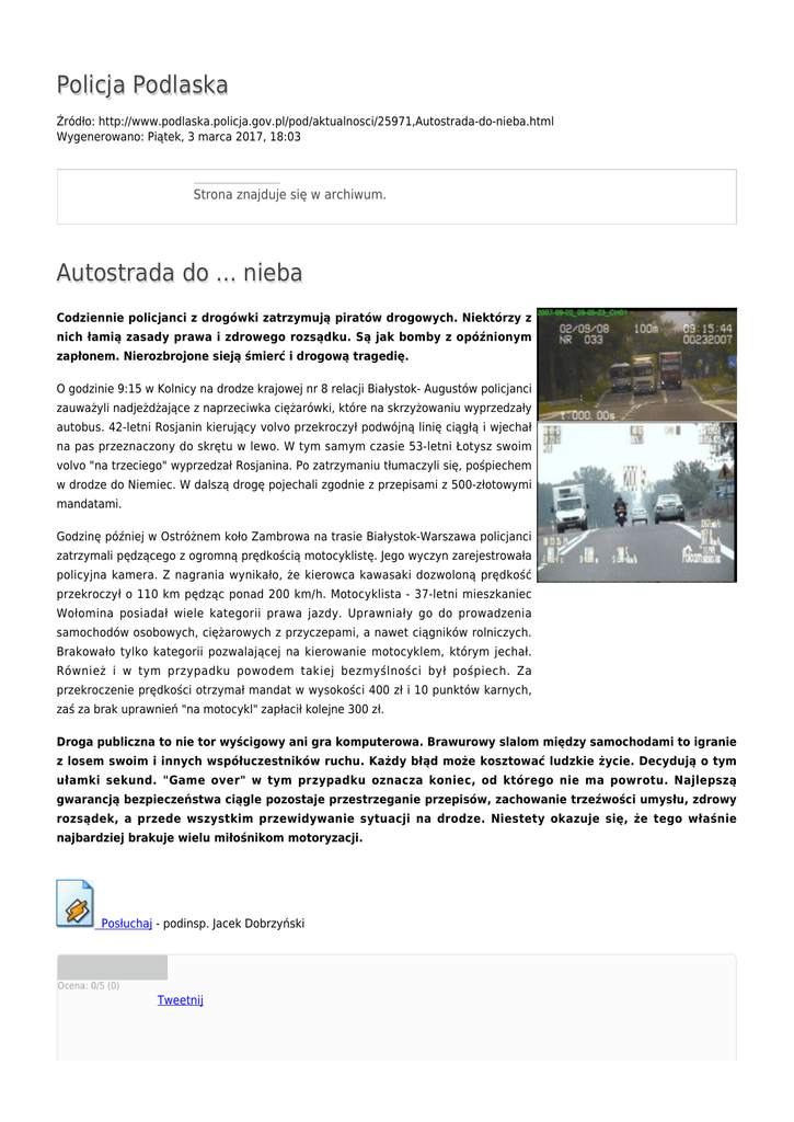 Policja Podlaska Źródło: http://www.podlaska.policja.gov.pl/pod/aktualnosci/25971,Autostrada-do-nieba.html Wygenerowano: Piątek, 3 marca 2017, 18:03 Strona znajduje się w archiwum. Autostrada do ... nieba Codziennie policjanci z drogówki zatrzymują piratów drogowych. Niektórzy z nich łamią zasady prawa i zdrowego rozsądku. Są jak bomby z opóźnionym zapłonem. Nierozbrojone sieją śmierć i drogową tragedię. O godzinie 9:15 w Kolnicy na drodze krajowej nr 8 relacji Białystok- Augustów policjanci zauważyli nadjeżdżające z naprzeciwka ciężarówki, które na skrzyżowaniu wyprzedzały autobus. 42-letni Rosjanin kierujący volvo przekroczył podwójną linię ciągłą i wjechał na pas przeznaczony do skrętu w lewo. W tym samym czasie 53-letni Łotysz swoim volvo "na trzeciego" wyprzedzał Rosjanina. Po zatrzymaniu tłumaczyli się, pośpiechem w drodze do Niemiec. W dalszą drogę pojechali zgodnie z przepisami z 500-złotowymi mandatami. Godzinę później w Ostróżnem koło Zambrowa na trasie Białystok-Warszawa policjanci zatrzymali pędzącego z ogromną prędkością motocyklistę. Jego wyczyn zarejestrowała policyjna kamera. Z nagrania wynikało, że kierowca kawasaki dozwoloną prędkość przekroczył o 110 km pędząc ponad 200 km/h. Motocyklista - 37-letni mieszkaniec Wołomina posiadał wiele kategorii prawa jazdy. Uprawniały go do prowadzenia samochodów osobowych, ciężarowych z przyczepami, a nawet ciągników rolniczych. Brakowało tylko kategorii pozwalającej na kierowanie motocyklem, którym jechał. Również i w tym przypadku powodem takiej bezmyślności był pośpiech. Za przekroczenie prędkości otrzymał mandat w wysokości 400 zł i 10 punktów karnych, zaś za brak uprawnień "na motocykl" zapłacił kolejne 300 zł. Droga publiczna to nie tor wyścigowy ani gra komputerowa. Brawurowy slalom między samochodami to igranie z losem swoim i innych współuczestników ruchu. Każdy błąd może kosztować ludzkie życie. Decydują o tym ułamki sekund. "Game over" w tym przypadku oznacza koniec, od którego nie ma powrotu. Najlepszą gwarancją bezpieczeństwa ciągle pozostaje przestrzeganie przepisów, zachowanie trzeźwości umysłu, zdrowy rozsądek, a przede wszystkim przewidywanie sytuacji na drodze. Niestety okazuje się, że tego właśnie najbardziej brakuje wielu miłośnikom motoryzacji. Posłuchaj - podinsp. Jacek Dobrzyński Ocena: 0/5 (0) Tweetnij