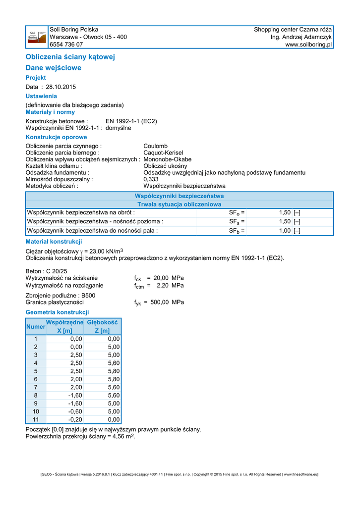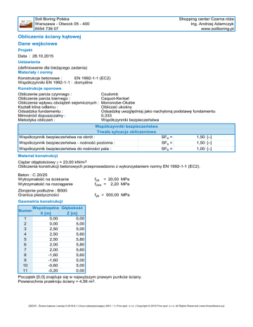 Soli Boring Polska Warszawa - Otwock 05 - 400 6554 736 07 Shopping center Czarna róża Ing. Andrzej Adamczyk www.soilboring.pl Obliczenia ściany kątowej Dane wejściowe Projekt Data : 28.10.2015 Ustawienia (definiowanie dla bieżącego zadania) Materiały i normy Konstrukcje betonowe : EN 1992-1-1 (EC2) Współczynniki EN 1992-1-1 : domyślne Konstrukcje oporowe Obliczenie parcia czynnego : Obliczenie parcia biernego : Obliczenia wpływu obciążeń sejsmicznych : Kształt klina odłamu : Odsadzka fundamentu : Mimośród dopuszczalny : Metodyka obliczeń : Coulomb Caquot-Kerisel Mononobe-Okabe Obliczać ukośny Odsadzkę uwzględniaj jako nachyloną podstawę fundamentu 0,333 Współczynniki bezpieczeństwa Współczynniki bezpieczeństwa Trwała sytuacja obliczeniowa Współczynnik bezpieczeństwa na obrót : SFo = 1,50 [–] Współczynnik bezpieczeństwa - nośność pozioma : SFs = 1,50 [–] Współczynnik bezpieczeństwa do nośności pala : SFb = 1,00 [–] Materiał konstrukcji Ciężar objętościowy g = 23,00 kN/m3 Obliczenia konstrukcji betonowych przeprowadzono z wykorzystaniem normy EN 1992-1-1 (EC2). Beton : C 20/25 Wytrzymałość na ściskanie Wytrzymałość na rozciąganie fck = 20,00 MPa fctm = 2,20 MPa Zbrojenie podłużne : B500 Granica plastyczności fyk = 500,00 MPa Geometria konstrukcji Numer 1 2 3 4 5 6 7 8 9 10 11 Współrzędne Głębokość X [m] Z [m] 0,00 0,00 0,00 5,00 2,50 5,00 2,50 5,60 2,50 5,80 2,00 5,80 2,00 5,60 -1,60 5,60 -1,60 5,00 -0,60 5,00 -0,20 0,00 Początek [0,0] znajduje się w najwyższym prawym punkcie ściany. Powierzchnia przekroju ściany = 4,56 m2. [GEO5 - Ściana kątowa | wersja 5.2016.8.1 | klucz zabezpieczający 4001 / 1 | Fine spol. s r.o. | Copyright © 2015 Fine spol. s r.o. All Rights Reserved | www.finesoftware.eu] Soli Boring Polska Warszawa - Otwock 05 - 400 6554 736 07 Shopping center Czarna róża Ing. Andrzej Adamczyk www.soilboring.pl Nazwa : Geometria Faza - obliczenia : 1 - 0 0,20 5,00 12,50:1 5,60 5,80 1,00 2,50 0,60 0,80 0,50 4,10 Podstawowe parametry gruntów Nr Nazwa Szrafura jef cef g gsu [°] [kPa] [kN/m3] [kN/m3] d [°] 1 Soil No. 1 29,00 10,00 19,00 9,00 15,00 2 Soil No. 2 31,50 0,00 17,50 7,50 15,00 3 Soil No. 3 27,00 10,00 19,50 9,50 15,00 W obliczeniach parcia spoczynkowego wszystkie grunty przyjęte zostały jako niespoiste. Parametry gruntu Soil No. 1 Ciężar objętościowy : Stan naprężeń : Kąt tarcia wewnętrznego : Spójność gruntu : Kąt tarcia konstrukcja-grunt : Grunt : Ciężar gruntu nawodn. : g = 19,00 kN/m3 efektywne jef = 29,00 ° cef = 10,00 kPa d = 15,00 ° niespoisty gsat = 19,00 kN/m3 Soil No. 2 Ciężar objętościowy : Stan naprężeń : Kąt tarcia wewnętrznego : Spójność gruntu : Kąt tarcia konstrukcja-grunt : Grunt : Ciężar gruntu nawodn. : g = 17,50 kN/m3 efektywne jef = 31,50 ° cef = 0,00 kPa d = 15,00 ° niespoisty gsat = 17,50 kN/m3 [GEO5 - Ściana kątowa | wersja 5.2016.8.1 | klucz zabezpieczający 4001 / 1 | Fine spol. s r.o. | Copyright © 2015 Fine spol. s r.o. All Rights Reserved | www.finesoftware.eu] Soli Boring Polska Warszawa - Otwock 05 - 400 6554 736 07 Soil No. 3 Ciężar objętościowy : Stan naprężeń : Kąt tarcia wewnętrznego : Spójność gruntu : Kąt tarcia konstrukcja-grunt : Grunt : Ciężar gruntu nawodn. : Shopping center Czarna róża Ing. Andrzej Adamczyk www.soilboring.pl g = 19,50 kN/m3 efektywne jef = 27,00 ° cef = 10,00 kPa d = 15,00 ° niespoisty gsat = 19,50 kN/m3 Profil geologiczny i przyporządkowane grunty Nr Warstwa [m] Przyporządkowany grunt 1 2,30 Soil No. 1 2 1,70 Soil No. 2 3 - Szrafura Soil No. 3 Nazwa : Profil i przyporządkowanie Faza - obliczenia : 1 - 0 Fundament Typ fundamentu : grunt - z profilu geologicznego Kształt terenu Teren za konstrukcją jest płaski. Wpływ wody Zwierciadło wody gruntowej znajduje się poniżej konstrukcji. Odpór na licu konstrukcji Odpór na licu konstrukcji: spoczynkowe Grunt przed konstrukcją - Soil No. 1 Miąższość gruntu przed konstrukcją h = 0,50 m [GEO5 - Ściana kątowa | wersja 5.2016.8.1 | klucz zabezpieczający 4001 / 1 | Fine spol. s r.o. | Copyright © 2015 Fine spol. s r.o. All Rights Reserved | www.finesoftware.eu] Soli Boring Polska Warszawa - Otwock 05 - 400 6554 736 07 Shopping center Czarna róża Ing. Andrzej Adamczyk www.soilboring.pl Teren przed konstrukcją jest płaski. Zdefiniowane siły oddziaływujące na konstrukcję Numer 1 Siła Nazwa nowa Edycja Tak Force No. 1 Oddziaływ. stałe Fx [kN/m] -30,00 Fz [kN/m] 0,00 M [kNm/m] 0,00 x [m] -0,10 z [m] -0,20 Ustawienia obliczeń fazy Sytuacja obliczeniowa : trwała Ściana może się przesuwać, w obliczeniach przyjęto obciążenie parciem czynnym gruntu. Analiza Nr 1 Wyznaczone siły oddziałujące na konstrukcję Nazwa Ciężar - ściana Odpór na licu Ciężar - klin odłamu Parcie czynne Force No. 1 Fhor [kN/m] 0,00 -1,22 0,00 84,30 30,00 Miej.Przyłoż. z [m] -1,34 -0,17 -2,00 -1,65 -5,80 Fvert [kN/m] 104,88 0,00 99,17 118,67 0,00 Miej.Przyłoż. x [m] 1,80 0,00 2,44 3,26 1,50 Obliczeniowe współczynnik 1,000 1,000 1,000 1,000 1,000 Sprawdzenie całej ściany Sprawdzenie na obrót Moment utrzymujący Mres = 817,56 kNm/m Moment obracający Movr = 313,07 kNm/m Współczynnik bezpieczeństwa = 2,61 > 1,50 Obrót - ściana SPEŁNIA WYMAGANIA Sprawdzenie na przesuw Siła pozioma utrzymująca Hres = 197,82 kN/m Siła pozioma przesuwająca Hact = 97,21 kN/m Współczynnik bezpieczeństwa = 2,03 > 1,50 Przesuw - ściana SPEŁNIA WYMAGANIA Sprawdzenie ogólne - ŚCIANA SPEŁNIA WYMAGANIA [GEO5 - Ściana kątowa | wersja 5.2016.8.1 | klucz zabezpieczający 4001 / 1 | Fine spol. s r.o. | Copyright © 2015 Fine spol. s r.o. All Rights Reserved | www.finesoftware.eu] Soli Boring Polska Warszawa - Otwock 05 - 400 6554 736 07 Shopping center Czarna róża Ing. Andrzej Adamczyk www.soilboring.pl Nazwa : Analiza Faza - obliczenia : 1 - 1 30,00 99,17 5,60 145,57 5,80 104,88 1,22 +x 4,10 +z Nośność gruntu Siły oddzia