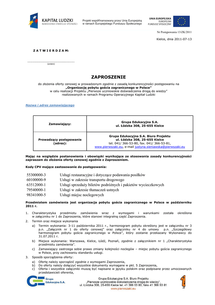 Nr Postępowania 13/ZK/2011 Kielce, dnia 2011-07-13 Z A T W I E R D Z A M: ............................................. (podpis) ZAPROSZENIE do złożenia oferty cenowej w prowadzonym zgodnie z zasadą konkurencyjności postępowaniu na „Organizację pobytu gościa zagranicznego w Polsce” w celu realizacji Projektu „Pierwsze uczniowskie doświadczenia drogą do wiedzy” realizowanych w ramach Programu Operacyjnego Kapitał Ludzki Nazwa i adres zamawiającego Zamawiający: Grupa Edukacyjna S.A. ul. Łódzka 308, 25-655 Kielce Prowadzący postępowanie (adres): Grupa Edukacyjna S.A. Biuro Projektu ul. Łódzka 308, 25-655 Kielce tel. 041/ 366-53-80, fax. 041/ 366-53-81, www.pierwszaki.eu, e-mail [email protected] Mając na względzie postanowienia i obowiązki wynikające ze stosowania zasady konkurencyjności zapraszam do złożenia oferty cenowej zgodnie z Zaproszeniem. Kody CPV mające zastosowanie do postępowania: 55300000-3 60100000-9 63512000-1 79540000-1 98341000-5 Usługi restauracyjne i dotyczące podawania posiłków Usługi w zakresie transportu drogowego Usługi sprzedaży biletów podróżnych i pakietów wycieczkowych Usługi w zakresie tłumaczeń ustnych Usługi miejsc noclegowych Przedmiotem zamówienia jest organizacja pobytu gościa zagranicznego w Polsce w październiku 2011 r. 1. Charakterystyka przedmiotu zamówienia wraz z wymogami i warunkami w załączniku nr 1 do Zaproszenia, które stanowi integralną część Zaproszenia. 2. Termin oraz miejsce wykonania 3. została określona a) Termin wykonania: 3-11 października 2011 r., harmonogram pobytu określony jest w załączniku nr 3 p.n. „Załącznik nr 1 do oferty cenowej” oraz załączniku nr 4 do umowy p.n. „Szczegółowy harmonogram pobytu gościa zagranicznego w Polsce”, który zostanie przekazany Wykonawcy do 31.07.2011 r. b) Miejsce wykonania: Warszawa, Kielce, Łódź, Poznań, zgodnie z załącznikiem nr 1 „Charakterystyka przedmiotu zamówienia”. c) Zamawiający zastrzega sobie prawo zmiany kolejności noclegów – miejsc pobytu gościa zagranicznego w Polsce, przy zachowaniu standardu usługi. Sposób sporządzenia oferty: a) b) c) Ofertę należy sporządzić zgodnie z wymogami Zaproszenia, Do oferty należy dołączyć wszystkie dokumenty wymagane w pkt. 5 Zaproszenia, Oferta i wszystkie załączniki muszą być napisane w języku polskim oraz podpisane przez umocowanych przedstawicieli oferenta, Nr Postępowania 13/ZK/2011 d) e) Oferta cenowa może zawierać tylko jedną cenę brutto wyrażoną w PLN, obejmującą wszystkie koszty związane z realizacją przedmiotu zamówienia, Złożenie oferty w sposób niezgodny z powyższymi wymogami skutkuje jej odrzuceniem. 4. Termin związania ofertą upływa po 30 dniach od terminu składania ofert. 5. Zawartość oferty: Wykonawca musi dołączyć do oferty następujące dokumenty i oświadczenia: a) Ofertę cenową (załącznik nr 2) wraz z załącznikiem nr 1 do oferty cenowej (załącznik nr 3), b) Portfolio standardu usługi zawierające prezentacje obiektów hotelowych i gastronomicznych z uwzględnieniem w ofercie CV tłumacza wraz z udokumentowaniem doświadczenia zawodowego w zakresie usług tłumaczeniowych świadczonych dla gości zagranicznych oraz szczegółową informację o busie (marka, model, rok produkcji, pełnym, luksusowym wyposażeniu), c) Odpis z właściwego rejestru albo zaświadczenie o wpisie do ewidencji działalności gospodarczej, jeżeli odrębne przepisy wymagają wpisu do rejestru lub zgłoszenia do ewidencji działalności gospodarczej, d) Szczegółową charakterystykę przedmiotu zamówienia, e) Wykaz zrealizowanych minimum 3 usług o podobnym charakterze do przedmiotu zamówienia (np. organizacja pobytu w Polsce gości zagranicznych, wizyt studyjnych w Polsce gości zagranicznych, wycieczek dla gości zagranicznych w Polsce). Wykaz powinien zawierać: rodzaj usługi i jej opis, dla kogo została wykonana, kiedy została wykonana oraz referencje od zleceniodawców tych usług. f) Aktualna polisa OC na szkody związane z prowadzeniem przedsiębiorstwa o wartości sumy ubezpieczenia nie mniejszej niż 100 tysięcy złotych. Wszelkie koszty związanie ze sporządzeniem oraz złożeniem oferty ponosi Wykonawca, niezależnie od wyniku postępowania. 6. Oferta cenowa musi uwzględniać wszystkie koszty związane z realizacją przedmiotu zamówienia. 7. Projekt umowy nie podlega negocjacji, złożenie oferty jest równoznaczne z akceptacją postanowień umowy. 8. Zamawiający dokona wyboru Wykonawcy, który zaoferuje najniższą cenę. Cena jest jedynym kryterium oceny ofert. 9. W toku dokonywania badania i oceny ofert Zamawiający może żądać udzielenia przez Oferentów wyjaśnień dotyczących treści złożonych przez nich ofert. 10. Oferty należy składać na formularzu oferty cenowej, która stanowi załącznik do zaproszenia w nieprzekraczalnym terminie do dnia 2011-07-21 godzina 10:00 w sekretariacie Biura Projektu w zamkniętych kopertach oznaczonych: „Organizacja pobytu gościa zagranicznego w Polsce” Numer sprawy: 13/ZK/2011 Nie otwierać przed 2011-07-21, godz. 10:00 11. Oferty, które wpłyną po tym terminie nie będą rozpatrywane i zostaną zwrócone bez otwierania. 12. Przedmiotowe Zaproszenie znajduje się na stronie internetowej Zamawiającego. Wykonawca przed złożeniem oferty zobowiązany jest zapoznać się z informacjami umieszczonymi na tej stronie, gdyż wszelkie informacje związane z zapytaniami do przedmiotowego rozpoznania Zamawiający zamieści na tej stronie. 13. Osobami wyznaczonymi do bezpośredniego kontaktowania się z Wykonawcami są: Alojzy Jakóbik - tel. 0-606-206-214 (sprawy formalno-prawne) oraz Justyna Sieniawska – Tel.0-665-055-803 (sprawy merytoryczne). Sporządził Załączniki: 1. Załącznik 2. Załącznik 3. Załącznik 4. Załącznik nr nr nr nr 1 2 3 4 – – – - charakterystyka przedmiotu zamówienia oferta cenowa załącznik nr 1 do oferty cenowej