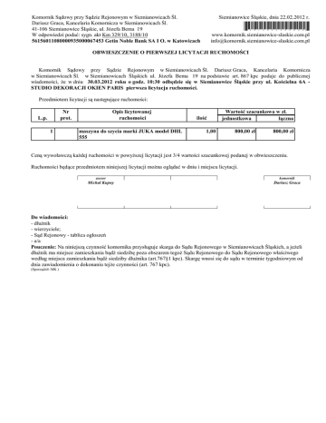 Komornik Sądowy przy Sądzie Rejonowym w Siemianowicach Śl. Dariusz Graca, Kancelaria Komornicza w Siemianowicach Śl. 41-106 Siemianowice Śląskie, ul. Józefa Bema 19 W odpowiedzi podać: sygn. akt Km 329/10, 3188/10 56156011080000935000067453 Getin Noble Bank SA I O. w Katowicach Siemianowice Śląskie, dnia 22.02.2012 r. *3012022200098* www.komornik.siemianowice-slaskie.com.pl [email protected] OBWIESZCZENIE O PIERWSZEJ LICYTACJI RUCHOMOŚCI Komornik Sądowy przy Sądzie Rejonowym w Siemianowicach Śl. Dariusz Graca, Kancelaria Komornicza w Siemianowicach Śl. w Siemianowicach Śląskich ul. Józefa Bema 19 na podstawie art. 867 kpc podaje do publicznej wiadomości, że w dniu 30.03.2012 roku o godz. 10:30 odbędzie się w Siemianowice Śląskie przy ul. Kościelna 6A STUDIO DEKORACJI OKIEN PARIS pierwsza licytacja ruchomości. Przedmiotem licytacji są następujące ruchomości: Nr prot. L.p. 1 Opis licytowanej ruchomości maszyna do szycia marki JUKA model DHL 555 ilość 1,00 Wartość szacunkowa w zł. jednostkowa łączna 800,00 zł 800,00 zł Ceną wywoławczą każdej ruchomości w powyższej licytacji jest 3/4 wartości szacunkowej podanej w obwieszczeniu. Ruchomości będące przedmiotem niniejszej licytacji można oglądać w dniu i miejscu licytacji. asesor komornik Michał Kupny Dariusz Graca Do wiadomości: - dłużnik - wierzyciele; - Sąd Rejonowy - tablica ogłoszeń - a/a Pouczenie: Na niniejszą czynność komornika przysługuje skarga do Sądu Rejonowego w Siemianowicach Śląskich, a jeżeli dłużnik ma miejsce zamieszkania bądź siedzibę poza obszarem tegoż Sądu Rejonowego do Sądu Rejonowego właściwego według miejsca zamieszkania bądź siedziby dłużnika (art.767§1 kpc). Skargę wnosi się do sądu w terminie tygodniowym od dnia zawiadomienia o dokonaniu tejże czynności (art. 767 kpc). (Sporządził: MK )