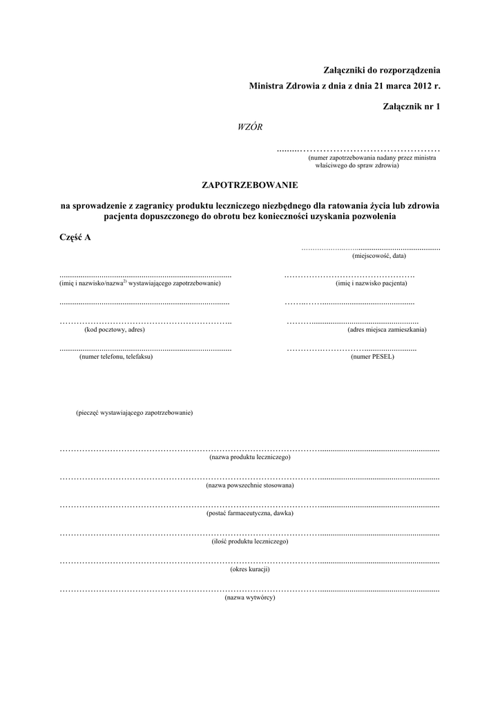 Załączniki do rozporządzenia Ministra Zdrowia z dnia z dnia 21 marca 2012 r. Załącznik nr 1 WZÓR .........…………………………………… (numer zapotrzebowania nadany przez ministra właściwego do spraw zdrowia) ZAPOTRZEBOWANIE na sprowadzenie z zagranicy produktu leczniczego niezbędnego dla ratowania życia lub zdrowia pacjenta dopuszczonego do obrotu bez konieczności uzyskania pozwolenia Część A ……………….……........................................ (miejscowość, data) .................................................................................. (imię i nazwisko/nazwa2) wystawiającego zapotrzebowanie) .………………………………………. (imię i nazwisko pacjenta) ................................................................................. ……..……............................................ …………………………………………………….. ………................................................... (kod pocztowy, adres) (adres miejsca zamieszkania) .................................................................................. ………….……………......................... (numer telefonu, telefaksu) (numer PESEL) (pieczęć wystawiającego zapotrzebowanie) …………………………………………………………………………………......................................................... (nazwa produktu leczniczego) …………………………………………………………………………………......................................................... (nazwa powszechnie stosowana) …………………………………………………………………………………......................................................... (postać farmaceutyczna, dawka) …………………………………………………………………………………......................................................... (ilość produktu leczniczego) …………………………………………………………………………………......................................................... (okres kuracji) …………………………………………………………………………………......................................................... (nazwa wytwórcy) Wystawiający zapotrzebowanie jest świadomy, że wystawia zapotrzebowanie na produkt leczniczy niezbędny dla ratowania życia lub zdrowia pacjenta dopuszczony do obrotu bez konieczności uzyskania pozwolenia. Przedmiotowy produkt leczniczy będzie stosowany na odpowiedzialność wystawiającego zapotrzebowanie. ................................................................................. (podpis i pieczęć lekarza prowadzącego leczenie1)) ………..……………………………………… (podpis i pieczęć kierownika podmiotu leczniczego prowadzącego szpital lub osoby przez niego upoważnionej1)) ............................................... (podpis i pieczęć konsultanta z danej dziedziny medycyny) Załączniki2): 1) Informacja dotycząca choroby pacjenta. 2) Uzasadnienie dotyczące wnioskowanej ilości produktu leczniczego oraz zastosowania produktu leczniczego, którego dotyczy zapotrzebowanie. 3) Lista zawierająca dane pacjentów, których dotyczy zapotrzebowanie oraz ilość produktu leczniczego przeznaczonego dla danego pacjenta. Część B Potwierdzenie przez ministra właściwego do spraw zdrowia ……...................................................... (numer potwierdzenia nadany przez ministra właściwego do spraw zdrowia) 1) potwierdzam, że względem produktu leczniczego nie zaszły okoliczności, o których mowa w art. 4 ust. 3 ustawy z dnia 6 września 2001 r. – Prawo farmaceutyczne2); 2) potwierdzam, że względem produktu leczniczego zaszły okoliczności, o których mowa w art. 4 ust. 3 ustawy z dnia 6 września 2001 r. – Prawo farmaceutyczne, polegające na2): ..................................................................................................................................................................................... ..................................................................................................................................................................................... ………….......... ...................... (miejscowość, data) ________ Część A – wypełnia lekarz prowadzący leczenie. Części B – wypełnia minister właściwy do spraw zdrowia. 1) Wypełnić, jeżeli dotyczy. 2) Niepotrzebne skreślić. ……….………................................................. (podpis i pieczęć ministra właściwego do spraw zdrowia)