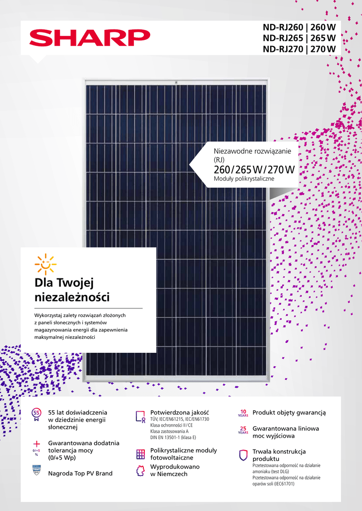 ND-RJ260 | 260 W ND-RJ265 | 265 W ND-RJ270 | 270 W Niezawodne rozwiązanie (RJ) 260 / 265 W / 270 W Moduły polikrystaliczne Dla Twojej niezależności Wykorzystaj zalety rozwiązań złożonych z paneli słonecznych i systemów magazynowania energii dla zapewnienia maksymalnej niezależności 55 lat doświadczenia w dziedzinie energii słonecznej Gwarantowana dodatnia tolerancja mocy (0/+5 Wp) Nagroda Top PV Brand Potwierdzona jakość TÜV, IEC/EN61215, IEC/EN61730 Klasa ochronności II / CE Klasa zastosowania A DIN EN 13501-1 (klasa E) Polikrystaliczne moduły fotowoltaiczne Wyprodukowano w Niemczech Produkt objęty gwarancją Gwarantowana liniowa moc wyjściowa Trwała konstrukcja produktu Przetestowana odporność na działanie amoniaku (test DLG) Przetestowana odporność na działanie oparów soli (IEC61701) ND-RJ265 ND-RJ260 Moc maksymalna Pmax 270 265 260 Wp Napięcie obwodu otwartego Uoc 37,99 37,72 37,45 V Isc 9,15 9,06 8,98 A Napięcie w punkcie maksymalnej mocy Prąd obwodu zamkniętego Umpp 31,29 31,04 30,79 V Natężenie prądu w punkcie maksymalnej mocy Impp 8,70 8,61 8,52 A Wydajność modułu m 16,5 16,2 15,9 % STC = standardowe warunki testowe: oświetlenie 1 000 W/m², AM 1,5, temperatura ogniwa 25 °C. Znamionowe charakterystyki elektryczne zawierają się w zakresie ±10 % wskazywanych wartości Isc, Uoc oraz od 0 do +5 % Pmax (tolerancja mocy ±3 %). Redukcja wydajności przy zmianie oświetlenia z 1000 W/m² na 200 W/m² (Tmodułu = 25°C) jest mniejsza niż 4%. Dane elektryczne (NOCT) ND-RJ270 ND-RJ265 ND-RJ260 Moc maksymalna Pmax 201,4 197,6 193,9 Wp Napięcie obwodu otwartego Uoc 34,96 34,72 34,47 V Prąd obwodu zamkniętego Isc 7,39 7,32 7,25 A Napięcie w punkcie maksymalnej mocy Umpp 28,61 28,39 28,16 V Natężenie prądu w punkcie maksymalnej mocy Impp 7,04 6,96 6,89 A NOCT: temperatura pracy modułu przy naświetleniu 800 W/m², temperaturze powietrza 20 °C, prędkości wiatru 1 m/s. NOCT = 46°C. Dane mechaniczne Wymiary (mm) Długość 1 654 mm Szerokość 989 mm Głębokość 40 mm Masa 18,2 kg Współczynnik temperaturowe Pmax -0,42 %/°C Uoc -0,32 %/°C Isc -0,044 %/°C Wartości graniczne Maksymalne napięcie systemu 1000 V, prąd stały Ochrona przed przepięciami 15 A Zakres temperatury od -40 do +85°C Maksymalne obciążenie mechaniczne (śnieg/wiatr) 2400 Pa Przetestowane obciążenie śniegiem (test wg IEC61215*) 5400 Pa * Szczegóły w instrukcji instalacji modułu Sharp. Informacje ogólne Informacje o opakowaniu Ogniwa polikrystaliczne, 156 mm × 156 mm, 60 ogniw połączonych szeregowo Liczba modułów na paletę 22 szt. Szyba przednia hartowane szkło o niskiej zawartości żelaza (low iron), 3,2 mm Ramka ze stopu anodyzowanego aluminium, srebrna Rozmiar palety (dł. × szer. × wys.) 1,70 m × 1,03 m × 1,25 m Skrzynka podłączeniowa z żywicy PPE+PS, stopień ochrony IP67, 90 × 72 × 16 mm, 3 diody bocznikujące Masa palety 420 kg Przewód Przewód PV1-f, 4,0 mm, długość 1000 mm Złącze MC4 Empower yourself www.sharp.pl Adres kontaktowy firmy Sharp SHARP ELECTRONICS GMBH ENERGY SOLUTIONS NAGELSWEG 33 - 35 20097 HAMBURG NIEMCY TEL.: +49(0)40/2376-2436 FAKS: +49(0)40/2376-2193 Adres kontaktowy instalatora Miejscowy podmiot odpowiedzialny: Benelux [email protected], Francja [email protected], Niemcy [email protected], Polska [email protected] Hiszpania i Portugalia [email protected], Wielka Brytania [email protected], Inne kraje [email protected] Uwaga: Dane techniczne mogą ulec zmianie bez wcześniejszego powiadomienia. Przed wykorzystaniem produktów firmy Sharp należy zamówić najnowsze karty katalogowe firmy Sharp. Firma Sharp nie ponosi odpowiedzialności za uszkodzenia urządzeń wyposażonych w produkty firmy Sharp na podstawie niepotwierdzonych informacji. Dane techniczne mogą nieznacznie różnić się od rzeczywistych parametrów. Instrukcje instalacji i obsługi można znaleźć w odpowiednich podręcznikach lub pobrać ze strony internetowej: www.sharp.eu/solar. Opisywanego modułu nie wolno podłączyć bezpośrednio do obciążenia. ND-RJ270 NDRJ65_12/16PL Dane elektryczne (STC)