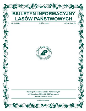 BIULETYN INFORMACYJNY LASÓW PAŃSTWOWYCH Nr 2 (194) LUTY 2009 Dyrekcja Generalna Lasów Państwowych ul. Wawelska 52/54, 00–922 Warszawa tel./fax 0 22 825 85 56 PL ISSN 1428-5940 CENA 5,00 ZŁ DYREKCJA GENERALNA LASÓW PAŃSTWOWYCH ul. Wawelska 52/54, 00–922 Warszawa tel./fax 0 22 825 85 56 Dyrektor generalny Lasów Państwowych – Marian Pigan Sekretariat Dyrektora Generalnego – naczelnik Anna TRZECIAK-WISZOWATA – rzecznik prasowy Lasów Państwowych Anna MALINOWSKA Wydział Kadr i Doskonalenia Zawodowego – naczelnik Agnieszka GRZEGORCZYK Inspekcja Lasów Państwowych – główny inspektor Konrad GRZYBOWSKI Zespół Radców Prawnych – koordynator Marek RATYŃSKI Zespół ds. Obronności i Ochrony Informacji Niejawnych – Mariusz KWIECIŃSKI Główny inspektor Straży Leśnej – Tadeusz Pasternak Stanowisko ds. BHP – główny specjalista Piotr GOTOWICKI Wydział ds. Gospodarki Zasobami Mieszkaniowymi i Lokalowymi – naczelnik Jerzy ŁOKIETKO tel. 0 22 825 60 28 0 22 825 85 70 0 22 825 94 02 0 22 825 54 02 0 22 825 93 09 0 22 825 85 62 0 22 825 85 62 0 22 825 85 62 0 22 825 85 63 0 22 825 99 51 Zastępca dyrektora generalnego LP ds. gospodarki leśnej – Ryszard KAPUŚCIŃSKI Wydział Hodowli i Użytkowania Lasu – naczelnik Wojciech FONDER Wydział Ochrony Lasu – naczelnik Aldona PERLIŃSKA Wydział Ochrony Przyrody – naczelnik Jolanta BŁASIAK Wydział Stanu Posiadania – naczelnik Sławomir SAWICKI Wydział Urządzania Lasu i Geoinformatyki – naczelnik Jacek PRZYPAŚNIAK Stanowisko ds. Łowiectwa – główny specjalista Jan BŁASZCZYK 0 22 825 85 10 0 22 825 09 86 0 22 825 25 27 0 22 825 90 56 w. 254 0 22 825 25 27 0 22 825 85 63 0 22 825 85 62 Zastępca dyrektora generalnego LP ds. marketingu i organizacji – Tomasz WÓJCIK Wydział Marketingu i Handlu – naczelnik Andrzej BALLAUN Wydział Współpracy z Zagranicą – p.o. naczelnika Piotr BORKOWSKI Wydział Rozwoju Organizacyjnego i Technologicznego – naczelnik Jerzy KAPRAL Wydział Informatyki – naczelnik Mariusz BŁASIAK Wydział ds. Zamówień Publicznych – kierownik Alina NIEWIADOMSKA 0 22 825 85 61 0 22 825 85 53 w. 111 0 22 825 99 51 w. 123 0 22 825 85 52 0 22 825 85 51 0 22 825 88 23 Zastępca dyrektora generalnego LP ds. ekonomicznych – Anna PASZKIEWICZ Główny księgowy – Elżbieta GRAJNY-OLBROMSKA Wydział Analiz Ekonomicznych i Planowania – naczelnik Artur KRÓLICKI Wydział Logistyki – naczelnik Walerian ŻYNDUL 0 22 825 85 10 0 22 825 79 29 0 22 825 17 66 0 22 825 85 56 Adresy, telefony i telefaksy Regionalnych Dyrekcji Lasów Państwowych 15–950 BIAŁYSTOK, ul. Lipowa 51 80–804 GDAŃSK, ul. Rogaczewskiego 9/19 40–952 KATOWICE, ul. Huberta 43/45 31–159 KRAKÓW, al. Słowackiego 17a 38–400 KROSNO, ul. Bieszczadzka 2 20–950 LUBLIN, ul. Czechowska 4 91–402 ŁÓDŹ, ul. J. Matejki 16 10–959 OLSZTYN, ul. Kościuszki 46/48 64–920 PIŁA – KALINA 60–815 POZNAŃ, ul. Gajowa 10 26–600 RADOM, ul. 25 Czerwca 68 70–965 SZCZECIN, ul. J. Słowackiego 2 78–400 SZCZECINEK, ul. Mickiewicza 2 87–100 TORUŃ, ul. Mickiewicza 9 03–841 WARSZAWA, ul. Grochowska 278 50–357 WROCŁAW, ul. Grunwaldzka 90 65–950 ZIELONA GÓRA, ul. Kazimierza Wlk. 24 tel. centr. 0 85 748 18 00, fax 0 85 652 23 73 0 58 302 00 71, fax 0 58 302 11 25 0 32 251 43 02 do 04, fax 0 32 251 57 39 0 12 633 54 33, fax 0 12 633 13 51 0 13 436 44 51, fax 0 13 436 43 01 0 81 532 70 31, fax 0 81 532 49 47 0 42 631 79 00, fax 0 42 631 79 82 0 89 527 05 09, fax 0 89 527 21 70 0 67 212 48 44, fax 0 67 212 64 78 0 61 866 82-41,fax 0 61 847 28 69 0 48 385 60 00, fax 0 48 385 60 01 0 91 432 87 00, fax 0 91 422 53 13 0 94 372 63 00, fax: 0 94 372 63 01 0 56 658 43 00, fax 0 56 658 43 66 0 22 517 33 00, fax 0 22 517 33 61 0 71 328 30 11, fax 0 71 328 24 01 0 68 325 44 51, fax 0 68 325 36 30 Zakłady o zasięgu krajowym podporządkowane dyrektorowi generalnemu LP Centrum Informacyjne Lasów Państwowych ul. Bitwy Warszawskiej 1920 r. nr 3, 02–362 Warszawa tel. 0 22 822 49 31 Centrum Koordynacji Projektów Środowiskowych ul. Bitwy Warszawskiej 1920 r. nr 3, 02–362 Warszawa 0 22 356 18 16 Leśny Bank Genów Kostrzyca Miłków 300, 58–535 Miłków 0 75 713 12 39 Ośrodek Kultury Leśnej ul. Działyńskich 2, 63–322 Gołuchów 0 62 761 50 45 Ośrodek Rozwojowo-Wdrożeniowy Lasów Państwowych Bedoń, ul Sienkiewicza 19, 95–020 Andrespol 0 42 677 25 00 Ośrodek Techniki Leśnej ul. Zaciszna 2, 63–200 Jarocin 0 62 747 35 82 Zakład Informatyki Lasów Państwowych Bedoń, ul. Sienkiewicza 19, 95–020 Andrespol 0 42 677 25 45 BIULETYN INFORMACYJNY LASÓW PAŃSTWOWYCH REDAGUJĄ: Sławomir Trzaskowski (redaktor naczelny), Zbigniew Święcicki (redaktor), Karolina Lew-Mirska (skład i opr. tech.) ADRES REDAKCJI: ul. Bitwy Warszawskiej 1920 r., nr 3, 02–362 Warszawa, tel. 0 22 822 49 31, 0 22 822 32 01 w. 515 Numer opublikowano 10.02.2009 r., nakład 1500 egz. SPIS TREŚCI ZARZĄDZENIA I DECYZJE DYREKTORA GENERALNEGO LASÓW PAŃSTWOWYCH (od 1 do 31 stycznia 2009 r.) ........................ ? ZARZĄDZENIA Nr 3 z 22 stycznia 2009 r. w sprawie zasad funkcjonowania i zasad bezpieczeństwa systemu informatycznego w Państwowym Gospodarstwie Leśnym Lasy Państwowe .......................................................................................................................................................................................... 3 Nr 4 z 22 stycznia 2009 r. w sprawie zasad (polityki) rachunkowości Państwowego Gospodarstwa Leśnego Lasy Państwowe i planu kont z komentarzem Państwowego Gospodarstwa Leśnego Lasy Państwowe .............................................................................. 3 Nr 5 z 23 stycznia 2009 r. w sprawie powołania zespołu zadaniowego ds. serwisu merytorycznego systemu informatycznego Lasów Państwowych ...................... 4 Nr 6 z 23 stycznia 2009 r. w sprawie zmiany zarządzenia nr 2 z 2004 r. w sprawie powołania zespołów zadaniowych ds. serwi