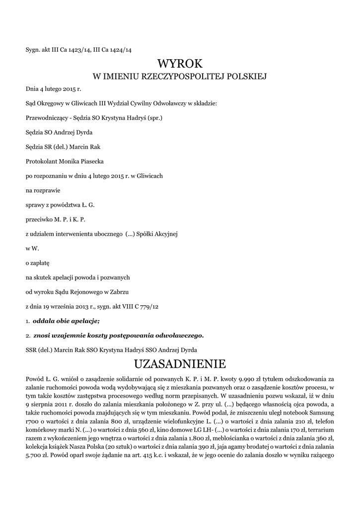 Sygn. akt III Ca 1423/14, III Ca 1424/14 WYROK W IMIENIU RZECZYPOSPOLITEJ POLSKIEJ Dnia 4 lutego 2015 r. Sąd Okręgowy w Gliwicach III Wydział Cywilny Odwoławczy w składzie: Przewodniczący - Sędzia SO Krystyna Hadryś (spr.) Sędzia SO Andrzej Dyrda Sędzia SR (del.) Marcin Rak Protokolant Monika Piasecka po rozpoznaniu w dniu 4 lutego 2015 r. w Gliwicach na rozprawie sprawy z powództwa Ł. G. przeciwko M. P. i K. P. z udziałem interwenienta ubocznego (...) Spółki Akcyjnej w W. o zapłatę na skutek apelacji powoda i pozwanych od wyroku Sądu Rejonowego w Zabrzu z dnia 19 września 2013 r., sygn. akt VIII C 779/12 1. oddala obie apelacje; 2. znosi wzajemnie koszty postępowania odwoławczego. SSR (del.) Marcin Rak SSO Krystyna Hadryś SSO Andrzej Dyrda UZASADNIENIE Powód Ł. G. wniósł o zasądzenie solidarnie od pozwanych K. P. i M. P. kwoty 9.990 zł tytułem odszkodowania za zalanie ruchomości powoda wodą wydobywającą się z mieszkania pozwanych oraz o zasądzenie kosztów procesu, w tym także kosztów zastępstwa procesowego według norm przepisanych. W uzasadnieniu pozwu wskazał, iż w dniu 9 sierpnia 2011 r. doszło do zalania mieszkania położonego w Z. przy ul. (...) będącego własnością ojca powoda, a także ruchomości powoda znajdujących się w tym mieszkaniu. Powód podał, że zniszczeniu uległ notebook Samsung r700 o wartości z dnia zalania 800 zł, urządzenie wielofunkcyjne L. (...) o wartości z dnia zalania 210 zł, telefon komórkowy marki N. (...) o wartości z dnia 560 zł, kino domowe LG LH- (...) o wartości z dnia zalania 170 zł, terrarium razem z wykończeniem jego wnętrza o wartości z dnia zalania 1.800 zł, meblościanka o wartości z dnia zalania 360 zł, kolekcja książek Nasza Polska (20 sztuk) o wartości z dnia zalania 390 zł, jaja agamy brodatej o wartości z dnia zalania 5.700 zł. Powód oparł swoje żądanie na art. 415 k.c. i wskazał, że w jego ocenie do zalania doszło w wyniku rażącego niedbalstwa ze strony pozwanych, polegającego na nieprawidłowym zainstalowaniu wężyka doprowadzającego ciepłą wodę umywalki mieszczącej się w łazience pozwanych. W mieszkaniu pozwanych nie było także zaworu odcinającego dopływ wody. Powód podniósł przy tym, że pozwana K. P. złożyła oświadczenie o przyznaniu się do winy w zakresie spowodowania szkody po stronie R. G. – ojca powoda, a więc tym samym przyznała swoja winę w zakresie szkód powstałych po stronie powoda, tj. zniszczenia ruchomości, które znajdowały się w zalanym mieszkaniu. Pozwani nie złożyli odpowiedzi na pozew, lecz w toku procesu domagali się zawiadomienia o toczącym się procesie (...) S.A. w W. Inspektorat w Z. i wezwania tego podmiotu do wzięcia udziału w sprawie. Pozwani ostatecznie precyzując swoje stanowisko wnieśli o oddalenie powództwa w całości i o zasądzenie kosztów procesu, w tym kosztów zastępstwa procesowego, jako że w ich ocenie nie ponosili oni winy za zalanie mieszkania. Przyznali, że do zalania doszło na skutek pęknięcia wężyka doprowadzającego ciepłą wodę do baterii umywalkowej w ich łazience, jednak zdarzenie to miało charakter losowy i pozwani nie mieli na nie wpływu i nie mogli go przewidzieć. Ponadto wskazali, że ich mieszkanie było wyposażone w sprawny zawód odcinający wodę, a jedynie powód, który podjął się próby jego zakręcenia, robił to w sposób nieprawidłowy. Podnieśli też, że oświadczenie podpisane przez K. P. może stanowić dowód na fakt wystąpienia awarii, której skutkiem było zalanie mieszkania położonego pod ich mieszkaniem, a nie winy pozwanej. (...) S.A. w W. zgłosiła swe przystąpienie do sprawy w charakterze interwenienta ubocznego po stronie pozwanej, wnosząc o oddalenie powództwa i zasądzenie kosztów procesu. Interwenient uboczny zakwestionował odpowiedzialność pozwanych, a tym samym swoją jako ubezpieczyciela co do zasady i wysokości. Ponadto zarzucił, że dołączone do pozwu dowody nie przesądzały do tym, że powód był właścicielem zniszczonych rzeczy. Zwrócił też uwagę, że powód nie dążył do minimalizacji rozmiarów szkody i nie zareagował w sposób skutkujący uniknięciem zalania jaj agamy brodatej. Zaskarżonym wyrokiem Sąd Rejonowy w Zabrzu zasądził od pozwanych solidarnie na rzecz powoda kwotę 1.010 zł; oddalił powództwo w pozostałym zakresie; odstąpił od obciążania powoda kosztami procesu; nakazał pobrać od pozwanych solidarnie na rzecz Skarbu Państwa – Sądu Rejonowego w Zabrzu kwotę 49,50 zł tytułem części nieuiszczonych kosztów sądowych; nieuiszczonymi kosztami sądowymi w pozostałym zakresie obciąża Skarb Państwa – Sąd Rejonowy w Zabrzu. Sąd Rejonowy ustalił, że w dniu 9 sierpnia 2011 r. doszło do zalania mieszkania położonego w Z. przy ul. (...), będącego własnością ojca powoda R. G. i jednocześnie ruchomości znajdujących się w tym mieszkaniu. Powodem powyższego zdarzenia było pęknięcie wężyka doprowadzającego ciepłą wodę znajdującego się pod umywalką w łazience pozwanych. Przedmiotowy wężyk przyłączeniowy został zakupiony ok. 5 lat przed zdarzeniem. W kwietniu 2011 r. pozwani zakupili natomiast nową baterię umywalkową do łazienki, która następnie została zamontowana przez pozwanego M. P.. Pozwany nie wymienił wtedy na nowe wężyków doprowadzających wodę, gdyż te z zestawu były za krótkie, a ponadto pozwany ocenił, że stan starych wężyków był jeszcze dobry. Około miesiąc przed wymianą baterii umywalkowej, pracownicy administracji wymienili w łazience pozwanych wodomierz na nowy. W trakcie tych prac ułamali rączkę zaworu odcinającego dopływ ciepłej wody. Sąd pierwszej instancji ustalił, nadto iż wypływ wody w dniu 9 sierpnia 2011 r. został zauważony między godz. 2 a 3 w nocy przez powoda. Wobec powyższego powód niezwłocznie zrelacjonował sytuację pozwanej K. P., która tej nocy była sama w dom