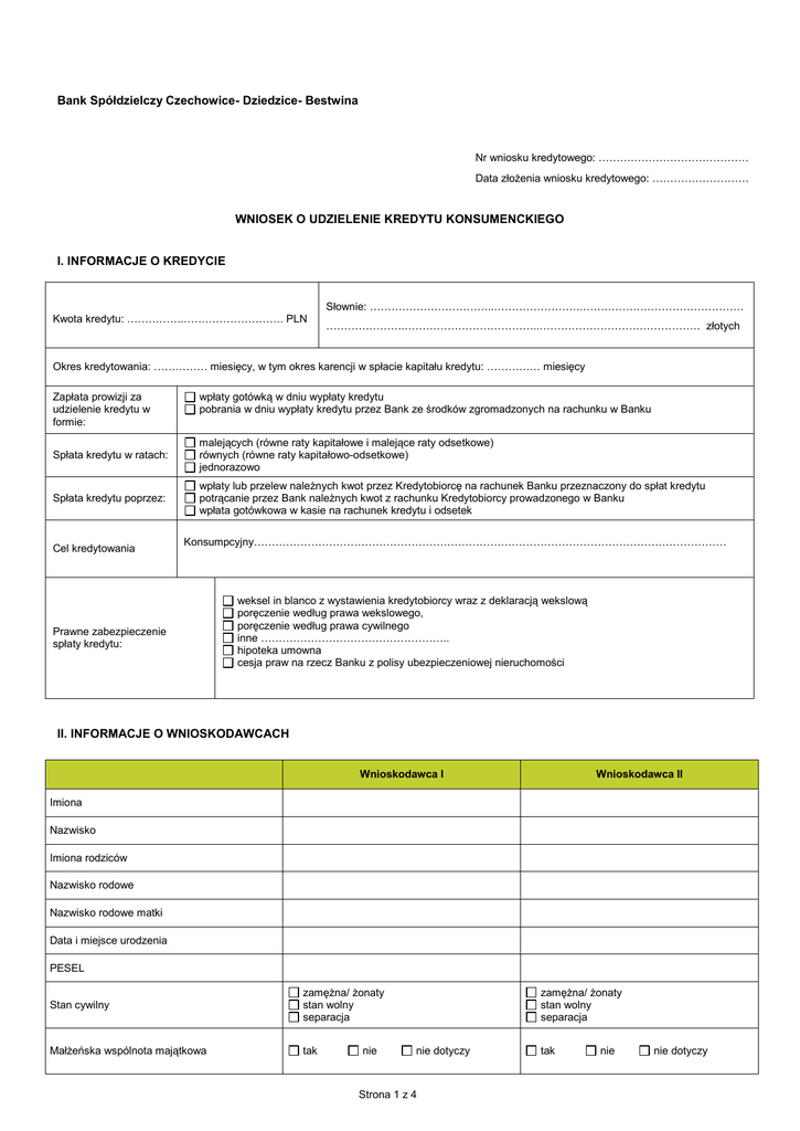 Bank Spółdzielczy Czechowice- Dziedzice- Bestwina Nr wniosku kredytowego: …………………………………… Data złożenia wniosku kredytowego: ……………………… WNIOSEK O UDZIELENIE KREDYTU KONSUMENCKIEGO I. INFORMACJE O KREDYCIE Słownie: ……………………………..…………………….……………………………………… Kwota kredytu: …………….………………………. PLN ………………….………………………………..……………………………………… złotych Okres kredytowania: …………… miesięcy, w tym okres karencji w spłacie kapitału kredytu: …………… miesięcy Zapłata prowizji za udzielenie kredytu w formie: wpłaty gotówką w dniu wypłaty kredytu pobrania w dniu wypłaty kredytu przez Bank ze środków zgromadzonych na rachunku w Banku Spłata kredytu w ratach: malejących (równe raty kapitałowe i malejące raty odsetkowe) równych (równe raty kapitałowo-odsetkowe) jednorazowo Spłata kredytu poprzez: wpłaty lub przelew należnych kwot przez Kredytobiorcę na rachunek Banku przeznaczony do spłat kredytu potrącanie przez Bank należnych kwot z rachunku Kredytobiorcy prowadzonego w Banku wpłata gotówkowa w kasie na rachunek kredytu i odsetek Cel kredytowania Konsumpcyjny…………………………………………………………………………………………………………………… Prawne zabezpieczenie spłaty kredytu: weksel in blanco z wystawienia kredytobiorcy wraz z deklaracją wekslową poręczenie według prawa wekslowego, poręczenie według prawa cywilnego inne …………………………………………….. hipoteka umowna cesja praw na rzecz Banku z polisy ubezpieczeniowej nieruchomości II. INFORMACJE O WNIOSKODAWCACH Wnioskodawca I Wnioskodawca II Imiona Nazwisko Imiona rodziców Nazwisko rodowe Nazwisko rodowe matki Data i miejsce urodzenia PESEL Stan cywilny zamężna/ żonaty stan wolny separacja Małżeńska wspólnota majątkowa tak nie zamężna/ żonaty stan wolny separacja nie dotyczy Strona 1 z 4 tak nie nie dotyczy Wnioskodawca I Cechy dokumentu tożsamości Adres zamieszkania Adres do korespondencji ( wypełnić jeśli adres jest inny niż adres zamieszkania) Wnioskodawca II Nazwa: …………………………………………. Nazwa: ………………………….………………. Seria…………………………………………….. Seria…………………………….……………….. Nr dokumentu: ……………….………………… Nr dokumentu: …………….…….……………… Wydany przez: ................................................ Wydany przez: ................................................. Data wydania dokumentu ………………………. Data wydania dokumentu ………………………. Okres ważności: …………………………………. Okres ważności: …………………………………. Ulica: ………………………….…………………. Ulica: ……………………………………………... Nr domu: ………………….…………………….. Nr domu: …………………………………………. Nr lokalu………………….……………………… Nr lokalu: …………………….…………………… Kod: ……………………………………………... Kod: …………………………….………………… Miejscowość: …………………….……………… Miejscowość………………….………………….. Ulica……...………………………….…………… Ulica……...…………………….….……………… Nr domu: ……...………………………………… Nr domu: ……...…………………….…………… Nr lokalu: ……...……………...………………… Nr lokalu: ……...…………….…………………… Kod……...………….……….…………………… Kod……...………..…………….………………… Miejscowość: ……...…………………………… Miejscowość: …………....……………………… stacjonarny…………………………….………… stacjonarny: ……………………………………… Nr telefonu (do wyboru) komórkowy: ………………………….………….. komórkowy: ……………………….……………… E-mail: ……………………………………………………... …………………………………………………….. Wykształcenie Rachunek płatniczy Nazwa Banku wyższe średnie zasadnicze podstawowe wyższe średnie zasadnicze podstawowe nie posiadam posiadam ................. nie posiadam posiadam ................. .......................................................................... ....................................................................... III. INFORMACJE O DOCHODACH I WYDATKACH Wnioskodawca I Wnioskodawca II Okres zatrudnienia /czas prowadzenia obecnej dział. gospodarczej (w latach) Informacje o pracodawcy (nazwa, adres, telefon) Stanowisko Miesięczny dochód netto: Źródła dochodu właściciel firmy pracownik inne ..................................... PLN, w tym: umowa o pracę: .................................... emerytura/renta: .................................. zasiłek przedemerytalny: ...................... wolne zawody: ...................................... działalność gospodarcza: ..................... działalność rolnicza: ............................. umowa cywilno-prawna: ....................... umowa najmu: ...................................... umowa o pracę na czas określony do…….................: ............................... inne: ..................................................... Strona 2 z 4 właściciel firmy pracownik inne ..................................... PLN, w tym: umowa o pracę: ........................................ emerytura/renta: ................