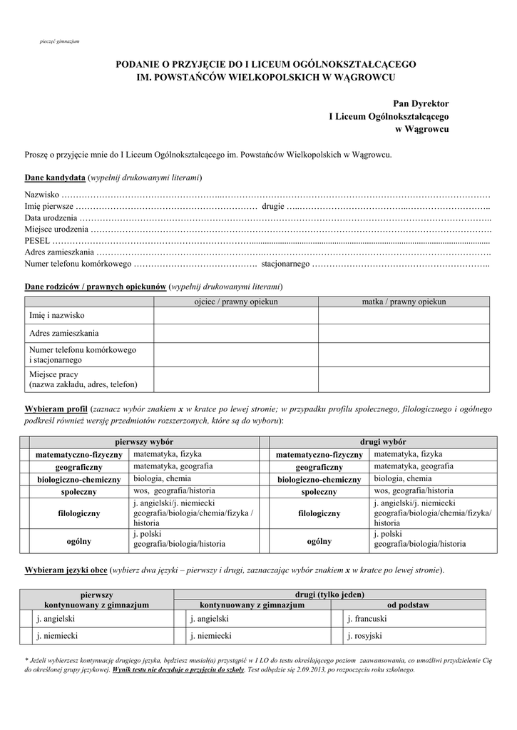 pieczęć gimnazjum PODANIE O PRZYJĘCIE DO I LICEUM OGÓLNOKSZTAŁCĄCEGO IM. POWSTAŃCÓW WIELKOPOLSKICH W WĄGROWCU Pan Dyrektor I Liceum Ogólnokształcącego w Wągrowcu Proszę o przyjęcie mnie do I Liceum Ogólnokształcącego im. Powstańców Wielkopolskich w Wągrowcu. Dane kandydata (wypełnij drukowanymi literami) Nazwisko ………………………………………………..………………………………………………………………………………… Imię pierwsze ……………………………………………………… drugie …..………………………………..……………………….. Data urodzenia …………………………………………………………………………………………………………………………….. Miejsce urodzenia …………………………………………………………………………………………………………………………. PESEL …………………………………………………………….............................................................................................................. Adres zamieszkania ………………………………………………….……………………………………………………………………. Numer telefonu komórkowego ……………………………………. stacjonarnego …………………………………………………….. Dane rodziców / prawnych opiekunów (wypełnij drukowanymi literami) ojciec / prawny opiekun matka / prawny opiekun Imię i nazwisko Adres zamieszkania Numer telefonu komórkowego i stacjonarnego Miejsce pracy (nazwa zakładu, adres, telefon) Wybieram profil (zaznacz wybór znakiem x w kratce po lewej stronie; w przypadku profilu społecznego, filologicznego i ogólnego podkreśl również wersję przedmiotów rozszerzonych, które są do wyboru): pierwszy wybór matematyka, fizyka matematyka, geografia biologia, chemia wos, geografia/historia j. angielski/j. niemiecki geografia/biologia/chemia/fizyka / historia j. polski geografia/biologia/historia drugi wybór matematyka, fizyka matematyka, geografia biologia, chemia wos, geografia/historia j. angielski/j. niemiecki geografia/biologia/chemia/fizyka/ historia j. polski geografia/biologia/historia matematyczno-fizyczny geograficzny biologiczno-chemiczny społeczny matematyczno-fizyczny geograficzny biologiczno-chemiczny społeczny filologiczny filologiczny ogólny ogólny Wybieram języki obce (wybierz dwa języki – pierwszy i drugi, zaznaczając wybór znakiem x w kratce po lewej stronie). pierwszy kontynuowany z gimnazjum drugi (tylko jeden) kontynuowany z gimnazjum j. angielski j. angielski j. francuski j. niemiecki j. niemiecki j. rosyjski od podstaw * Jeżeli wybierzesz kontynuację drugiego języka, będziesz musiał(a) przystąpić w I LO do testu określającego poziom zaawansowania, co umożliwi przydzielenie Cię do określonej grupy językowej. Wynik testu nie decyduje o przyjęciu do szkoły. Test odbędzie się 2.09.2013, po rozpoczęciu roku szkolnego. Informacja o uczniu (wypełnia wychowawca klasy) Oceny za I półrocze klasy III: zachowanie ……………….. religia/etyka ……………….. język polski ……………….. język ……..………… matematyka ……………….. wiedza o społeczeństwie ……………….. historia ……………….. geografia ……………….. biologia ……………….. fizyka z astronomią ……………….. chemia ……………….. technika ……………….. informatyka ……………….. plastyka ……………….. muzyka ……………….. wychowanie fizyczne ……………….. Osiągnięcia (olimpiady, konkursy, zawody itp.): …………………………………………………………………………………...………………………………………………………… ……………………………………………………………………………………...……………………………………………………… Szczególne umiejętności: ……………………………………………………………………………...……………………………………………………………… …………………………………………………………………………………………………………………………………………...… Funkcjonowanie ucznia w zespole klasowym: ……………………………………………………………………...……………………………………………………………………… …………………………………………………………………………………………………………………………………………...… Zaangażowanie w życie szkoły: …………………………………………………...………………………………………………………………………………………… ……………………………………………………………………………………………………………………………………………... Inne uwagi o uczniu: …………………………………………………………………………………………………………………………………………....... ....................................................................................................................................................................................................................... …………………………… podpis wychowawcy Oświadczenie rodziców / prawnych opiekunów ucznia Stwierdzamy, że zostaliśmy zapoznani z treścią informacji o naszym dziecku, sporządzoną przez wychowawcę klasy. Stwierdzamy także, że znana nam jest decyzja naszego dziecka o wyborze szkoły ponadgimnazjalnej. Wyrażamy zgodę na przetwarzanie danych osobowych dziecka, niezbędnych do realizacji procesu rekruta