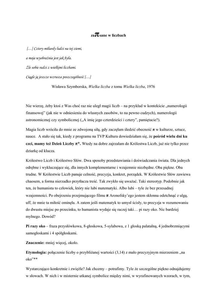 πsane w liczbach za […] Cztery miliardy ludzi na tej ziemi, a moja wyobraźnia jest jak była. Źle sobie radzi z wielkimi liczbami. Ciągle ją jeszcze wzrusza poszczególność […] Wisława Szymborska, Wielka liczba z tomu Wielka liczba, 1976 Nie wierzę, żeby ktoś z Was choć raz nie uległ magii liczb – na przykład w kontekście „numerologii finansowej” (jak nie w odniesieniu do własnych zasobów, to na pewno cudzych), numerologii astronomicznej czy symbolicznej („A imię jego czterdzieści i cztery”, pamiętacie?). Magia liczb wróciła do mnie ze zdwojoną siłą, gdy zaczęłam śledzić obecność π w kulturze, sztuce, nauce. A stało się tak, kiedy z programu na TVP Kultura dowiedziałam się, że pośród wielu dni ku czci, mamy też Dzień Liczby π*. Wtedy na dobre zajrzałam do Królestwa Liczb, już nie tylko przez dziurkę od klucza. Królestwo Liczb i Królestwo Słów. Dwa sposoby przedstawiania i doświadczania świata. Dla jednych odrębne i wykluczające się, dla innych komplementarne i wzajemnie niezbędne. Oba piękne. Oba trudne. W Królestwie Liczb panuje celność, precyzja, konkret, porządek. W Królestwie Słów zawiewa chaosem, a forma nierzadko przytłacza treść. Tak zwykło się uważać. Taki stereotyp. Podobnie jak ten, że humanista to człowiek, który nie lubi matematyki. Albo lubi – tyle że bez przesadnej wzajemności. Po obejrzeniu przejmującego filmu π Aronofsky’ego jestem skłonna odetchnąć z ulgą, uff, że mnie ta miłość ominęła. A zatem jeśli matematyk to umysł ścisły, to precyzja w rozumowaniu do dwustu miejsc po przecinku, to humanista wydaje się raczej taki… pi razy oko. Nic bardziej mylnego. Dowód? Pi razy oko – fraza przysłówkowa, 8-głoskowa, 5-sylabowa, z 1 głoską palatalną, 4 jednobrzmiącymi samogłoskami i 4 spółgłoskami. Znaczenie: mniej więcej, około. Etymologia: połączenie liczby o przybliżanej wartości (3,14) z mało precyzyjnym mierzeniem „na oko”** Wystarczająco konkretnie i zwięźle? Jak chcemy – potrafimy. Tyle że szczególne piękno odnajdujemy w słowach. W nich i w misternie utkanej symbolice między nimi, w wyrafinowanych wzorach, w tym, że liczba π to nie tyle 3,14, ale wartość, która przynagla „gnuśną wieczność do trwania”, która „nie zatrzymuje się na brzegu kartki,// potrafi ciągnąć się po stole, przez powietrze,// przez mur, liść, gniazdo ptasie, chmury, prosto w niebo […]”***. Dychotomię precyzji liczb i słownej estetyzacji widać też w reklamach – ceny w punkt, co do grosza, opis – kreacja, licentia poetica, creative furor. W tym tkwi atrakcyjność przekazów reklamowych – powie jeden, ale też pułapka – zauważy drugi, czulszy na dyscyplinę wypowiedzi, a mniej wrażliwy na jej urok. Na koniec, ze szczególnym ukłonem w stronę twórców tekstów reklamowych, odwołam się do swojego ulubionego Tuwima, który w „Księgach tajemnic magiomatematycznych” publikowanych w piśmie „Problemy”, w rubryce Cicer cum caule, czyli groch z kapustą. Panopticum i archiwum kultury, tak napisał: Obywatele pisarze, poeci, krytycy, recenzenci, historycy literatury, socjologowie i w ogóle pracownicy pióra! Oto dwie formuły matematyczne: 97 √(98765/197530 : 299874366/599748732) + (3√4439939 – √142884)999018 = 17√131072 1+1=2 Nietrudno (łatwiej niż się wydaje) stwierdzić, że obie formuły są w składzie i rezultacie identyczne. Pierwsza wygląda tylko strasznie groźnie i zawile, gdy druga jest prosta, jasna i skromna. Morał. Fakt, że 1+1=2 można (ale nie należy) wyrazić w sposób dziki i skomplikowany. I można inaczej... zwyczajnie... zrozumiale... To samo z pisaniem, obywatele pisarze! Prostota – cenna rzecz. Ale czasem warto trochę się poza nią wychylić – może wyjść pięknie. * Z radością powitałam propozycję ustanowienia święta znaków diakrytycznych (obecnych nie tylko w języku polskim elementów graficznych różnicujących głoski, np.: a – ä, a – ą). W Polsce byłby to Dzień Ę. Fajne, hę? Łukaszu – dziękuję za pomysł. ** Pi razy drzwi – to kolejne analogiczne powiedzenie; w tym przypadku „drzwi” pojawiają się ze względu na rym, nie znaczenie; równie dobrze mogłoby być więc: pi razy brwi (ile to jest – nikt nie wi]. *** Wisława Szymborska, Wielka liczba z tomu Wielka liczba, 1976 PS Zachęcam do oglądania programu Sonda 2 w TVP2 – naukowo ścisłego, a jednak dla każdego. Wasza dk