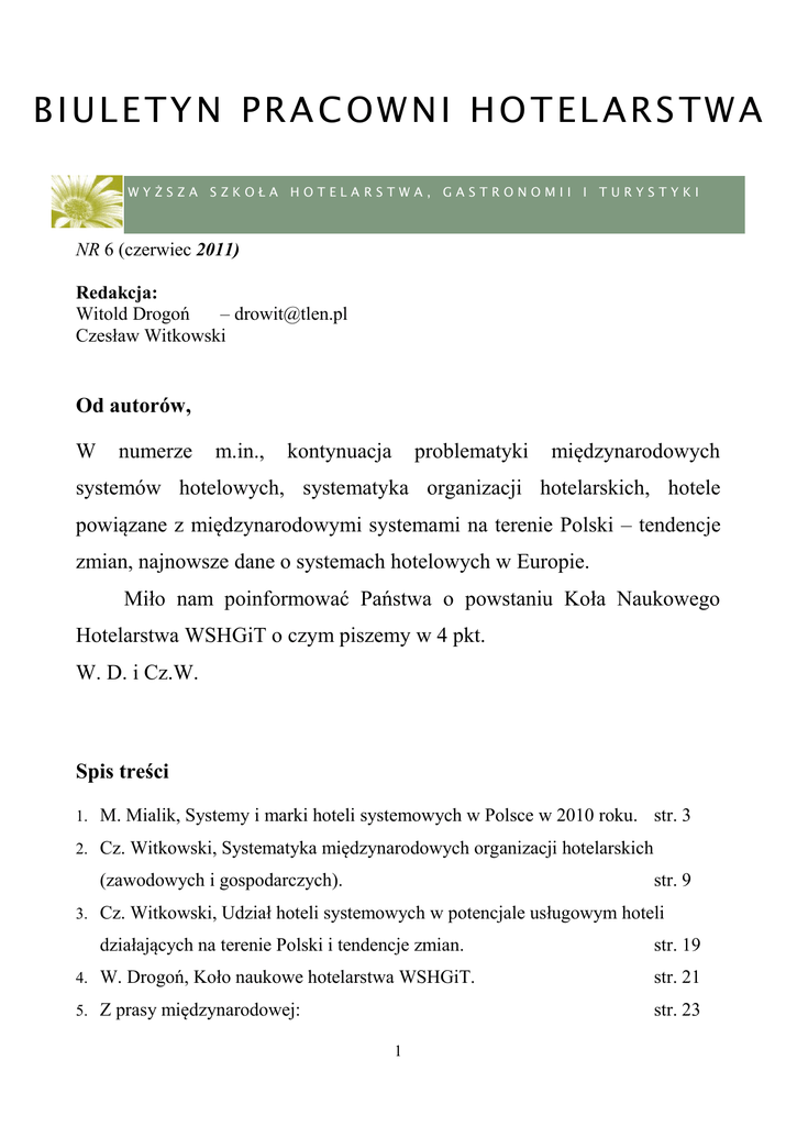 BIULETYN PRACOWNI HO TELARSTWA WYŻSZA SZKOŁA HOTELARSTWA, GASTRONOMII I TURYSTYKI NR 6 (czerwiec 2011) Redakcja: Witold Drogoń – [email protected] Czesław Witkowski WYŻSZA SZKOŁA HO T W UY RŻ YS SZ T A Y SK ZI K O Ł A H O TURYSTYKI Od autorów, W numerze m.in., kontynuacja problematyki międzynarodowych systemów hotelowych, systematyka organizacji hotelarskich, hotele powiązane z międzynarodowymi systemami na terenie Polski – tendencje zmian, najnowsze dane o systemach hotelowych w Europie. Miło nam poinformować Państwa o powstaniu Koła Naukowego Hotelarstwa WSHGiT o czym piszemy w 4 pkt. W. D. i Cz.W. Spis treści 1. M. Mialik, Systemy i marki hoteli systemowych w Polsce w 2010 roku. str. 3 2. Cz. Witkowski, Systematyka międzynarodowych organizacji hotelarskich (zawodowych i gospodarczych). str. 9 3. Cz. Witkowski, Udział hoteli systemowych w potencjale usługowym hoteli działających na terenie Polski i tendencje zmian. str. 19 4. W. Drogoń, Koło naukowe hotelarstwa WSHGiT. str. 21 5. Z prasy międzynarodowej: str. 23 1 - Dziesięć pierwszych grup hotelowych w Europie w 2011 roku, - RevPar w krajach europejskich 2009/2010 - Wykorzystanie potencjału hoteli w krajach europejskich 2009/2010 - Średnie ceny w krajach europejskich 2009/2010. 2 Pkt. 1. Magdalena Mialik (studentka II roku studiów magisterskich) Systemy i marki hoteli systemowych w Polsce w 2010 roku. MSH działające w Polsce i kontrolowane przez nie marki (stan czerwiec 2010 r.) Pozycja Polska Świat Nazwa MSH 1 5 Accor 2 9 Carlson 3 8 Starwood 4 1 InterContinental (3) 5 Poza pierwszą dziesiątką Kontrolowane marki Qubus Qubus 6 Poza pierwszą dziesiątką Vienna International 7 Poza pierwszą dziesiątką Louvres Hotels 8 3 Marriott 9 7 Best Western 10 6 Choice Softel Mercure Novotel Orbis Ibis Etap Radisson Sheraton Westin Le Meridien InterContinental Holiday Express by Holiday Scandic 11 12 Andels Chopin Jan III Sobieski Angelo Amber Kyriad Campanile Premiere Classe Marriott Courtiard Best Western Clarion Comfork Quality Hilton Hyatt 4 Hilton 4 Hyatt Poza 13 pierwszą IBB Hotels IBB Hotels dziesiątką Poza Le Regina 14 pierwszą Mamaison Diana dziesiątką Systemy- 14 Marki - 33 Źródło: Badania naukowe Pracowni Hotelarstwa WSHGiT. 3 Kategoria 5 3–4 3 -4 3 2 1 4–5 5 5 5 5 4–5 3 4 3–4 4 3 4 4 3 2 1 5 4 3–4 5 2 3 4-5 5 4 5 5 Objaśnienia: (1) O pozycji w rankingach decyduje liczba pokoi (jednostek mieszkalnych). (2) Nazwa systemu podana w popularnym skrócie. (3) Spotykana jest różna pisownia tej grupy; InterContinental, Intercontinental, Inter Continental. MSH w Polsce, liczba hoteli, pokoi i miejsc noclegowych, stan czerwiec 2010 r. (szacunek). Pozycja liczona ilością pokoi 1 8 11 5 12 2 9 3 4 7 13 6 10 14 Ilość Nazwa MSH hoteli Accor 61 Marriott 2 Hilton 3 Qubus 13 Hyatt 1 Carlson 7 Best Western 8 Starwood 6 InterContinental 8 Lours Hotels 10 IBB Hotels 2 Vienna Inter. 6 Chois 6 MaMaison 2 Razem 135 Źródło: Badania naukowe Pracowni Hotelarstwa WSHGiT. pokoi 11 665 849 618 1 342 246 2 004 753 1 610 1 485 1 134 243 1 462 653 107 24 171 miejsc noclegowych 29 753 1 598 1 243 2 684 492 4 008 1 494 2 910 3 170 2 268 486 2 924 1 306 214 54 550 Rozmieszczenie terytorialne hoteli systemowych według województw w czerwcu 2006 r. i czerwcu 2010 r. Lp. Województwo Ogółem Polska 1 Dolnośląskie 2 Kujawsko-pomorskie 3 Lubelskie 4 Lubuski 5 Łódzkie 6 Małopolskie 7 Mazowieckie 8 Opolskie 9 Podkarpackie 10 Podlaskie 11 Pomorskie 2006 120 18 4 4 3 4 17 26 1 2 8 Liczba hoteli struktura 2010 struktura 100% 135 100% 15,0 18 13,4 3,3 4 3,0 3,3 3 2,2 2,5 3 2,2 3,3 5 3,7 14,1 20 15,1 21,7 27 20,0 0,8 1 0,8 1 0,8 1,7 2 1,5 6,7 11 8,2 4 zmiana +15 0 0 -1 0 +1 +3 +1 0 +1 0 +3 12 Śląskie 14 11,7 13 Świętokrzyskie 1 0,8 14 Warmińsko-Mazurskie 2 1,7 15 Wielkopolskie 8 6,7 16 Zachodniopomorskie 8 6,7 Źródło: Badania naukowe Pracowni Hotelarstwa WSHGiT. 15 4 1 10 9 11,2 3,0 0,8 7,4 6,7 +1 +3 -1 +2 +1 Z analizy danych zawartych w powyższej tabeli wynikają następujące stwierdzenia: 1. Hotele systemowe pojawiły się już we wszystkich województwach. 2. Najwięcej hoteli systemowych pozostających w dyspozycji MSH zlokalizowanych jest na terenie województwa Mazowieckiego, Dolnośląskiego, Małopolskiego, Śląskiego, Pomorskiego, Wielkopolskiego i Zachodniopomorskiego. 3. W Warszawie zlokalizowanych jest 27 hoteli systemowych, co stanowi 20% wszystkich hoteli systemowych działających w Polsce. 4. Na terenie województwa Opolskiego, Podkarpackiego i Warmińsko- Mazurskiego znajduje się zaledwie po jednym obiekcie, a Podlaskiego dwa. Struktura standardowa hoteli systemowych w 2006 i 2010 roku przedstawiała się następująco. Hotel 2006 % Ogółem 120 100 5 gwiazdkowy 15 12,5 4 gwiazdkowy 31 25,9 3 gwiazdkowy 51 42,5 2 gwiazdkowy 22 18,3 1 gwiazdkowy 1 0,8 Źródło: Badania naukowe Pracowni Hotelarstwa WSHGiT. 2010 135 23 38 46 19 9 % 100 17,0 28,1 34,1 14,1 6,6 Powyższe dane potwierdzają tezę zainteresowania MSH już wszystkimi grupami standardowymi hoteli. Dla porównania poniżej prezentowana jest struktura hotelarstwa ogółem w Polsce w 2010 roku. Hotel Ogółem 5 gwiazdkowy 4 gwiazdkowy 3 gwiazdkowy 2010 % 1 894 51 165 837 5 100 2,7 8,7 44,2 2 gwiazdkowy 1 gwiazdkowy Źródło: GUS. 628 213 33,1 11,3 Terenowe rozmieszczenie marek hoteli systemowych działających w Polsce (stan w czerwcu 2010 r.) Województwo Marki 1. Sofitel 2. Mercure 3. Novotel 4. Orbis 5. Ibis 6. Etap 7. Best Western 8. InterContinental 9. Campanile 10. Qubus 11. Radisson 12. Quality 1. Express by Holiday 2. Shandic 3. Mercure 4. Etap 1. Campanile 2. Mercure 3. Orbis 1. Orbis 2. Qubus 1. Best Western 2. Ibis 3. Qubus 4. Campanile 1. Andres 2. Quality 3. Qubus 4. Best Western 5. Holiday Inn 6. Mercure 7. Orbis 8. Etap 9. Chopin 10. Sheraton 11. Radisson 12. Hilton 13. Campanile 14. Novotel 15. Ibis Dolnośląskie (występuje 12 marek) Kujawsko-pomorskie (występują 4 marki) Lubelskie (występują 3 m