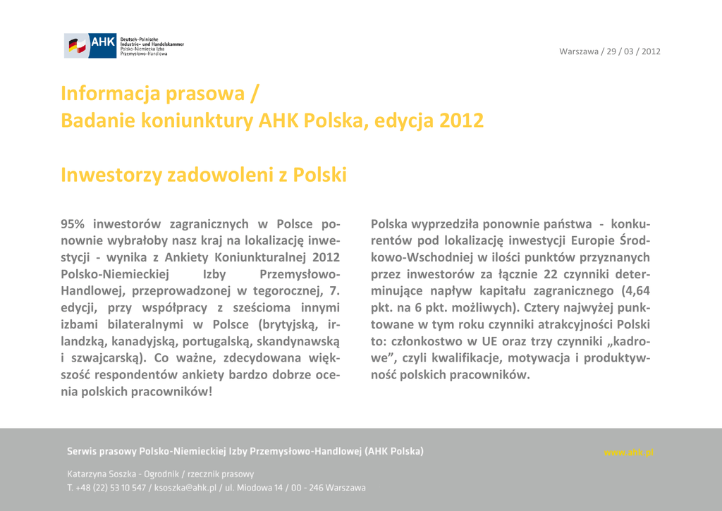 Warszawa / 29 / 03 / 2012 Informacja prasowa / Badanie koniunktury AHK Polska, edycja 2012 Inwestorzy zadowoleni z Polski 95% inwestorów zagranicznych w Polsce ponownie wybrałoby nasz kraj na lokalizację inwestycji - wynika z Ankiety Koniunkturalnej 2012 Polsko-Niemieckiej Izby PrzemysłowoHandlowej, przeprowadzonej w tegorocznej, 7. edycji, przy współpracy z sześcioma innymi izbami bilateralnymi w Polsce (brytyjską, irlandzką, kanadyjską, portugalską, skandynawską i szwajcarską). Co ważne, zdecydowana większość respondentów ankiety bardzo dobrze ocenia polskich pracowników! Polska wyprzedziła ponownie państwa - konkurentów pod lokalizację inwestycji Europie Środkowo-Wschodniej w ilości punktów przyznanych przez inwestorów za łącznie 22 czynniki determinujące napływ kapitału zagranicznego (4,64 pkt. na 6 pkt. możliwych). Cztery najwyżej punktowane w tym roku czynniki atrakcyjności Polski to: członkostwo w UE oraz trzy czynniki „kadrowe”, czyli kwalifikacje, motywacja i produktywność polskich pracowników. 95% inwestorów: TAK dla Polski Tylko 5% (9 przedsiębiorstw) spośród 186 firm, które wzięły udział w badaniu przeprowadzonym w lutym 2012 r., podjęłoby ponowną decyzję o lokalizacji inwestycji w EŚW na niekorzyść Polski. Analogiczny, tylko 5procentowy odsetek negatywnych odpowiedzi odnotowaliśmy w 2011 r. W porównaniu z poprzednią edycją badania, w tegorocznej liczba firm respondentów wzrosła jednak niespełna dwuipółkrotnie (z 78 firm w 2011 r. do 186 w 2012 r.). W 2010 r. odsetek odpowiedzi negatywnych wyniósł znacznie więcej, bo 10%. Według ankietowanych, Polska z sumarycznym wynikiem 4,64 pkt ( w ub. r. 4,80 pkt.) wyprzedza największych tegorocznych regionalnych konkurentów – Czechy (4,15 pkt.) oraz Słowację (3,65 pkt.). Oba te kraje były też największymi konkurentami Polski w ubiegłorocznym badaniu (2011: Słowacja 4,13 pkt; Czechy 4,12 pkt.).Na pozycji 4. oraz 5. rankingu w 2012 r. znalazły się Estonia (3,51 pkt. w 2012 r./ versus 4 pkt. w 2011 r.) oraz Słowenia (3,48 pkt./ versus 3,72 pkt. w 2011 r.). W porównaniu z ubiegłorocznym badaniem nieco gorzej wypadły sumarycznie kraje nadbałtyckie: Estonia, Łotwa i Litwa. Podobnie jak w ub.r. dobre oceny inwestorów uzyskały też Chiny (4,27 pkt.) i Niemcy (4,23 pkt.), brane w badaniu pod uwagę benchmarkingowo. Premia za członkostwo w UE i polskich pracowników, „dwója” za podatki Oceniając w skali od 1 do 5 pkt. inwestorzy najwyżej premiowali Polskę za członkostwo w Unii Europejskiej (średnia ocena 4,30 pkt.) oraz czynniki „ludzkie”: kwalifikacje (3,78 pkt.), motywację (3,61 pkt.) i produktywność polskich pracowników (3,60 pkt.). Na kolejnych wysoko notowanych pozycjach znalazły się: stabilność polityczna, jakość i dostępność lokalnych poddostawców, jakość szkolnictwa wyższego oraz dostępność wykwalifikowanych pracowników. W ubiegłorocznej edycji na 1. pozycji analogicznie znalazło się członkostwo w UE, na 2. miejscu – stabilność polityczna Polski, doceniona przez inwestorów w czasie kryzysu zadłużeniowego części Europy. Kolejne pozycje zajęły, podobnie jak w 2012 r., kwalifikacje pracowników, ich motywacja oraz produktywność kadr. Najgorzej oceniane determinanty lokalizacji inwestycji w Polsce to system i administracja podatkowa i wysokość obciążeń podatkowych (2,54 pkt.). W 2011 r. najniżej ocenione przez respondentów badania zostały infrastruktura i wydajność administracji publicznej. Wg inwestorów zagranicznych, kolejne słabe strony lokalizacji inwestycji w Polsce to: niewielka przejrzystość przetargów publicznych (2,55 pkt.), niska wydajność administracji publicznej (2,57 pkt.) i słabo rozwinięta infrastruktura (2,6 pkt.). Lepsza infrastruktura, efektywna i tańsza administracja, stabilne finanse i polski złoty – w czołówce postulatów firm Wśród priorytetów polityki gospodarczej ankietowani przedsiębiorcy wymienili przede wszystkim: - rozwój i modernizację infrastruktury transportowej (w tym głównie kolejowej i dróg ekspresowych), - poprawę wydajności pracy administracji publicznej i kontrolę jej kosztów, - reformę finansów publicznych (w tym zmniejszenie długu publicznego), - stabilizację kursu złotego bądź alternatywnie przyjęcie euro w Polsce, - walkę z korupcją i zwiększenie przejrzystości przetargów publicznych, - deregulację prawną gospodarki i zwiększenie przejrzystości prawa, - reformę służby zdrowia i systemu ubezpieczeń społecznych, - elastyczne prawo pracy i zmniejszenie opodatkowania pracy. Na kolejnych pozycjach znalazły się: - budowa efektywnego systemu kształcenia zawodowego i zwalczanie bezrobocia wśród młodych, - otwarty dialog z prywatnym biznesem i wsparcie drobnego biznesu, - kontrola wydatków publicznych, - promocja gospodarcza Polski za granicą i udogodnienia dla inwestorów zagranicznych, - redukcja obciążeń podatkowych. Kondycja bieżąca i prognozy dla gospodarki i firm W 2012 r. inwestorzy bardziej sceptycznie niż w 2011 oceniają kondycję polskiej gospodarki. 37% ankietowanych (13% mniej niż w ub.r.) ocenia sytuację ekonomiczną w Polsce jako dobrą, 54% jako zadowalającą, 9% jako złą (6,5% więcej niż w ub.r.). Umiarkowanie gorsze niż w ub. r., choć wciąż w przeważającej części optymistyczne są też prognozy na przyszłość: 25% respondentów wierzy, że nastąpi poprawa koniunktury gospodarczej, 51% przewiduje, że sytuacja gospodarcza Polski utrzyma się na bieżącym poziomie. Zwiększyła się liczba firm pesymistycznych w prognozach dla polskiej gospodarki: z 6,3% w 2011 r. do 24% w 2012 r. Nieco bardziej stonowane niż w ub. r. są też prognozy dotyczące działalności przedsiębiorstw: 60% respondentów planuje zwiększyć swoje obroty w 2012 r. (w ub. r. – 70%), prawie 40% przewiduje wzrost eksportu (w ub. r. – 45%). Tylko 10% ankietowanych firm twierdzi, że ich