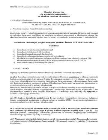 EDZ.432-193/ 16 udzielanie świadczeń zdrowotnych Materiały informacyjne dla uczestników konkursu ofert na udzielenie świadczeń zdrowotnych 1. Udzielający Zamówienia: Samodzielny Publiczny Szpital Kliniczny Nr 4 w Lublinie, ul. Jaczewskiego 8, tel. 081-72-44-360, fax: 747-57-10, Regon 000288751 2. Przedmiot konkursu. Warunki świadczenia usług. Zamówienie może być udzielone podmiotowi wykonującemu działalność leczniczą, lub osobie legitymującej się nabyciem fachowych kwalifikacji do udzielania świadczeń zdrowotnych w określonym zakresie lub określonej dziedzinie medycyny, zgodnie z art. 26 ustawy o działalności leczniczej z dnia 15 kwietnia 2011r. Przedmiotem konkursu jest przejęcie obowiązku udzielania ŚWIADCZEŃ ZDROWOTNYCH w zakresie: Konsultacji dermatologicznych dla dorosłych Konsultacji okulistycznych dla dorosłych Konsultacji hematologicznych dla dorosłych Konsultacji urologicznych dla noworodków i wcześniaków udzielania świadczeń zdrowotnych dla pracowników narażonych na zakażenie: wirusem HIV, wirusem zapalenia wątroby typu B (HBV), wirusem zapalenia wątroby typu C (HCV) f) oznaczenia stężenia 5-fluorouracylu w osoczu a) b) c) d) e) CPV: 85.12.12.00-5 Wymaga się poniższych zakresów lub zasad realizacji udzielania świadczeń zdrowotnych: ad.a,b,c Konsultacje specjalistyczne będą prowadzone przez lekarzy ze specjalizacją w zakresie przedmiotu konkursu oraz posiadających co najmniej 3-letnie doświadczenie zawodowe w tym zakresie – prowadzone – wg wyboru lekarza kierującego-w siedzibie Udzielającego Zamówienia oraz - u Przyjmującego Zamówienie (po dowiezieniu pacjenta staraniem i na koszt Udzielającego Zamówienia) za uprzednim zgłoszeniem, w terminie nie dłuższym niż 24 godziny od zgłoszenia. Przyjmujący Zamówienie we własnym zakresie zabezpiecza niezbędne materiały na potrzeby konsultacji. Jeżeli odległość pomiędzy siedzibą Przyjmującego i Udzielającego zamówienie będzie większa niż 15 km (wyznaczonych najkrótszą trasą drogami asfaltowymi) – konsultacje będą odbywały się wyłącznie w siedzibie Udzielającego zamówienie. ad. d Urologiczne konsultacje specjalistyczne dla noworodków i wcześniaków wykonywane będą przez lekarzy posiadających specjalizację w zakresie urologii, w siedzibie SPSK-4 (za uprzednim zgłoszeniem, w terminie nie dłuższym niż 24 godziny od zgłoszenia) ad. e udzielanie świadczeń zdrowotnych dla pracowników SPSK 4 narażonych na zakażenie: wirusem HIV, wirusem zapalenia wątroby typu B (HBV), wirusem zapalenia wątroby typu C (HCV) wg bieżących potrzeb Udzielającego Zamówienia, prowadzone w siedzibie Przyjmującego Zamówienieniezwłocznie po zgłoszeniu się osoby skierowanej ad.f Wymaga się udzielania świadczeń zdrowotnych tj; oznaczenia stężenia 5-fluorouracylu w osoczu wg bieżących potrzeb Udzielającego Zamówienia(ok. 100 oznaczeń rocznie) w siedzibie Przyjmującego Zamówienie. Strona 1 z 19 EDZ.432-193/ 16 udzielanie świadczeń zdrowotnych Przyjmujący Zamówienie zobowiązuje się do udzielania świadczeń zdrowotnych z zachowaniem należytej staranności, zgodnie ze wskazaniami aktualnej wiedzy medycznej, dostępnymi środkami technicznymi i farmaceutycznymi oraz zgodnie z zasadami kodeksu etyki lekarskiej. Przyjmujący Zamówienie zobowiązany jest do przestrzegania praw pacjenta i realizacji obowiązków względem pacjenta i członków jego rodziny lub innych osób upoważnionych, wynikających z ustawy o zawodzie lekarza i lekarza dentysty, ustawy o prawach pacjenta i Rzeczniku Praw Pacjenta oraz innych powszechnie obowiązujących przepisów prawa. Udzielający Zamówienia dopuszcza składanie ofert na dowolnie wybraną ilość spośród zadań stanowiących przedmiot konkursu. Każde z zadań stanowi odrębny przedmiot konkursu i będzie podlegało odrębnej procedurze związanej z badaniem, oceną i wyborem oferty. 3. Czas trwania umowy. Umowa zostanie zawarta na okres od dnia podpisania umowy projekcie umowy) do dnia 31-03-2019 r. (lub daty wskazanej w odpowiednim 4. Treść oferty. Składana oferta musi zawierać: a. Dane oferenta: nazwa, siedziba lub imię i nazwisko, adres, numer telefonu do kontaktu b. Aktualny wypis z rejestru podmiotów wykonujących działalność leczniczą, potwierdzający uprawnienie do wykonywania świadczeń zdrowotnych objętych przedmiotem konkursu, (wydruk pierwszej strony). c. Aktualny wypis z CEIDG lub Krajowego Rejestru Sądowego Przyjmującego Zamówienie, d. dla zadań „a,b,c,d” - dane dotyczące liczby i kwalifikacji zawodowych osób udzielających świadczenia będące przedmiotem oferty (prosimy o podanie nazwisk tych osób) oraz dokumenty potwierdzające kwalifikacje do udzielania świadczeń zdrowotnych stanowiących przedmiot konkursu m.in.dyplom, prawo wykonywania zawodu. -dla zadań „e,f” oświadczenie o posiadaniu kwalifikacji do udzielania świadczeń zdrowotnych w określonym zakresie lub określonej dziedzinie medycyny, zgodnie z ustawą o działalności leczniczej. e. Propozycje należności za realizację świadczeń zdrowotnych - należy podać odrębne stawki brutto za: * dla zadania „a,b,c”- Propozycje należności za realizację świadczeń zdrowotnych - należy podać odrębne stawki brutto za: - jedną konsultację w siedzibie Udzielającego Zamówienia - jedną konsultację w siedzibie Przyjmującego Zamówienie, * dla zadania „d” - należy podać cenę brutto za jedną konsultację w siedzibie SPSK 4 * dla zadania „e” należność za udzielania świadczeń zdrowotnych dla pracowników narażonych na zakażenie, odrębnie za: - za udzielone poradę lekarską/konsultację - za wykonane badania w celu potwierdzenia dodatniego wyniku badania HIV - za wykonane badania w celu potwierdzenia dodatniego wyniku badania HBV - za wykonane badania w celu potwierdzenia dodatniego wyniku badania HCV * dla zadania „f”- Propozycje należności za realizację świ