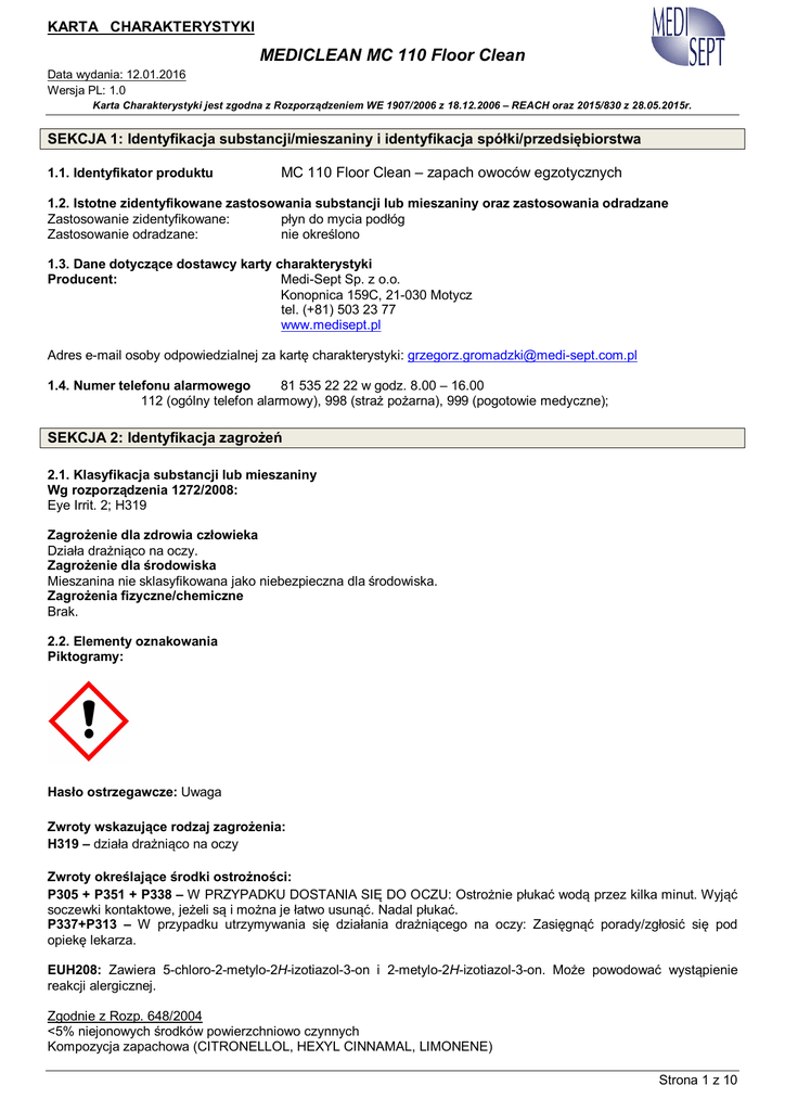 KARTA CHARAKTERYSTYKI MEDICLEAN MC 110 Floor Clean Data wydania: 12.01.2016 Wersja PL: 1.0 Karta Charakterystyki jest zgodna z Rozporządzeniem WE 1907/2006 z 18.12.2006 – REACH oraz 2015/830 z 28.05.2015r. SEKCJA 1: Identyfikacja substancji/mieszaniny i identyfikacja spółki/przedsiębiorstwa 1.1. Identyfikator produktu MC 110 Floor Clean – zapach owoców egzotycznych 1.2. Istotne zidentyfikowane zastosowania substancji lub mieszaniny oraz zastosowania odradzane Zastosowanie zidentyfikowane: płyn do mycia podłóg Zastosowanie odradzane: nie określono 1.3. Dane dotyczące dostawcy karty charakterystyki Producent: Medi-Sept Sp. z o.o. Konopnica 159C, 21-030 Motycz tel. (+81) 503 23 77 www.medisept.pl Adres e-mail osoby odpowiedzialnej za kartę charakterystyki: [email protected] 1.4. Numer telefonu alarmowego 81 535 22 22 w godz. 8.00 – 16.00 112 (ogólny telefon alarmowy), 998 (straż pożarna), 999 (pogotowie medyczne); SEKCJA 2: Identyfikacja zagrożeń 2.1. Klasyfikacja substancji lub mieszaniny Wg rozporządzenia 1272/2008: Eye Irrit. 2; H319 Zagrożenie dla zdrowia człowieka Działa drażniąco na oczy. Zagrożenie dla środowiska Mieszanina nie sklasyfikowana jako niebezpieczna dla środowiska. Zagrożenia fizyczne/chemiczne Brak. 2.2. Elementy oznakowania Piktogramy: Hasło ostrzegawcze: Uwaga Zwroty wskazujące rodzaj zagrożenia: H319 – działa drażniąco na oczy Zwroty określające środki ostrożności: P305 + P351 + P338 – W PRZYPADKU DOSTANIA SIĘ DO OCZU: Ostrożnie płukać wodą przez kilka minut. Wyjąć soczewki kontaktowe, jeżeli są i można je łatwo usunąć. Nadal płukać. P337+P313 – W przypadku utrzymywania się działania drażniącego na oczy: Zasięgnąć porady/zgłosić się pod opiekę lekarza. EUH208: Zawiera 5-chloro-2-metylo-2H-izotiazol-3-on i 2-metylo-2H-izotiazol-3-on. Może powodować wystąpienie reakcji alergicznej. Zgodnie z Rozp. 648/2004 <5% niejonowych środków powierzchniowo czynnych Kompozycja zapachowa (CITRONELLOL, HEXYL CINNAMAL, LIMONENE) Strona 1 z 10 KARTA CHARAKTERYSTYKI MEDICLEAN MC 110 Floor Clean Data wydania: 12.01.2016 Wersja PL: 1.0 Karta Charakterystyki jest zgodna z Rozporządzeniem WE 1907/2006 z 18.12.2006 – REACH oraz 2015/830 z 28.05.2015r. METHYLCHLOROISOTHIAZOLINONE, METHYLISOTHIAZOLINONE Środki powierzchniowo czynne spełniają wymogi biodegradacji zgodne z Rozp. 648/2004. Arkusz danych składników dostępny na stronie: www.medisept.pl 2.3. Inne zagrożenia Brak dodatkowych zagrożeń Brak informacji na temat spełnienia kryteriów PBT lub vPvB zgodnie z załącznikiem XIII rozporządzenia REACH. Odpowiednie badania nie były przeprowadzone. SEKCJA 3: Skład/informacja o składnikach 3.1. Substancje Nie dotyczy 3.2. Mieszaniny Niebezpieczne składniki: Identyfikator produktu Zawartość % Klasyfikacja CLP Kody zwrotów Klasa zagrożenia i wskazujących kody kategorii rodzaj zagrożenia Etoksylowane alkohole tłuszczowe C10C16 CAS: 68002-97-1 WE: Nr indeksowy: Nr REACH: substancja podlega przepisom okresu przejściowego <1,5 Acute Tox. 4 Eye Dam.1 H302 H318 Sól sodowa siarczanu 2-etyloheksylu CAS: 126-92-1 WE: 204-812-8 Nr indeksowy: Nr REACH: substancja podlega przepisom okresu przejściowego <0,5 Skin Irrit.2 Eye Dam.1 H315 H318 Acute Tox. 3 Skin Corr. 1B Skin Sens. 1 Aquatic Acute 1 Aquatic Chronic1 H331 H311 H301 H314 H317 H400 H410 mieszanina 5-chloro-2-metylo-2H-izotiazol-3-onu [nr WE 247-500-7] i 2metylo-2H-izotiazol-3-onu [nr WE 220-239-6] (3:1); CAS: 55965-84-9 WE: Nr indeksowy: 613-167-00-5 Nr REACH: substancja podlega przepisom okresu przejściowego Pełna treść zwrotów H w sekcji 16 <0,0015 Ponadto zawiera Eter monometylowy glikolu propylenowego nr CAS 34590-94-8 w stężeniu 1-3% (nr REACH: 01-2119450011-60-XXXX) SEKCJA 4: Środki pierwszej pomocy 4.1. Opis środków pierwszej pomocy W przypadku kontaktu ze skórą: Należy zdjąć zanieczyszczone ubranie, umyć zabrudzoną skórę wodą z mydłem, spłukać dokładnie wodą, w przypadku pojawienia się podrażnienia, rumieni skontaktować się z lekarzem. W przypadku kontaktu z oczami: Przepłukać oczy przez kilkanaście minut (ok. 15) dużą ilością wody, trzymając powieki szeroko rozwarte. Unikać silnego strumienia, ze względu na niebezpieczeństwo uszkodzenia rogówki, skontaktować się z lekarzem. Narażenie inhalacyjne: W razie zawrotów głowy lub nudności wyprowadzić poszkodowanego na świeże powietrze, w razie braku szybkiej poprawy zasięgnąć porady lekarza. Strona 2 z 10 KARTA CHARAKTERYSTYKI MEDICLEAN MC 110 Floor Clean Data wydania: 12.01.2016 Wersja PL: 1.0 Karta Charakterystyki jest zgodna z Rozporządzeniem WE 1907/2006 z 18.12.2006 – REACH oraz 2015/830 z 28.05.2015r. W przypadku połknięcia: Nie wywoływać wymiotów, przepłukać jamę ustną. Natychmiast skontaktować się z lekarzem. 4.2. Najważniejsze ostre i opóźnione objawy oraz skutki narażenia Układ oddechowy. Wdychanie stężonych par produktu może powodować podrażnienia błon śluzowych nosa, gardła i dalszych odcinków układu oddechowego. Przewód pokarmowy. Spożycie wywołuje podrażnienie błon śluzowych przewodu pokarmowego. Kontakt z oczami: Powoduje podrażnienia oczu Kontakt ze skórą: Może powodować podrażnienia, zaczerwienienia. 4.3. Wskazania dotyczące wszelkiej natychmiastowej pomocy lekarskiej i szczególnego postępowania z poszkodowanym Decyzję o sposobie postępowania podejmuje lekarz po ocenie stanu poszkodowanego. SEKCJA 5: Postępowanie w przypadku pożaru 5.1. Środki gaśnicze Odpowiednie środki gaśnicze: piana alkoholoodporna lub suche proszki gaśnicze (A,B,C), dwutlenek węgla (gaśnica śniegowa), piasek lub ziemia, mgła wodna. Stosować metody gaśnicze odpowiednie do warunków otoczenia. Niewłaściwe środki gaśnicze: Silny strumień wody. 5.2. Szczególne zagrożenia związane z substancją lub mieszaniną W trakcie pożaru, pod wpływem działania wysokich temperatur uwalniają się toks