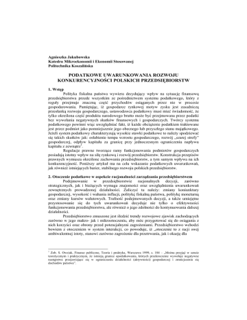 Agnieszka Jakubowska Katedra Mikroekonomii i Ekonomii Stosowanej Politechnika Koszalińska PODATKOWE UWARUNKOWANIA ROZWOJU KONKURENCYJNOŚCI POLSKICH PRZEDSIĘBIORSTW 1. Wstęp Polityka fiskalna państwa wywiera decydujący wpływ na sytuację finansową przedsiębiorstwa przede wszystkim ze pośrednictwem systemu podatkowego, który z reguły przejmuje znaczną część przychodów osiąganych przez nie w procesie gospodarowania. Pamiętając, iż gospodarce rynkowej motyw zysku jest zasadniczą przesłanką rozwoju gospodarczego, ustawodawca podatkowy musi mieć świadomość, że tylko określona część produktu narodowego brutto może być przejmowana przez podatki bez wywołania negatywnych skutków finansowych i gospodarczych. Twórcy systemu podatkowego powinni więc uwzględniać fakt, iż każde obciążenie podatkiem traktowane jest przez podmiot jako pomniejszenie jego obecnego lub przyszłego stanu majątkowego. Jeżeli system podatkowy charakteryzują wysokie stawki podatkowe to należy spodziewać się takich skutków jak: osłabienie tempa wzrostu gospodarczego, rozwój „szarej strefy” gospodarczej, odpływ kapitału za granicę przy jednoczesnym ograniczeniu napływu kapitału z zewnątrz1. Regulacje prawne tworzące ramy funkcjonowania podmiotów gospodarczych posiadają istotny wpływ na siłę rynkową i rozwój przedsiębiorstw. Konstrukcja przepisów prawnych wymusza określone zachowania przedsiębiorstw, a tym samym wpływa na ich konkurencyjność. Poniższy artykuł ma na celu wskazanie podatkowych uwarunkowań, jak również istniejących barier, stabilnego rozwoju polskich przedsiębiorstw. 2. Otoczenie podatkowe w aspekcie racjonalności zarządzania przedsiębiorstwem Podejmowanie w przedsiębiorstwie racjonalnych decyzji, zarówno strategicznych, jak i bieżących wymaga znajomości oraz uwzględnienia uwarunkowań zewnętrznych prowadzonej działalności. Zaliczyć tu należy: zmiany koniunktury gospodarczej, wysokość i wahania inflacji, politykę fiskalną państwa, politykę monetarną oraz zmiany kursów walutowych. Trafność podejmowanych decyzji, a także umiejętne przystosowanie się do tych uwarunkowań decyduje nie tylko o efektywności funkcjonowania przedsiębiorstwa, ale również o jego zdolności do kontynuowania dalszej działalności. Przedsiębiorstwo zmuszone jest śledzić trendy rozwojowe zjawisk zachodzących zarówno w jego makro- jak i mikrootoczeniu, aby móc przygotować się do osiągania z nich korzyści oraz obrony przed potencjalnymi zagrożeniami. Przedsiębiorstwo wchodzi bowiem z otoczeniem w system interakcji, co powoduje, iż „otoczenie to z racji swej ambiwalentnej istoty, stanowi zarówno zagrożenie dla przetrwania, jak i okazję dla 1 Zob. S. Owsiak, Finanse publiczne, Teoria i praktyka, Warszawa 1999, s. 184 – „Można przyjąć w sensie teoretycznym i praktycznym, że istnieją granice opodatkowania, których przekroczenie wywołuje negatywne następstwa przejawiające się w ograniczaniu działalności (aktywności) gospodarczej i zmniejszeniu się dochodów państwa”. rozwoju”2. F. A. Hayek oprócz otoczenia społecznego wyróżnia wiele innych składających się na złożoną panoramę walki konkurencyjnej, w procesie której wszyscy na siebie oddziaływują, wzajemnie się dostosowując i tworząc system względnie zrównoważony3. W prawidłowym działaniu skomplikowanego mechanizmu, jakim jest otoczenie przedsiębiorstwa, znacznie sprzężenia zwrotnego polega na dostosowaniu reakcji do otrzymywanych informacji dotyczących efektów działania. W zachowaniu przedsiębiorstw, efektywność sprzężenia zwrotnego jako metody modyfikacji zachowań dążących do wzrostu skuteczności oraz efektywności podejmowanych działań, zależy od spełnienia podstawowych warunków4: dokładności (obiektywności) informacji; bezpośredniości – jeżeli sprzężenie zwrotne występuje bezpośrednio po wydarzeniu, to jego odbiorca łatwo uświadamia sobie relację między postawą a wynikiem; kompletności – polegający na możliwości uwzględnienia wszystkich ważniejszych oddziaływań. Istnienie przedsiębiorstwa w dłuższym okresie zależy od działań przystosowujących je do zmieniającego się otoczenia. Działania adaptacyjne zachodzące zarówno wewnątrz przedsiębiorstwa, jak i we wszystkich jego kontaktach z otoczeniem, mogą być wymuszone również przez fiskalizm gospodarki5. Podatkom, poza funkcją czysto fiskalną, przypisuje się dwa zasadnicze cele: ekonomiczny oraz społeczny. Doktryny podatkowe zakładają, iż podłoże celu ekonomicznego stanowi przede wszystkim wspieranie rozwoju działalności gospodarczej zgodnej z założeniem twórców polityki gospodarczej kraju. Najczęściej odbywa się to poprzez zmniejszenie obciążeń podatkowych wybranych sfer działalności gospodarczej, co w zasadzie uznać można jako swoistą „protekcję podatkową”. Zniekształca ona konkurencję, lecz w założeniu poprzez obniżenie podatków oraz zmniejszenie progresji, sprzyjać ma rozwojowi koniunktury gospodarczej, zwiększać efektywność gospodarowania, zapewniać wzrost gospodarczy. W rzeczywistości zwiększanie zysków jednych podmiotów jest wynikiem wyższego opodatkowania innych. Kształtowanie systemu podatkowego w warunkach gospodarki rynkowej wymaga jasnego określenia założeń polityki podatkowej. Za najważniejsze, konieczne do uwzględnienia przy wprowadzeniu nowych lub zmianie dotychczasowych konstrukcji opodatkowania przedsiębiorców należy uznać6: → neutralność podatków wobec mechanizmu rynkowego, → tworzenie warunków sprzyjających wzrostowi gospodarczemu. Istota pierwszego z wymienionych założeń sprowadza się nie tylko do neutralności podatkowej7 ze względu na formę prawną przedsiębiorcy, ale również ze 2 G. Nizard, Metamorfozy przedsiębiorstwa. Zarządzanie w zmiennym otoczeniu organizacji, Wydawnictwo Naukowe PWN, Warszawa 1998, s. 7. 3 F