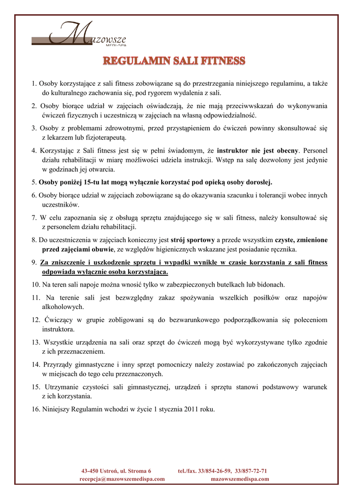 1. Osoby korzystające z sali fitness zobowiązane są do przestrzegania niniejszego regulaminu, a także do kulturalnego zachowania się, pod rygorem wydalenia z sali. 2. Osoby biorące udział w zajęciach oświadczają, że nie mają przeciwwskazań do wykonywania ćwiczeń fizycznych i uczestniczą w zajęciach na własną odpowiedzialność. 3. Osoby z problemami zdrowotnymi, przed przystąpieniem do ćwiczeń powinny skonsultować się z lekarzem lub fizjoterapeutą. 4. Korzystając z Sali fitness jest się w pełni świadomym, że instruktor nie jest obecny. Personel działu rehabilitacji w miarę możliwości udziela instrukcji. Wstęp na salę dozwolony jest jedynie w godzinach jej otwarcia. 5. Osoby poniżej 15-tu lat mogą wyłącznie korzystać pod opieką osoby dorosłej. 6. Osoby biorące udział w zajęciach zobowiązane są do okazywania szacunku i tolerancji wobec innych uczestników. 7. W celu zapoznania się z obsługą sprzętu znajdującego się w sali fitness, należy konsultować się z personelem działu rehabilitacji. 8. Do uczestniczenia w zajęciach konieczny jest strój sportowy a przede wszystkim czyste, zmienione przed zajęciami obuwie, ze względów higienicznych wskazane jest posiadanie ręcznika. 9. Za zniszczenie i uszkodzenie sprzętu i wypadki wynikłe w czasie korzystania z sali fitness odpowiada wyłącznie osoba korzystająca. 10. Na teren sali napoje można wnosić tylko w zabezpieczonych butelkach lub bidonach. 11. Na terenie sali jest bezwzględny zakaz spożywania wszelkich posiłków oraz napojów alkoholowych. 12. Ćwiczący w grupie zobligowani są do bezwarunkowego podporządkowania się poleceniom instruktora. 13. Wszystkie urządzenia na sali oraz sprzęt do ćwiczeń mogą być wykorzystywane tylko zgodnie z ich przeznaczeniem. 14. Przyrządy gimnastyczne i inny sprzęt pomocniczy należy zostawiać po zakończonych zajęciach w miejscach do tego celu przeznaczonych. 15. Utrzymanie czystości sali gimnastycznej, urządzeń i sprzętu stanowi podstawowy warunek z ich korzystania. 16. Niniejszy Regulamin wchodzi w życie 1 stycznia 2011 roku. 43-450 Ustroń, ul. Stroma 6 [email protected] tel./fax. 33/854-26-59, 33/857-72-71 mazowszemedispa.com