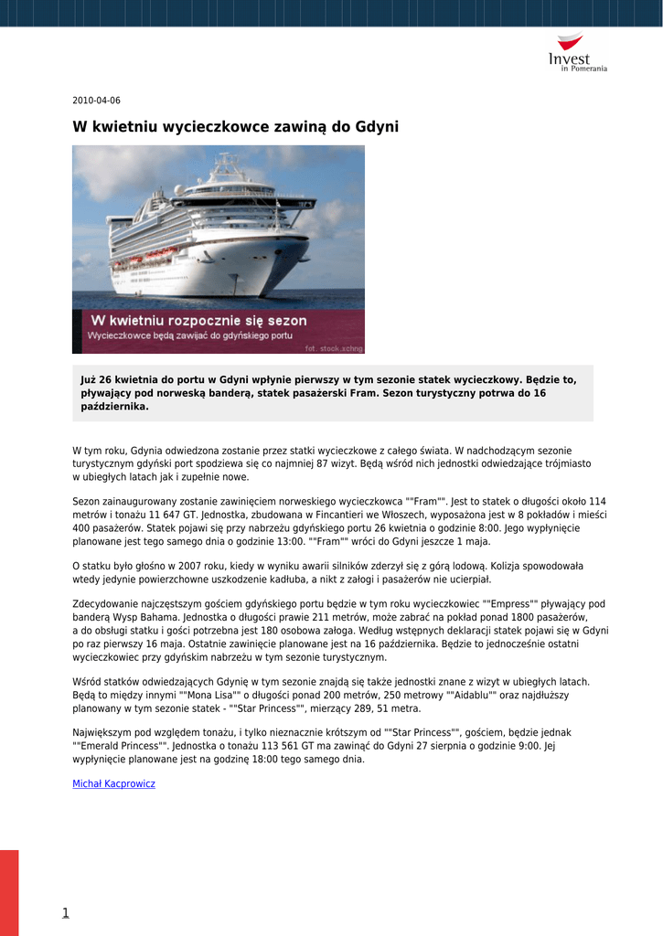2010-04-06 W kwietniu wycieczkowce zawiną do Gdyni Już 26 kwietnia do portu w Gdyni wpłynie pierwszy w tym sezonie statek wycieczkowy. Będzie to, pływający pod norweską banderą, statek pasażerski Fram. Sezon turystyczny potrwa do 16 października. W tym roku, Gdynia odwiedzona zostanie przez statki wycieczkowe z całego świata. W nadchodzącym sezonie turystycznym gdyński port spodziewa się co najmniej 87 wizyt. Będą wśród nich jednostki odwiedzające trójmiasto w ubiegłych latach jak i zupełnie nowe. Sezon zainaugurowany zostanie zawinięciem norweskiego wycieczkowca ""Fram"". Jest to statek o długości około 114 metrów i tonażu 11 647 GT. Jednostka, zbudowana w Fincantieri we Włoszech, wyposażona jest w 8 pokładów i mieści 400 pasażerów. Statek pojawi się przy nabrzeżu gdyńskiego portu 26 kwietnia o godzinie 8:00. Jego wypłynięcie planowane jest tego samego dnia o godzinie 13:00. ""Fram"" wróci do Gdyni jeszcze 1 maja. O statku było głośno w 2007 roku, kiedy w wyniku awarii silników zderzył się z górą lodową. Kolizja spowodowała wtedy jedynie powierzchowne uszkodzenie kadłuba, a nikt z załogi i pasażerów nie ucierpiał. Zdecydowanie najczęstszym gościem gdyńskiego portu będzie w tym roku wycieczkowiec ""Empress"" pływający pod banderą Wysp Bahama. Jednostka o długości prawie 211 metrów, może zabrać na pokład ponad 1800 pasażerów, a do obsługi statku i gości potrzebna jest 180 osobowa załoga. Według wstępnych deklaracji statek pojawi się w Gdyni po raz pierwszy 16 maja. Ostatnie zawinięcie planowane jest na 16 października. Będzie to jednocześnie ostatni wycieczkowiec przy gdyńskim nabrzeżu w tym sezonie turystycznym. Wśród statków odwiedzających Gdynię w tym sezonie znajdą się także jednostki znane z wizyt w ubiegłych latach. Będą to między innymi ""Mona Lisa"" o długości ponad 200 metrów, 250 metrowy ""Aidablu"" oraz najdłuższy planowany w tym sezonie statek - ""Star Princess"", mierzący 289, 51 metra. Największym pod względem tonażu, i tylko nieznacznie krótszym od ""Star Princess"", gościem, będzie jednak ""Emerald Princess"". Jednostka o tonażu 113 561 GT ma zawinąć do Gdyni 27 sierpnia o godzinie 9:00. Jej wypłynięcie planowane jest na godzinę 18:00 tego samego dnia. Michał Kacprowicz 1 2