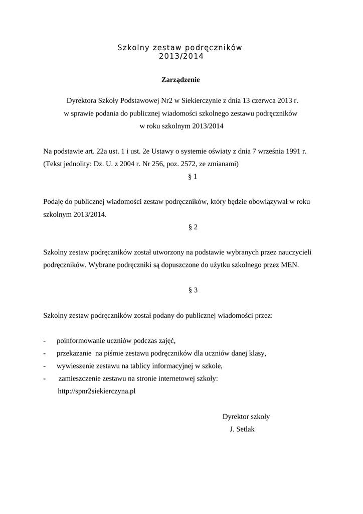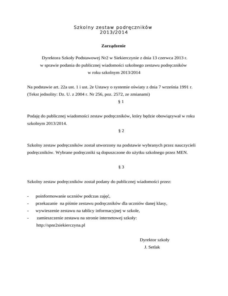 Szkolny zestaw podręczników 2013/2014 Zarządzenie Dyrektora