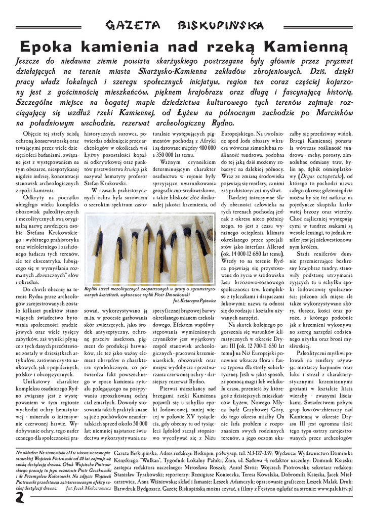 Epoka kamienia nad rzeką Kamienną Jeszcze do niedawna ziemie powiatu skarżyskiego postrzegane były głównie przez pryzmat działających na terenie miasta Skarżysko-Kamienna zakładów zbrojeniowych. Dziś, dzięki pracy władz lokalnych i szeregu społecznych inicjatyw, region ten coraz częściej kojarzony jest z gościnnością mieszkańców, pięknem krajobrazu oraz długą i fascynującą historią. Szczególne miejsce na bogatej mapie dziedzictwa kulturowego tych terenów zajmuje rozciągający się wzdłuż rzeki Kamiennej, od Łyżew na północnym zachodzie po Marcinków na południowym wschodzie, rezerwat archeologiczny Rydno. Objęcie tej strefy ścisłą ochroną konserwatorską oraz trwającymi przez wiele dziesięcioleci badaniami, związane jest z występowaniem na tym obszarze, niespotykanej nigdzie indziej, koncentracji stanowisk archeologicznych z epoki kamienia. Odkryty na początku ubiegłego wieku kompleks obozowisk paleolitycznych i mezolitycznych swą oryginalną nazwę zawdzięcza osobie Stefana Krukowskiego - wybitnego prahistoryka oraz wieloletniego i zasłużonego badacza tych terenów, ale też ekscentryka, lubującego się w wymyślaniu rozmaitych „dziwacznych” słów i określeń. Do chwili obecnej na terenie Rydna przez archeologów zarejestrowanych zostało kilkaset punktów stanowiących świadectwo bytowania społeczności pradziejowych oraz wiele tysięcy zabytków, zaś wyniki płynące z tych danych przedstawione zostały w dziesiątkach artykułów, zarówno czysto naukowych, jak i popularnych, polsko- i obcojęzycznych. Unikatowy charakter kompleksu osadniczego Rydno związany jest z występowaniem w tym regionie wychodni ochry hematytowej - minerału o intensywnie czerwonej barwie. Wydobywanie ochry, tego nader cennego dla społeczności pra- historycznych surowca, potwierdza odsłonięcie przez archeologów w okolicach wsi Łyżwy pozostałości kopalni odkrywkowej oraz punktów przetwórstwa krwicy, jak nazywał hematyty profesor Stefan Krukowski. W czasach prahistorycznych ochra była surowcem o szerokim spektrum zasto- turalnie występujących pigmentów pochodzą z Afryki i są datowane między 400 000 a 350 000 lat temu. Ważnym czynnikiem determinującym charakter osadnictwa w rejonie były sprzyjające uwarunkowania geograficzno-środowiskowe, a także bliskość złóż doskonałej jakości krzemienia, od Repliki strzał mezolitycznych zaopatrzonych w groty o zgeometryzowanych kształtach, wykonawca replik Piotr Dmochowski fot. Katarzyna Pyżewicz sowań, wykorzystywano ją m.in. w procesie garbowania skór zwierzęcych, jako środek antyseptyczny, ochronę przeciw insektom, pigment do produkcji barwników, ale też jako ważny element obrzędów o charakterze symbolicznym, co potwierdza fakt powszechnego w epoce kamienia rytuału polegającego na posypywaniu sproszkowaną ochrą ciał zmarłych. Dowody stosowania takich praktyk znane są już z pochówków neandertalskich sprzed około 50 000 lat; niemniej najstarsze świadectwa wykorzystywania na- Na okładce: Na stanowisku c13 w wiosce wczesnopiastowskiej Wojciech Piotrowski od 20 lat zajmuje się suchą destylacją drewna. Obok Wojciecha Piotrowskiego pracują tu jego uczniowie Piotr Gaczkowski i dr Przemysław Kołosowski. Na zdjęciu Wojciech Piotrowski przedstawia zainteresowanym efekty suchej destylacji drewna. fot. Jacek Mielcarzewicz specyficznej brązowej barwy określanego mianem czekoladowego. Efektem współwystępowania wymienionych czynników jest wyjątkowy zespół stanowisk archeologicznych - pracowni krzemieniarskich, obozowisk oraz miejsc wydobycia i przetwarzania czerwonej ochry - dzisiejszy rezerwat Rydno. Pierwsi mieszkańcy nad brzegami rzeki Kamienna pojawili się u schyłku epoki lodowcowej, mniej więcej w połowie XV tysiąclecia, gdy obecny tu od tysiącleci lądolód zaczął stopniowo wycofywać się z Niżu Europejskiego. Na uwolnione spod lodu obszary wkracza wówczas zimnolubna roślinność tundrowa, podobna do tej jaką dziś możemy zobaczyć na dalekiej północy. Wraz ze zmianą środowiska pojawiają się renifery, za nimi zaś prahistoryczni myśliwi. Bardziej intensywne ślady obecności człowieka na tych terenach pochodzą jednak z okresu nieco późniejszego, to jest z czasu wyraźnego ocieplenia klimatu określanego przez specjalistów jako interfaza Allerod (ok. 14 000-12 680 lat temu). Wtedy to na terenie Rydna pojawiają się przystosowane do życia w środowisku lasu brzozowo-sosnowego społeczności tzw. kompleksu z tylczakami i drapaczami łukowymi; nazwa ta odnosi się do rodzaju i kształtu używanych narzędzi. Na skutek kolejnego pogorszenia się warunków klimatycznych w okresie Dryasu III (ok. 12 700-11 650 lat temu) na Niż Europejski ponownie wkracza flora i fauna typowa dla strefy subarktycznej. Jeśli w jakiś sposób, za pomocą magii lub wehikułu czasu, przenieść by któregoś z dzisiejszych mieszkańców Łyżew, Nowego Młyna bądź Grzybowej Góry, do tego okresu miałby On nie lada problem z rozpoznaniem swych rodzinnych terenów, a jego oczom uka- załby się przedziwny widok. Brzegi Kamiennej porastała wówczas roślinność tundrowa - mchy, porosty, zimnolubne odmiany traw, bylin np. dębik ośmiopłatkowy (Dryas octopetala), od którego to pochodzi nazwa całego okresu; gdzieniegdzie można by się też natknąć na pojedyncze skupiska karłowatej brzozy oraz wierzby. Choć najliczniej występującymi w tundrze ssakami są wesołe lemingi, to jednak renifer jest jej niekwestionowanym królem. Stada reniferów dumnie przemierzające bezkresny krajobraz tundry, stanowiły podstawę utrzymania żyjących tu u schyłku epoki lodowcowej społeczności; jedzono ich mięso ale także wykorzystywano skóry, tłuszcz, kości oraz poroże, z którego podobnie jak z krzemieni wykonywano szereg narzędzi codziennego użytku oraz broni myśliwskiej. Paleolityczni myśliwi polowali na renifery używając miotaczy harp