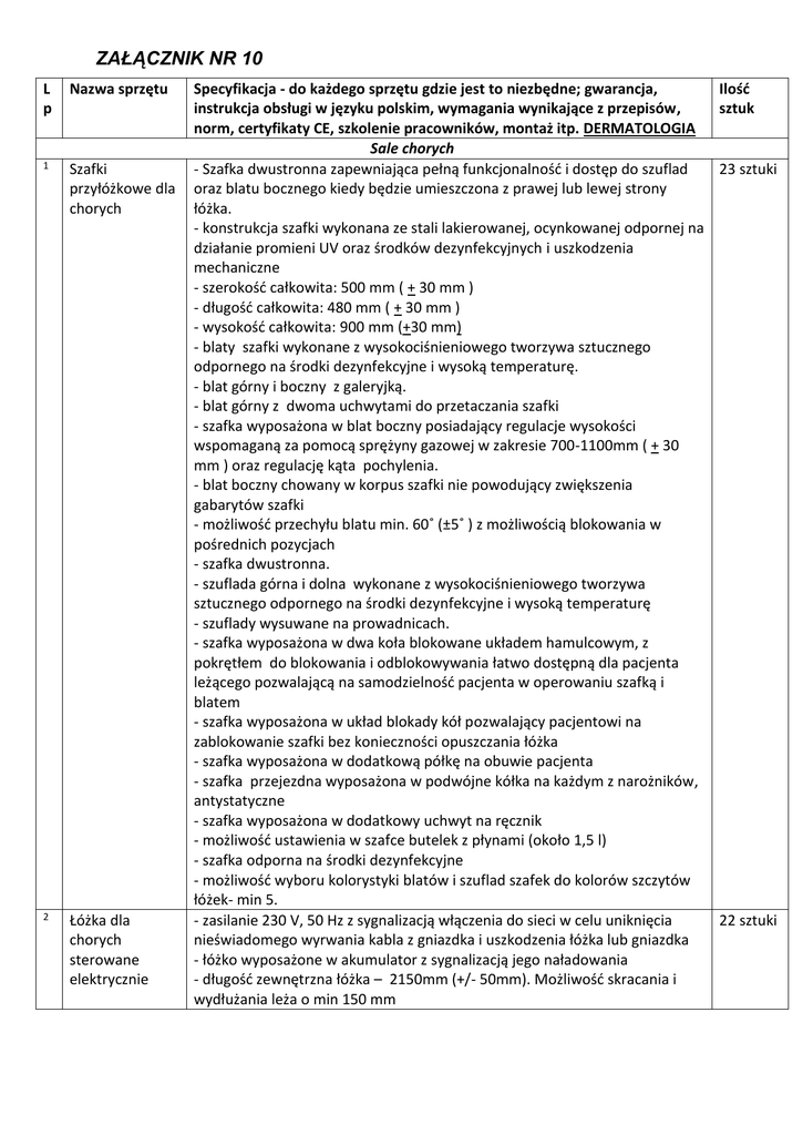 ZAŁĄCZNIK NR 10 L p Nazwa sprzętu 1 Szafki przyłóżkowe dla chorych 2 Łóżka dla chorych sterowane elektrycznie Specyfikacja - do każdego sprzętu gdzie jest to niezbędne; gwarancja, instrukcja obsługi w języku polskim, wymagania wynikające z przepisów, norm, certyfikaty CE, szkolenie pracowników, montaż itp. DERMATOLOGIA Sale chorych - Szafka dwustronna zapewniająca pełną funkcjonalność i dostęp do szuflad oraz blatu bocznego kiedy będzie umieszczona z prawej lub lewej strony łóżka. - konstrukcja szafki wykonana ze stali lakierowanej, ocynkowanej odpornej na działanie promieni UV oraz środków dezynfekcyjnych i uszkodzenia mechaniczne - szerokość całkowita: 500 mm ( + 30 mm ) - długość całkowita: 480 mm ( + 30 mm ) - wysokość całkowita: 900 mm (+30 mm) - blaty szafki wykonane z wysokociśnieniowego tworzywa sztucznego odpornego na środki dezynfekcyjne i wysoką temperaturę. - blat górny i boczny z galeryjką. - blat górny z dwoma uchwytami do przetaczania szafki - szafka wyposażona w blat boczny posiadający regulacje wysokości wspomaganą za pomocą sprężyny gazowej w zakresie 700-1100mm ( + 30 mm ) oraz regulację kąta pochylenia. - blat boczny chowany w korpus szafki nie powodujący zwiększenia gabarytów szafki - możliwość przechyłu blatu min. 60˚ (±5˚ ) z możliwością blokowania w pośrednich pozycjach - szafka dwustronna. - szuflada górna i dolna wykonane z wysokociśnieniowego tworzywa sztucznego odpornego na środki dezynfekcyjne i wysoką temperaturę - szuflady wysuwane na prowadnicach. - szafka wyposażona w dwa koła blokowane układem hamulcowym, z pokrętłem do blokowania i odblokowywania łatwo dostępną dla pacjenta leżącego pozwalającą na samodzielność pacjenta w operowaniu szafką i blatem - szafka wyposażona w układ blokady kół pozwalający pacjentowi na zablokowanie szafki bez konieczności opuszczania łóżka - szafka wyposażona w dodatkową półkę na obuwie pacjenta - szafka przejezdna wyposażona w podwójne kółka na każdym z narożników, antystatyczne - szafka wyposażona w dodatkowy uchwyt na ręcznik - możliwość ustawienia w szafce butelek z płynami (około 1,5 l) - szafka odporna na środki dezynfekcyjne - możliwość wyboru kolorystyki blatów i szuflad szafek do kolorów szczytów łóżek- min 5. - zasilanie 230 V, 50 Hz z sygnalizacją włączenia do sieci w celu uniknięcia nieświadomego wyrwania kabla z gniazdka i uszkodzenia łóżka lub gniazdka - łóżko wyposażone w akumulator z sygnalizacją jego naładowania - długość zewnętrzna łóżka – 2150mm (+/- 50mm). Możliwość skracania i wydłużania leża o min 150 mm Ilość sztuk 23 sztuki 22 sztuki ZAŁĄCZNIK NR 10 - szerokość zewnętrzna łóżka z zamontowanymi barierkami – 950mm (+/50mm). - leże łóżka 4 – sekcyjne, w tym 3 segmenty ruchome. - leże wypełnienie panelami tworzywowymi. - panele gładkie, łatwo demontowalne, lekkie, nadające się do dezynfekcji. - leże łóżka przystosowane do montażu barierek bocznych oraz protektorów zabezpieczających pacjenta na całej długości leża - szczyty łóżka tworzywowe, wyjmowane od strony nóg i głowy z możliwością zablokowania szczytu przed wyjęciem na czas transportu łóżka w celu uniknięcia wypadnięcia szczytu i stracenia kontroli nad łóżkiem - sterowanie elektryczne łóżka przy pomocy: pilota przewodowego dla pacjenta z podświetlanymi przyciskami, panelu sterowniczego montowanego na szczycie od strony nóg posiadającego piktogramy pozwalające na łatwą identyfikację funkcji wykonywanej za pomocą konkretnego przycisku. - regulacja elektryczna wysokości leża, w zakresie 350 mm do 750 mm (+/30mm), gwarantująca bezpieczne opuszczanie łóżka - regulacja elektryczna części plecowej w zakresie 70 (+/-5o) - regulacja elektryczna części nożnej w zakresie 34 (+/-5o) - regulacja elektryczna funkcji autokontur, sterowanie przy pomocy przycisków na pilocie dla pacjenta i z panelu sterowniczego montowanego na szczycie łóżka od strony nóg - funkcja autoregresji niwelująca ryzyko powstawania odleżyn dzięki minimalizacji nacisku w odcinku krzyżowo-lędźwiowym a tym samym pełniąca funkcje profilaktyczną przeciwko odleżynom stopnia 1-4. W segmencie pleców: min.9cm, w segmencie uda: min.5cm. - funkcja Ergoframe (zaawansowana autoregresja) system teleskopowego odsuwania się segmentu pleców oraz uda nie tylko do tyłu, ale i do góry (ruch po okręgu) podczas podnoszenia segmentów, w celu eliminacji sił tarcia będącymi potencjalnym zagrożeniem powstawania odleżyn stopnia 1:4. - regulacja elektryczna pozycji Trendelenburga 15 – sterowanie z panelu sterowniczego montowanego na szczycie łóżka od strony nóg - regulacja elektryczna pozycji anty-Trendelenburga 15 – sterowanie z panelu sterowniczego montowanego na szczycie łóżka od strony nóg. - regulacja elektryczna do pozycji krzesła kardiologicznego – sterowanie przy pomocy jednego oznaczonego odpowiednim piktogramem przycisku na panelu sterowniczym montowanym na szczycie łóżka od strony nóg - regulacja elektryczna do pozycji antyszokowej – sterowanie przy pomocy jednego oznaczonego odpowiednim piktogramem przycisku na panelu sterowniczym montowanym na szczycie łóżka od strony nóg - regulacja elektryczna funkcji CPR – sterowanie przy pomocy jednego oznaczonego odpowiednim piktogramem przycisku na panelu sterowniczym montowanym na szczycie łóżka od strony nóg - wyłączniki/blokady funkcji elektrycznych (na panelu sterowniczym) dla poszczególnych regulacji: - regulacji wysokości - regulacji części plecowej - regulacji części nożnej ZAŁĄCZNIK NR 10 3 Łóżko z wagą sterowane elektrycznie z wyposażeniem dla chorego w izolatce - elektroniczne wskaźniki informujące o zablokowanych, aktywnych funkcjach łóżka na panelu sterowniczym i pilocie pacjenta - alarm dźwiękowy informujący o próbie użycia zablokowanej funkcji 