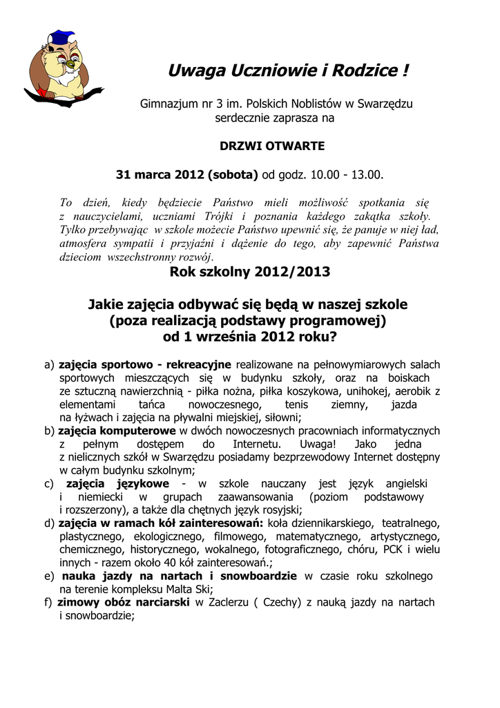 Uwaga Uczniowie i Rodzice ! Gimnazjum nr 3 im. Polskich Noblistów w Swarzędzu serdecznie zaprasza na DRZWI OTWARTE 31 marca 2012 (sobota) od godz. 10.00 - 13.00. To dzień, kiedy będziecie Państwo mieli możliwość spotkania się z nauczycielami, uczniami Trójki i poznania każdego zakątka szkoły. Tylko przebywając w szkole możecie Państwo upewnić się, że panuje w niej ład, atmosfera sympatii i przyjaźni i dążenie do tego, aby zapewnić Państwa dzieciom wszechstronny rozwój. Rok szkolny 2012/2013 Jakie zajęcia odbywać się będą w naszej szkole (poza realizacją podstawy programowej) od 1 września 2012 roku? a) zajęcia sportowo - rekreacyjne realizowane na pełnowymiarowych salach sportowych mieszczących się w budynku szkoły, oraz na boiskach ze sztuczną nawierzchnią - piłka nożna, piłka koszykowa, unihokej, aerobik z elementami tańca nowoczesnego, tenis ziemny, jazda na łyżwach i zajęcia na pływalni miejskiej, siłowni; b) zajęcia komputerowe w dwóch nowoczesnych pracowniach informatycznych z pełnym dostępem do Internetu. Uwaga! Jako jedna z nielicznych szkół w Swarzędzu posiadamy bezprzewodowy Internet dostępny w całym budynku szkolnym; c) zajęcia językowe - w szkole nauczany jest język angielski i niemiecki w grupach zaawansowania (poziom podstawowy i rozszerzony), a także dla chętnych język rosyjski; d) zajęcia w ramach kół zainteresowań: koła dziennikarskiego, teatralnego, plastycznego, ekologicznego, filmowego, matematycznego, artystycznego, chemicznego, historycznego, wokalnego, fotograficznego, chóru, PCK i wielu innych - razem około 40 kół zainteresowań.; e) nauka jazdy na nartach i snowboardzie w czasie roku szkolnego na terenie kompleksu Malta Ski; f) zimowy obóz narciarski w Zaclerzu ( Czechy) z nauką jazdy na nartach i snowboardzie; g) realizacja licznych projektów edukacyjnych, innowacji pedagogicznych i konkursów finansowanych m.in. ze źródeł EFS. Gimnazjum nr 3 im. Polskich Noblistów - jaką szkołą jesteśmy? • • • • • • • Otwieramy świat – uczestnicząc dwukrotnie w projekcie Comenius, dzięki któremu duża grupa młodzieży odwiedziła już Włochy, Szwecję i Turcję. W przygotowaniu projekt wymiany z Litwą i Rosją. Dbamy o poczucie bezpieczeństwa – posiadamy dobrze rozbudowany monitoring w całej szkole, współpracujemy z różnymi instytucjami (Policją, Strażą Miejską, Stowarzyszeniem Bezpieczna Gmina i wieloma innymi), aby zapewnić prawidłowy rozwój każdego ucznia. Zapewniamy wysoki poziom wiedzy i umiejętności, dzięki bogatej ofercie zajęć pozalekcyjnych, wykwalifikowanej kadrze nauczycieli i nowoczesnemu wyposażeniu sal, zapewniamy uczniom dobry start w szkołach ponadgimnazjalnych. Nasi absolwenci to nie tylko dobrzy fachowcy, ale także magistrowie i doktoranci uczelni krajowych i zagranicznych. Ilość i jakość uzyskanych certyfikatów i wyróżnień to niewątpliwy powód do dumy. Posiadamy wszystkie certyfikaty „ Szkoły z klasą” - ogólnopolskiej akcji organizowanej przez Gazetą Wyborczą pod patronatem Prezydenta Rzeczypospolitej Polskiej. Jesteśmy „Szkołą bez przemocy”, „Szkołą z prawami dziecka”, „ Szkołą Humanitarną”. Jako jedna z 20 szkół w Polsce uzyskaliśmy wyróżnienie w konkursie „Orange dla Ziemi”. Zdobyty w 2009 roku certyfikat jakości ISO 9001 potwierdził właściwe świadczenie usług w zakresie dydaktyki i wychowania w gimnazjum. Sport to nieodzowny element rozwoju nastolatka, dlatego sale gimnastyczne, siłownia i boiska za sztuczną nawierzchnią są do dyspozycji uczniów przez cały rok. Organizujemy, w ramach innowacji pedagogicznych zajęcia dla uczniów klas III przygotowujące do egzaminu gimnazjalnego na stałe wpisane w plan lekcji klasy. Jednozmianowy system pracy. Serdecznie zapraszamy!!!