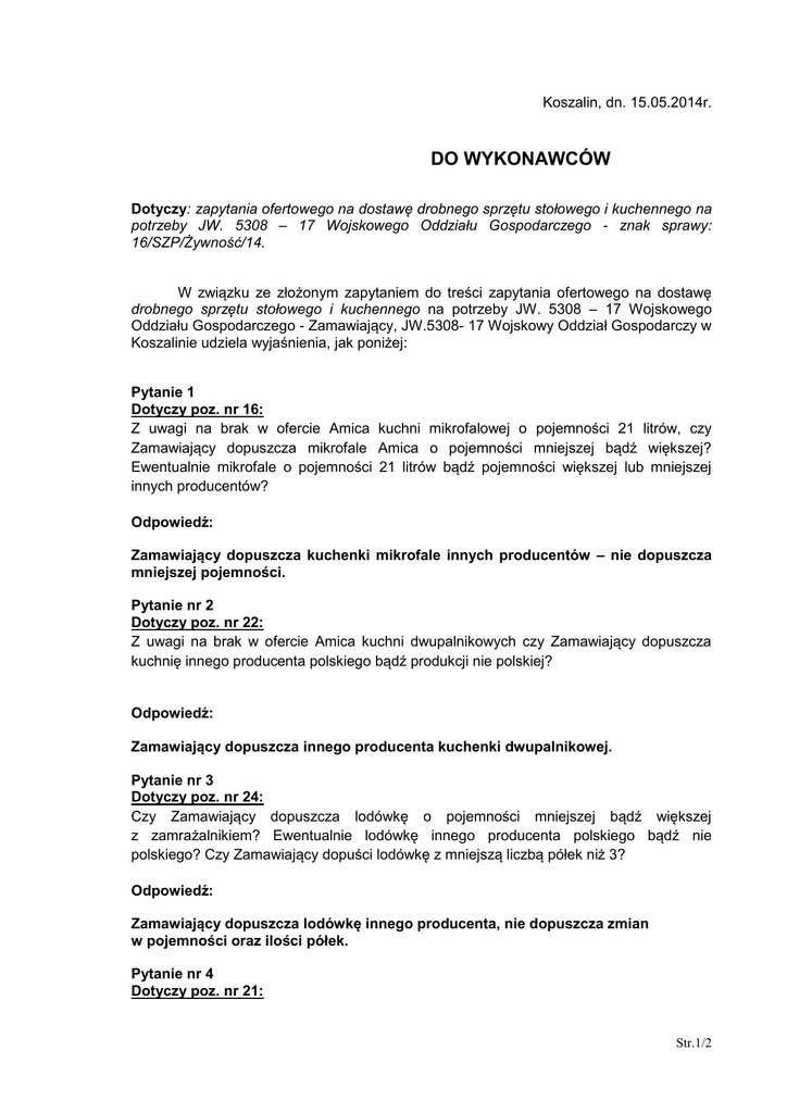 Koszalin, dn. 15.05.2014r. DO WYKONAWCÓW Dotyczy: zapytania ofertowego na dostawę drobnego sprzętu stołowego i kuchennego na potrzeby JW. 5308 – 17 Wojskowego Oddziału Gospodarczego - znak sprawy: 16/SZP/Żywność/14. W związku ze złożonym zapytaniem do treści zapytania ofertowego na dostawę drobnego sprzętu stołowego i kuchennego na potrzeby JW. 5308 – 17 Wojskowego Oddziału Gospodarczego - Zamawiający, JW.5308- 17 Wojskowy Oddział Gospodarczy w Koszalinie udziela wyjaśnienia, jak poniżej: Pytanie 1 Dotyczy poz. nr 16: Z uwagi na brak w ofercie Amica kuchni mikrofalowej o pojemności 21 litrów, czy Zamawiający dopuszcza mikrofale Amica o pojemności mniejszej bądź większej? Ewentualnie mikrofale o pojemności 21 litrów bądź pojemności większej lub mniejszej innych producentów? Odpowiedź: Zamawiający dopuszcza kuchenki mikrofale innych producentów – nie dopuszcza mniejszej pojemności. Pytanie nr 2 Dotyczy poz. nr 22: Z uwagi na brak w ofercie Amica kuchni dwupalnikowych czy Zamawiający dopuszcza kuchnię innego producenta polskiego bądź produkcji nie polskiej? Odpowiedź: Zamawiający dopuszcza innego producenta kuchenki dwupalnikowej. Pytanie nr 3 Dotyczy poz. nr 24: Czy Zamawiający dopuszcza lodówkę o pojemności mniejszej bądź większej z zamrażalnikiem? Ewentualnie lodówkę innego producenta polskiego bądź nie polskiego? Czy Zamawiający dopuści lodówkę z mniejszą liczbą półek niż 3? Odpowiedź: Zamawiający dopuszcza lodówkę innego producenta, nie dopuszcza zmian w pojemności oraz ilości półek. Pytanie nr 4 Dotyczy poz. nr 21: Str.1/2 Z uwagi na brak w firmie Krups ekspresów z młynkiem porcelanowym, czy Zamawiający dopuszcza ekspres Krupsa z młynkiem ze stali nierdzewnej? Odpowiedź: Zamawiający dopuszcza ekspres do kawy firmy KRUPS z młynkiem ceramicznym do kawy- nie dopuszcza młynka ze stali nierdzewnej. Wszystkie pozostałe parametry techniczne w/w artykułów pozostają bez zmian. Powyższe wyjaśnienia są wiążące dla Wykonawców i należy je uwzględnić przy sporządzaniu oferty. „ z upoważnienia Dowódcy Jednostki Wojskowej Nr 5308” KIEROWNIK SEKCJI ZAMÓWIEŃ PUBLICZNYCH / - / dr Mirosław KOŁODZIEJCZYK Monika Kalinowska – Światły (tel. 94 345 6195) Sekcja Zamówień Publicznych 15.05.2014r. Str.2/2
