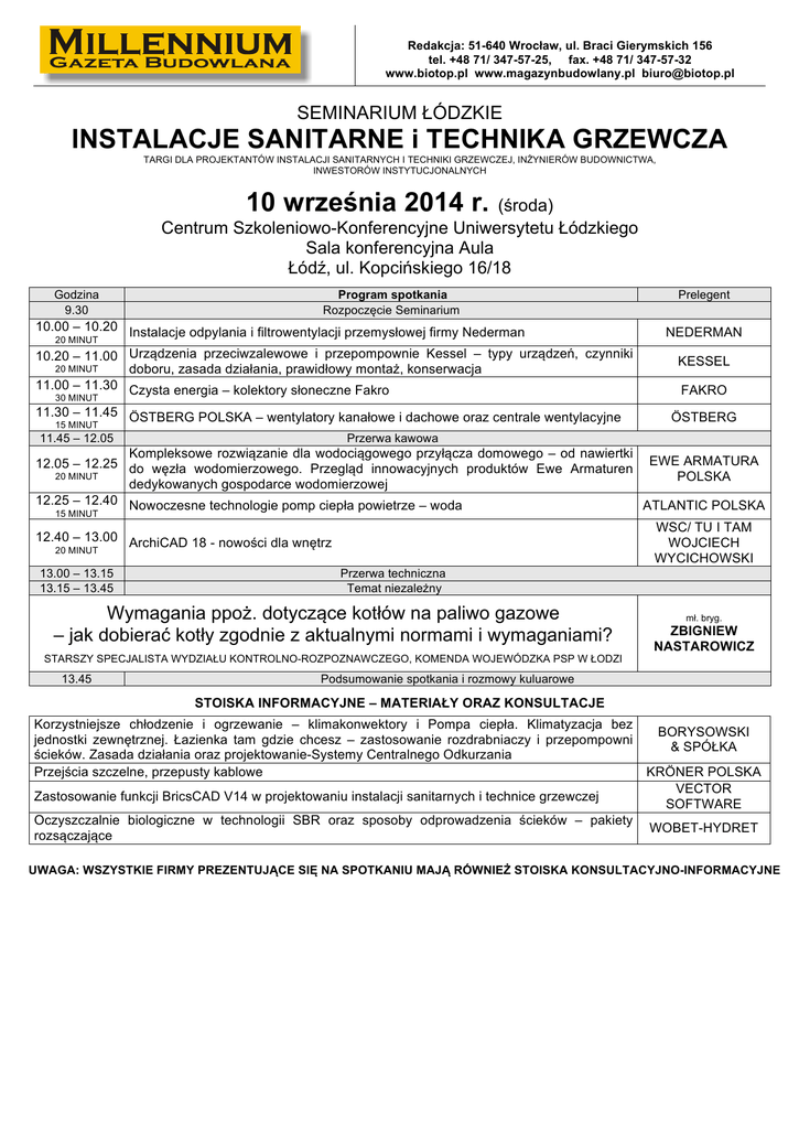 Redakcja: 51-640 Wrocław, ul. Braci Gierymskich 156 tel. +48 71/ 347-57-25, fax. +48 71/ 347-57-32 www.biotop.pl www.magazynbudowlany.pl [email protected] SEMINARIUM ŁÓDZKIE INSTALACJE SANITARNE i TECHNIKA GRZEWCZA TARGI DLA PROJEKTANTÓW INSTALACJI SANITARNYCH I TECHNIKI GRZEWCZEJ, INŻYNIERÓW BUDOWNICTWA, INWESTORÓW INSTYTUCJONALNYCH 10 września 2014 r. (środa) Centrum Szkoleniowo-Konferencyjne Uniwersytetu Łódzkiego Sala konferencyjna Aula Łódź, ul. Kopcińskiego 16/18 Godzina 9.30 Program spotkania Rozpoczęcie Seminarium 10.00 – 10.20 Instalacje odpylania i filtrowentylacji przemysłowej firmy Nederman 20 MINUT 10.20 – 11.00 Urządzenia przeciwzalewowe i przepompownie Kessel – typy urządzeń, czynniki 20 MINUT doboru, zasada działania, prawidłowy montaż, konserwacja 11.00 – 11.30 Czysta energia – kolektory słoneczne Fakro 30 MINUT 11.30 – 11.45 ÖSTBERG POLSKA – wentylatory kanałowe i dachowe oraz centrale wentylacyjne 15 MINUT 11.45 – 12.05 Prelegent NEDERMAN KESSEL FAKRO ÖSTBERG Przerwa kawowa Kompleksowe rozwiązanie dla wodociągowego przyłącza domowego – od nawiertki 12.05 – 12.25 do węzła wodomierzowego. Przegląd innowacyjnych produktów Ewe Armaturen EWE ARMATURA 20 MINUT POLSKA dedykowanych gospodarce wodomierzowej 12.25 – 12.40 Nowoczesne technologie pomp ciepła powietrze – woda ATLANTIC POLSKA 15 MINUT WSC/ TU I TAM WOJCIECH WYCICHOWSKI 12.40 – 13.00 ArchiCAD 18 - nowości dla wnętrz 20 MINUT 13.00 – 13.15 13.15 – 13.45 Przerwa techniczna Temat niezależny Wymagania ppoż. dotyczące kotłów na paliwo gazowe – jak dobierać kotły zgodnie z aktualnymi normami i wymaganiami? STARSZY SPECJALISTA WYDZIAŁU KONTROLNO-ROZPOZNAWCZEGO, KOMENDA WOJEWÓDZKA PSP W ŁODZI 13.45 mł. bryg. ZBIGNIEW NASTAROWICZ Podsumowanie spotkania i rozmowy kuluarowe STOISKA INFORMACYJNE – MATERIAŁY ORAZ KONSULTACJE Korzystniejsze chłodzenie i ogrzewanie – klimakonwektory i Pompa ciepła. Klimatyzacja bez jednostki zewnętrznej. Łazienka tam gdzie chcesz – zastosowanie rozdrabniaczy i przepompowni ścieków. Zasada działania oraz projektowanie-Systemy Centralnego Odkurzania Przejścia szczelne, przepusty kablowe Zastosowanie funkcji BricsCAD V14 w projektowaniu instalacji sanitarnych i technice grzewczej Oczyszczalnie biologiczne w technologii SBR oraz sposoby odprowadzenia ścieków – pakiety rozsączające BORYSOWSKI & SPÓŁKA KRÖNER POLSKA VECTOR SOFTWARE WOBET-HYDRET UWAGA: WSZYSTKIE FIRMY PREZENTUJĄCE SIĘ NA SPOTKANIU MAJĄ RÓWNIEŻ STOISKA KONSULTACYJNO-INFORMACYJNE