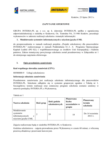 Kraków, 23 lipiec 2013 r. ZAPYTANIE OFERTOWE GRUPA INTERIA.PL sp. z o.o. sp. k. (dawniej: INTERIA.PL spółka z ograniczoną odpowiedzialnością) z siedzibą w Krakowie, Os. Teatralne 9A, 31-946 Kraków, poszukuje wykonawców w zakresie realizacji szkolenia z tematyki informatyki: 1. Modelowanie systemów informatycznych z użyciem języka UML do przeprowadzenia w ramach realizacji projektu „Projekt szkoleniowy dla pracowników INTERIA.PL” realizowanego w ramach Poddziałania 8.1.1. A Programu Operacyjnego Kapitał Ludzki (PO KL) i współfinansowanego ze środków Unii Europejskiej i budżetu państwa. Zakres tematyczny powyższego szkolenia został przedstawiony w Załączniku nr 1 do niniejszego zapytania ofertowego. I. Opis przedmiotu zamówienia Kod wspólnego słownika zamówień (CPV): 80500000-9 Usługi szkoleniowe Informacje odnośnie zamówienia Przedmiotem zamówienia jest realizacja szkolenia informatycznego dla pracowników INTERIA.PL. Szkolenie odbędzie się w systemie grupowym zgodnie z Tabelą nr 1. Szczegółowy termin realizacji oraz ostateczny program szkolenia zostanie ustalony w umowie pomiędzy INTERIA.PL a Wykonawcą. Tabela nr 1 Nazwa szkolenia Ilość grup Modelowanie systemów 2 informatycznych z użyciem języka UML Ilość godzin szkoleniowych Planowana liczba uczestników w grupie 24 10 Planowany termin szkolenia Do 14 września 2013 r. Zajęcia realizowane będą w siedzibie INTERIA.PL w Krakowie. Godzina szkoleniowa – zajęcia prowadzone przez Wykonawcę w czasie 60 minut, z wliczoną przerwą obiadową i przerwami kawowymi. II. Warunki udziału w postępowaniu O wykonanie zamówienia mogą ubiegać się wykonawcy, spełniający warunek: 1. Posiadania uprawnień do wykonywania określonej działalności lub czynności, jeżeli przepisy prawa nakładają obowiązek ich posiadania. 2. Dysponowania odpowiednim potencjałem kadrowym do wykonania zamówienia tj. trenerami, wskazanymi do niniejszego projektu, z których każdy: a) posiada niezbędną wiedzę i doświadczenie w prowadzeniu szkoleń (co najmniej 100 godzin szkoleniowych) z zakresu wskazanego w Zapytaniu Ofertowym, b) ukończył studia wyższe z zakresu informatyki lub kierunków pokrewnych. III. W ramach umowy na realizację szkolenia wykonawca zostanie zobowiązany min. do: 1. Przygotowania programu szkoleń z zakresem merytorycznym. 2. Prowadzenia list obecności (zawierających niezbędne logotypy wg wytycznych dotyczących oznaczania projektów w ramach POKL). 3. Archiwizacji wszystkich dokumentów związanych z realizowanym projektem, zgodnie z obowiązującymi w tym zakresie przepisami. 4. Umożliwienia przeprowadzenia kontroli projektu przez Wojewódzki Urząd Pracy w Krakowie jaki i inne instytucje kontrolne wyznaczone przez WUP Kraków i Instytucję Zarządzającą. 5. Zapewnienia materiałów szkoleniowych niezbędnych do realizacji szkoleń oraz ich oznakowania zgodnie z wytycznymi dotyczącymi oznaczania projektów w ramach POKL. 6. Przeprowadzenia testów kompetencji z danego tematu szkolenia w dniu rozpoczęcia oraz w dniu zakończenia szkolenia wraz z analizą i oceną 5 dni po przeprowadzeniu szkolenia. 7. Przeprowadzenia szkoleń i wydania certyfikatów po ukończonych szkoleniach, potwierdzających ukończenie szkoleń (zawierających niezbędne logotypy wg wytycznych dotyczących oznaczania projektów w ramach POKL). IV. Oferta powinna zawierać: 1. Aktualny odpis z właściwego rejestru albo aktualne zaświadczenie o wpisie do ewidencji działalności gospodarczej o której mowa w punkcie 1 rozdziału II (kopia potwierdzona „za zgodność z oryginałem”). 2. Informacje nt. trenera/trenerów (Curriculum Vitae) który zostanie przydzielony do niniejszego projektu. Dokumentacja musi zawierać informacje pozwalające stwierdzić, iż został zrealizowany warunek posiadania wiedzy, o której mowa w punkcie 2 rozdziału II. 3. Zaświadczenia lub oświadczenia potwierdzające doświadczenia trenerów w realizowaniu szkoleń oraz projektów w tematyce zgodnej z przedmiotem zamówienia w ostatnich 3 latach w szczególności doświadczenie w branży IT i portalach internetowych (o ile Oferent posiada). 4. Oświadczenie poparte rekomendacjami (z zastrzeżeniem, że liczba referencji nie może przekroczyć 10) o wykonywaniu usług, o wartości co najmniej 10 000 zł netto, polegających na przygotowaniu i realizacji szkoleń z informatyki, w okresie ostatnich 3 lat (o ile Oferent posiada). 5. Program przedmiotowego szkolenia, zawierający planowane techniki prowadzenia zajęć oraz metody dydaktyczne zaplanowane w trakcie szkolenia. 6. Całościową ofertę cenową netto zawierającą m.in. cenę szkoleń wraz z wszystkimi elementami wymienionymi w pkt. 1-7 rozdziału III. Cena powinna uwzględniać koszty noclegów, wyżywienia oraz koszty dojazdu trenerów na miejsce szkolenia. 7. Oświadczenie o braku powiązań następującej treści: Oświadczam, że firma (wstawić nazwę) nie jest powiązana kapitałowo lub osobowo z GRUPA INTERIA.PL sp. z o.o. sp. k. lub osobami upoważnionymi do zaciągania zobowiązań w imieniu GRUPA INTERIA.PL sp. z o.o. sp. k. lub osobami wykonującymi w imieniu GRUPA INTERIA.PL sp. z o.o. sp. k. czynności związane z przygotowaniem i przeprowadzeniem procedury wyboru wykonawcy a wykonawcą, polegające w szczególności na: uczestniczeniu w spółce jako wspólnik spółki cywilnej lub spółki osobowej; posiadaniu co najmniej 10 % udziałów lub akcji; pełnieniu funkcji członka organu nadzorczego lub zarządzającego, prokurenta; pełnomocnika; pozostawaniu w związku małżeńskim, w stosunku pokrewieństwa lub powinowactwa w linii prostej, pokrewieństwa lub powinowactwa w linii bocznej do drugiego stopnia lub w stosunku przysposobienia, opieki lub kurateli. 8. Termin ważności oferty. V. Opis sposobu przygotowania oferty 1. Ofertę należy sporządzić w oryginale w języku polskim z zachowaniem formy pisemnej. 2. Treść oferty musi odpow
