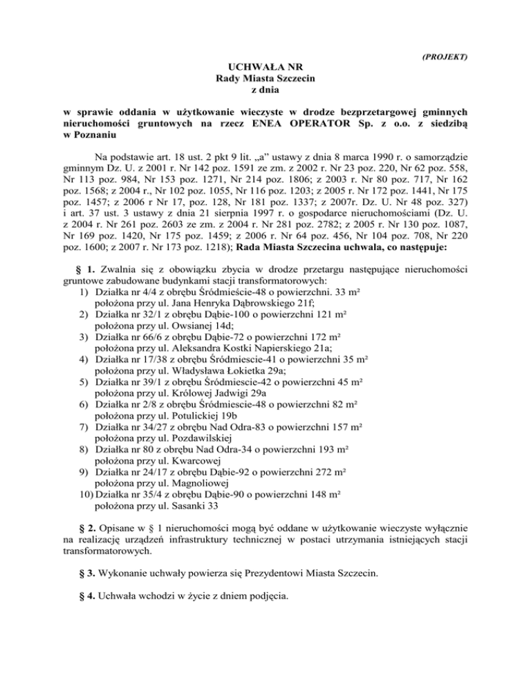 UCHWAŁA NR Rady Miasta Szczecin z dnia w sprawie oddania w u