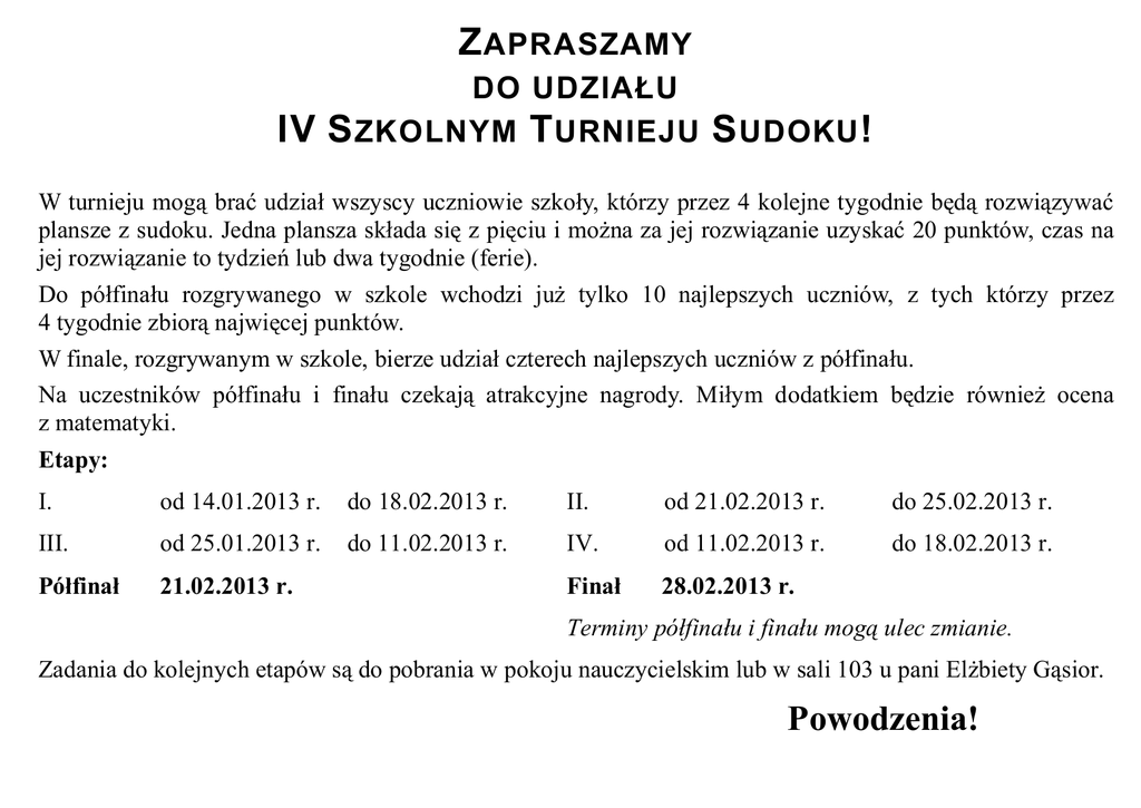 Z APRASZAMY IV DO UDZIAŁU S ZKOLNYM T URNIEJU S UDOKU ! W turnieju mogą brać udział wszyscy uczniowie szkoły, którzy przez 4 kolejne tygodnie będą rozwiązywać plansze z sudoku. Jedna plansza składa się z pięciu i można za jej rozwiązanie uzyskać 20 punktów, czas na jej rozwiązanie to tydzień lub dwa tygodnie (ferie). Do półfinału rozgrywanego w szkole wchodzi już tylko 10 najlepszych uczniów, z tych którzy przez 4 tygodnie zbiorą najwięcej punktów. W finale, rozgrywanym w szkole, bierze udział czterech najlepszych uczniów z półfinału. Na uczestników półfinału i finału czekają atrakcyjne nagrody. Miłym dodatkiem będzie również ocena z matematyki. Etapy: I. od 14.01.2013 r. do 18.02.2013 r. II. od 21.02.2013 r. do 25.02.2013 r. III. od 25.01.2013 r. do 11.02.2013 r. IV. od 11.02.2013 r. do 18.02.2013 r. Półfinał 21.02.2013 r. Finał 28.02.2013 r. Terminy półfinału i finału mogą ulec zmianie. Zadania do kolejnych etapów są do pobrania w pokoju nauczycielskim lub w sali 103 u pani Elżbiety Gąsior. Powodzenia!