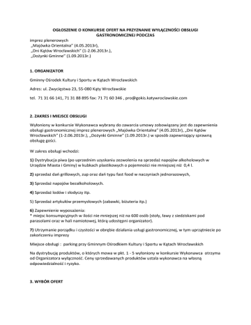 OGŁOSZENIE O KONKURSIE OFERT NA PRZYZNANIE WYŁĄCZNOŚCI OBSŁUGI GASTRONOMICZNEJ PODCZAS imprez plenerowych „Majówka Orientalna” (4.05.2013r), „Dni Kątów Wrocławskich” (1-2.06.2013r.), „Dożynki Gminne” (1.09.2013r.) 1. ORGANIZATOR Gminny Ośrodek Kultury i Sportu w Kątach Wrocławskich Adres: ul. Zwycięstwa 23, 55-080 Kąty Wrocławskie tel. 71 31 66 141, 71 31 88 895 fax: 71 71 60 346 , [email protected] 2. ZAKRES I MIEJSCE OBSŁUGI Wyłoniony w konkursie Wykonawca wybrany do zawarcia umowy zobowiązany jest do zapewnienia obsługi gastronomicznej imprez plenerowych „Majówka Orientalna” (4.05.2013r), „Dni Kątów Wrocławskich” (1-2.06.2013r.), „Dożynki Gminne” (1.09.2013r.) w sposób zapewniający sprawną obsługę gości. W zakres obsługi wchodzi: 1) Dystrybucja piwa (po uprzednim uzyskaniu zezwolenia na sprzedaż napojów alkoholowych w Urzędzie Miasta i Gminy) w kubkach plastikowych o pojemności nie mniejszej niż 0,4 l. 2) sprzedaż dań grillowych, zup oraz dań typu fast food w naczyniach jednorazowych, 3) Sprzedaż napojów bezalkoholowych. 4) Sprzedaż lodów i słodyczy itp. 5) Sprzedaż artykułów przemysłowych (zabawki, biżuteria itp.) 6) Zapewnienie wyposażenia: * miejsc konsumpcyjnych w ilości nie mniejszej niż na 600 osób (stoły, ławy z siedziskami pod parasolami oraz w hali namiotowej, którą udostępni organizator). 7) Utrzymanie porządku i czystości w obrębie działania usługi gastronomicznej, w tym uprzątniecie po zakończeniu imprezy Miejsce obsługi : parking przy Gminnym Ośrodkiem Kultury i Sportu w Kątach Wrocławskich Na dystrybucję produktów, o których mowa w pkt. 1 - 5 wyłoniony w konkursie Wykonawca otrzyma od Organizatora wyłączność. Ceny sprzedawanych produktów ustala wykonawca na własną odpowiedzialność i ryzyko. 3. WYBÓR OFERT Wykonawca, którego oferta zostanie uznana za najkorzystniejszą powiadomiony zostanie o tym fakcie telefonicznie bądź e-mail i zaproszony do zawarcia umowy w terminie i miejscu wskazanym przez Organizatora. W przypadku nie przystąpienia do zawarcia umowy zgodnej z załączonym projektem, Organizator zaproponuje zawarcie umowy kolejnemu Wykonawcy, który zaproponował najkorzystniejszą ofertę. 4. PROCEDURA 4.1 Tryb udzielenia zamówienia – konkurs ofert. 4.2 Kryteria oceny ofert: podstawowym kryterium wyboru oferty jest jej cena dodatkowym kryterium wyboru jest asortyment proponowanych stoisk. Podana cena ma być ceną brutto zawierającą VAT zgodnie z aktualnymi przepisami 4.3 Termin i miejsce składania ofert : 29 marca 2013 r., do godz. 15:00 w sekretariacie GOKiS, ul. Zwycięstwa 23. W przypadku składania oferty za pośrednictwem poczty lub kuriera brana jest pod uwagę data i godzina jej dostarczenia do siedziby Organizatora. 4.4 Termin związania ofertą: wynosi 30 dni od upływu terminu składania ofert. 5. SPOSÓB PRZYGOTOWANIA OFERTY 5.1 Oferta musi być złożona Organizatorowi w zaklejonej kopercie podpisanej „Konkurs ofert na obsługę gastronomiczną - imprez GOKiS 2013 Ofertę można składać osobiście lub za pośrednictwem poczty. 5.2 Oferta wraz z załącznikami musi być podpisana przez osobę upoważnioną do reprezentowania Wykonawcy na zewnątrz. 6. DOKUMENTY SKŁADAJĄCE SIĘ NA OFERTĘ a) Formularz oferty b) Propozycja stoisk d) Aktualna decyzja o wpisie zakładu do rejestru zakładów podlegających kontroli Państwowej Inspekcji Sanitarnej e) Zaświadczenie o wpisie do ewidencji podmiotów prowadzących działalność gospodarczą. mgr Maria Mach Dyrektor GOKiS Kąty Wrocławskie, 19.03.2013 r.