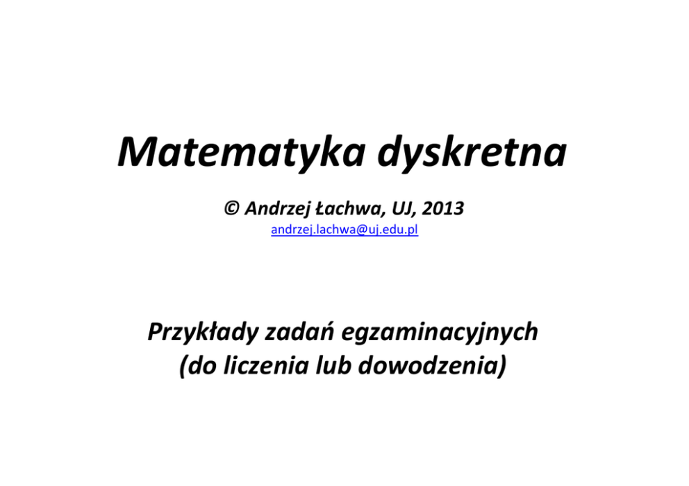 Matematyka dyskretna © Andrzej Łachwa, UJ, 2013 [email protected] Przykłady zadań egzaminacyjnych (do liczenia lub dowodzenia) 1. Ile układów kart w pokerze to „Dwie pary”? Dwie pary to układ 5 kart wylosowanych z talii 52 kart, w którym występują dwie karty tej samej wysokości (np. dwa walety), dwie karty innej, lecz między sobą znów tej samej wysokości (np. dwie ósemki), oraz karta piąta, jeszcze innej wysokości niż tamte (np. król). A zatem nie może to być układ zwany Fulem (3+2) ani układ zwany Czwórką (4+1). 2. Oszacuj od góry liczbę 19! (użyj oszacowania Gaussa). 3. Jaki jest najkrótszy cykl w klice K10? 4. Ile rozwiązań w dziedzinie liczb naturalnych ma równanie s1 + s2 + s3 = 10. Zaproponuj rozwiązanie, w którym modelem są drogi w mieście, gdzie ulice przecinają się pod kątem prostym. 5. Osiemnaście osób uczestniczy w grze polegającej na wylosowaniu 2 kart z talii 52 kart. Każda osoba losuje karty z całej talii. Wynik losowania to suma uzyskanych punktów (za dwójkę mamy 2 punkty, za trójkę 3 punkty, itd., aż do dziesiątki za 10 punktów; za figury otrzymujemy także po 10 punktów). Wygrywają te osoby, które mają taki sam wynik. Czy zdarzy się gra w której nikt nie wygra (odpowiedź uzasadnij)? Jakie jest prawdopodobieństwo wyniku 20 punktów? 6. Ile wynosi B4 (liczba Bella)? 7. Mamy 7 klocków z napisami 1,2,2,4,4,4,7. Ile 7-cyfrowych liczb możemy ułożyć z tych klocków? 8. Policz sumę Σ k=0..n (5 – 2∙k) stosując prawa sumowania. 9. Oszacuj sumę Σ k=0..20 k∙(–2)k ze wzoru na sumowanie przez części. 10. Policz Δ(2xx3) na dwa sposoby: z definicji i ze wzoru na różnicowanie przez części. 11. Rozłóż liczby 4899 i 6396 na czynniki pierwsze i wyznacz NWP. 12. Sprawdź, czy to prawda, że log 223344 < lg 234 13. Znajdź funkcję odwrotną do h(x)=(x-2)3 14. Ile cyfr ma liczba dziesiętna k? 15. Ile jest różnych podziałów zbioru 11 elementowego na 10 bloków? 16. Udowodnij, że 2n jest O(n!). 17. Policz (jako funkcję liniową złotej liczby ). 18. Policz Δ(3xx2) ze wzoru na różnicowanie iloczynu funkcji, a następnie oblicz wartość tej różnicy dla x=6. 19. Przeczytaj litery greckie 20. Znajdź x, y takie, że ax+by=NWD(a,b), gdzie a=54, b=99. 21. Udowodnij, że 6 | 8n — 2n dla wszystkich liczb naturalnych. 22. Ile układów kart w pokerze to „Trójka”? Trójka to układ 5 kart wylosowanych z talii 52 kart, w którym występują trzy karty tej samej wysokości (np. trzy walety) i dwie karty różnej wysokości między sobą i różnej od tamtych trzech. 23. Na ile sposobów można wybrać 7 cukierków o trzech smakach? 24. Policz Δ(3x3 – 2x + 1) (najpierw przedstaw wielomian jako kombinację dolnych silni a następnie wykorzystaj wzór na różnicę dolnej silni). 25. Rozłóż permutację na cykle: n 0 1 2 3 4 5 6 α(n) 0 2 3 6 5 4 1 26. Znajdź postać zwartą wzoru: s0 = 0 s1 = ‐10 sn+2 = ‐3∙sn+1+4∙sn 27. Policz sumę Σ k=0..100 (2∙k +1)∙(–1)k ze wzoru na sumowanie przez części. ─ 28. Mamy funkcję NN N o postaci f(n,k) = min(n,k). Znajdź f (4). 29. Ile wynosi suma wyrazów ciągu Fibonacciego od 5 do 15-tego, czyli 5+8+13+21+34+55+89+144+233+377+610 (proszę tego nie dodawać, tylko użyć wzoru)? 30. Pokaż, że 212-1 nie jest liczbą pierwszą i rozłóż na czynniki (wykorzystaj małe twierdzenie Fermata). 31. Oszacuj wartość s20 mając dany wzór rekurencyjny: s0 = 7 s1 = 2 sn+2 = sn+1+2∙sn 32. Rozwiąż równanie: (3x‐4)/5= (x‐2)/3. 33. Pokaż, że wszystkie funkcje logarytmiczne są asymptotycznie podobne. 34. Co oznacza współczynnik 0, 3, 60, 0, 4 ? Ile wynosi? 35. Ile jest liczb naturalnych nie większych od 300, podzielnych przez 2 lub przez 3, lub przez 5 (wykorzystaj zasadę włączania i wyłączania)? 36. Ile transpozycji ma dowolna permutacja typu [13 22 34 41]? 37. Na ile sposobów możemy skomponować deser złożony z 7 gałek lodów, gdy do wyboru są 3 smaki (kolejność nie ma znaczenia)? 38. Niech x, y dowolne liczby rzeczywiste i x<y. Ile liczb całkowitych zawiera przedział [x, y)? 39. a +1 Udowodnij, że ∑ g (x) δx=g ( a) . a 40. Zgodnie z przepisami ordynacji podatkowej podstawy opodatkowania, kwoty podatków, odsetki za zwłokę i pewne inne opłaty oraz wynagrodzenia zaokrągla się do pełnych złotych w ten sposób, że końcówki kwot wynoszące mniej niż 50 groszy pomija się, a końcówki kwot wynoszące 50 i więcej groszy podwyższa się do pełnych złotych. Jeżeli wyliczona kwota podlegająca takiemu zaokrągleniu podana jest w formacie dodatniej dziesiętnej liczby rzeczywistej x, to jaki jest wzór na liczbę zaokrągloną z(x)? Użyj funkcji podłogi lub sufitu.