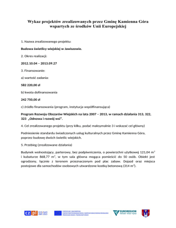 Wykaz projektów zrealizowanych przez Gminę Kamienna Góra wspartych ze środków Unii Europejskiej 1. Nazwa zrealizowanego projektu: Budowa świetlicy wiejskiej w Jawiszowie. 2. Okres realizacji: 2012.10.04 – 2013.09.27 3. Finansowanie: a) wartość zadania: 582 220,00 zł b) kwota dofinansowania 242 750,00 zł c) źródło finansowania (program, instytucja współfinansująca) Program Rozwoju Obszarów Wiejskich na lata 2007 – 2013, w ramach działania 313, 322, 323 „Odnowa i rozwój wsi”. 4. Cel zrealizowanego projektu (przy kilku, podać maksymalnie 3 i wskazać cel główny) Podniesienie standardu świadczonych usług kulturalnych przez Gminę Kamienna Góra, poprzez budowę dwóch świetlic wiejskich. 5. Przebieg (zrealizowane działania) Budynek wolnostojący, parterowy, bez podpiwniczenia, o powierzchni użytkowej 121,04 m 2 i kubaturze 868,77 m3, w tym sala główna mogąca pomieścić do 50 osób. Obiekt jest ogrodzony, łącznie z terenem przeznaczonym pod plac zabaw. Dojazd oraz miejsca postojowe dla samochodów osobowych utwardzone kostką betonową (314 m 2). Wykaz projektów zrealizowanych przez Gminę Kamienna Góra wspartych ze środków Unii Europejskiej 1. Nazwa zrealizowanego projektu: Budowa w Krzeszowie parkingu wraz z małą architekturą oraz modernizacja sanitariatu w ramach projektu pn.: „Południowo-zachodni Szlak Cysterski”. 2. Okres realizacji: 2011.02.24 – 2011.08.12 3. Finansowanie: a) wartość zadania: 1 067 789,00 zł b) kwota dofinansowania 904 444,00 zł c) źródło finansowania (program, instytucja współfinansująca) EFRR w ramach Działania 6.4 Inwestycje w produkty turystyczne o znaczeniu ponadregionalnym Programu Operacyjnego Innowacyjna Gospodarka 2007-2013 4. Cel zrealizowanego projektu (przy kilku, podać maksymalnie 3 i wskazać cel główny) 5. Przebieg (zrealizowane działania) Wybudowano parking na 9 autobusów, 44 samochody osobowe, zatokę autobusową, 7 punktów świetlnych oraz zmodernizowano pomieszczenia sanitariatu w domu kultury. Łaczna powierzchnia nawierzchni z kostki betonowej 4671 m 2, powierzchnia terenów zielonych 2827 m2. Wykaz projektów zrealizowanych przez Gminę Kamienna Góra wspartych ze środków Unii Europejskiej 1. Nazwa zrealizowanego projektu: Wymiana podłogi w świetlicy wiejskiej w Gorzeszowie. 2. Okres realizacji: 2011.08.05 – 2011.09.30 3. Finansowanie: a) wartość zadania: 22 932,00 zł b) kwota dofinansowania 12 717,00 zł c) źródło finansowania (program, instytucja współfinansująca) Program Rozwoju Obszarów Wiejskich na lata 2007 – 2013, w ramach działania 413, Wdrażanie Lokalnych Strategii Rozwoju dla małych projektów, tj. operacji, które nie odpowiadają warunkom przyznania pomocy w ramach działań Osi 3 ale przyczyniają się do osiągnięcia celów tej osi. 4. Cel zrealizowanego projektu (przy kilku, podać maksymalnie 3 i wskazać cel główny) Rozwijanie aktywności społeczności lokalnej oraz umożliwienie mieszkańcom kultywowania miejscowych tradycji, obrzędów i zwyczajów w świetlicy wiejskiej przez wykonanie robót budowlanych związanych z wymianą podłogi. 5. Przebieg (zrealizowane działania) Wykonano w sali głównej podłogę z paneli (98 m 2), wymieniono drzwi wejściowe oraz odnowiono zaplecze kuchenne. Wykaz projektów zrealizowanych przez Gminę Kamienna Góra wspartych ze środków Unii Europejskiej 1. Nazwa zrealizowanego projektu: Roboty budowlane związane z wydzieleniem kotłowni gazowej wraz z remontem instalacji c.o. w świetlicy w Leszczyńcu. 2. Okres realizacji: 2011.05.26 – 2011.08.04 3. Finansowanie: a) wartość zadania: 93 975,00 zł b) kwota dofinansowania 47 843,00 zł c) źródło finansowania (program, instytucja współfinansująca) Program Rozwoju Obszarów Wiejskich na lata 2007 – 2013, w ramach działania 413, Wdrażanie Lokalnych Strategii Rozwoju dla operacji, które odpowiadają warunkom przyznania pomocy w ramach działania „Odnowa i rozwój wsi”. 4. Cel zrealizowanego projektu (przy kilku, podać maksymalnie 3 i wskazać cel główny) Zaspokojenie potrzeb społecznych i kulturowych mieszkanców wsi poprzez remont świetlicy wiejskiej – miejsca spotkań na terenie miejscowości. 5. Przebieg (zrealizowane działania) Wykonano remont instalacji centralnego ogrzewania, nową kotłownię z kotłem gazowym oraz zbiornik na gaz. Wykaz projektów zrealizowanych przez Gminę Kamienna Góra wspartych ze środków Unii Europejskiej 1. Nazwa zrealizowanego projektu: Roboty budowlane w świetlicy wiejskiej w Ogorzelcu. 2. Okres realizacji: 2011.05.23 – 2011.09.05 3. Finansowanie: a) wartość zadania: 102 448,00 zł b) kwota dofinansowania 52 157,00 zł c) źródło finansowania (program, instytucja współfinansująca) Program Rozwoju Obszarów Wiejskich na lata 2007 – 2013, w ramach działania 413, Wdrażanie Lokalnych Strategii Rozwoju dla operacji, które odpowiadają warunkom przyznania pomocy w ramach działania „Odnowa i rozwój wsi”. 4. Cel zrealizowanego projektu (przy kilku, podać maksymalnie 3 i wskazać cel główny) Zaspokojenie potrzeb społecznych i kulturowych mieszkanców wsi poprzez remont świetlicy wiejskiej – miejsca spotkań na terenie miejscowości. 5. Przebieg (zrealizowane działania) Wykonano remont sali głównej i zaplecza sanitarnego. Remont obejmował również wykonanie sufitu wraz z dociepleniem nad salą główną. Wykaz projektów zrealizowanych przez Gminę Kamienna Góra wspartych ze środków Unii Europejskiej 1. Nazwa zrealizowanego projektu: Budowa świetlicy wiejskiej wraz z zapleczem szatniowo-sanitarnym w Przedwojowie. 2. Okres realizacji: 2011.04.05 – 2011.09.30 3. Finansowanie: a) wartość zadania: 1 407 128,00 zł b) kwota dofinansowania 500 000,00 zł c) źródło finansowania (program, instytucja współfinansująca) Program Rozwoju Obszarów Wiejskich na lata 2007 – 2013, w ramach działania 313, 322, 323 „Odnowa i rozwój wsi”. 4. Cel zrealizowanego proje