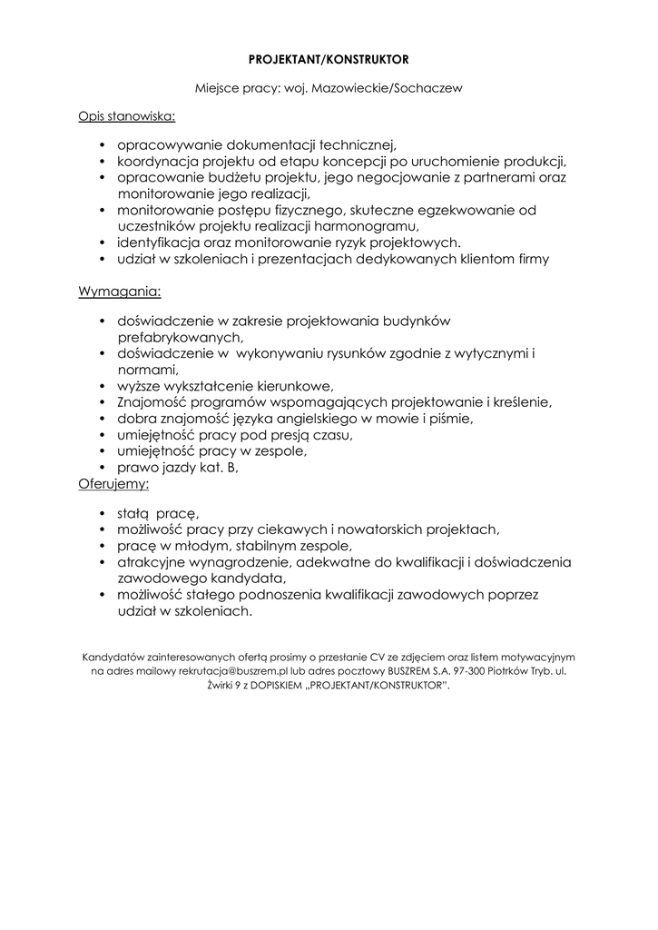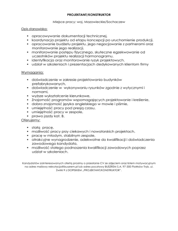 PROJEKTANT/KONSTRUKTOR Miejsce pracy: woj. Mazowieckie/Sochaczew Opis stanowiska: • opracowywanie dokumentacji technicznej, • koordynacja projektu od etapu koncepcji po uruchomienie produkcji, • opracowanie budżetu projektu, jego negocjowanie z partnerami oraz monitorowanie jego realizacji, • monitorowanie postępu fizycznego, skuteczne egzekwowanie od uczestników projektu realizacji harmonogramu, • identyfikacja oraz monitorowanie ryzyk projektowych. • udział w szkoleniach i prezentacjach dedykowanych klientom firmy Wymagania: • doświadczenie w zakresie projektowania budynków prefabrykowanych, • doświadczenie w wykonywaniu rysunków zgodnie z wytycznymi i normami, • wyższe wykształcenie kierunkowe, • Znajomość programów wspomagających projektowanie i kreślenie, • dobra znajomość języka angielskiego w mowie i piśmie, • umiejętność pracy pod presją czasu, • umiejętność pracy w zespole, • prawo jazdy kat. B, Oferujemy: • • • • stałą pracę, możliwość pracy przy ciekawych i nowatorskich projektach, pracę w młodym, stabilnym zespole, atrakcyjne wynagrodzenie, adekwatne do kwalifikacji i doświadczenia zawodowego kandydata, • możliwość stałego podnoszenia kwalifikacji zawodowych poprzez udział w szkoleniach. Kandydatów zainteresowanych ofertą prosimy o przesłanie CV ze zdjęciem oraz listem motywacyjnym na adres mailowy [email protected] lub adres pocztowy BUSZREM S.A. 97-300 Piotrków Tryb. ul. Żwirki 9 z DOPISKIEM „PROJEKTANT/KONSTRUKTOR”.