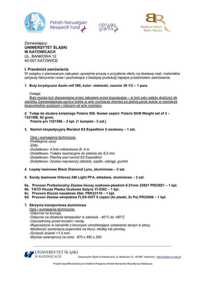Zamawiający: UNIWERSYTET ŚLĄSKI W KATOWICACH UL. BANKOWA 12 40-007 KATOWICE I. Przedmiot zamówienia W związku z planowanym zakupem uprzejmie proszę o przysłanie oferty na dostawę nast. materiałów (artykuły fabrycznie nowe i pochodzące z bieżącej produkcji) będące przedmiotem zamówienia: 1. Buty turystyczne Asolo mtf 500, kolor: niebieski, rozmiar 39 1/3 – 1 para. Uwaga: Buty muszą być dopasowane przez zakupem przez kupującego – w tym celu należy dostczyć do siedziby Zamawiającego oprócz butów w w/w rozmiarze również po jednej parze butów w rozmiarze bezpośrednio wyższym i niższym od w/w rozmiaru. 2. Tuleje do skutera śnieżnego Polaris 550. Numer części: Polaris Shift Weight set of 3 – 1321586, 62 gram, Polaris p/n 1321586 – 2 kpl. (1 komplet - 3 szt.) 3. Namiot ekspedycyjny Marabut K2 Expedition 3-osobowy – 1 szt. Opis i wymagania techniczne: -Podklejone szwy -Żółty -Dodatkowo- 4 linki odblaskowe dł. 4 m -Dodatkowo- Tulejka reperacyjna do stelaża alu 9,5 mm -Dodatkowo- Płachta pod namiot K2 Expedition -Dodatkowo- Zestaw naprawczy (śledzie, szpilki, odciągi, gumki) 4. Łopaty lawinowe Black Diamond Lynx, aluminiowe – 3 szt. 5. Sondy lawinowe Ortovox 240 Light PFA, składane, aluminiowe – 2 szt. 6a. 6b. 6c. 6d. Proxxon Profesionalny Zestaw kluczy oczkowo-płaskich 6-21mm 23821 PR23821 – 1 kpl. YATO Klucze Płasko Oczkowe Satyna Yt-0362 – 1 kpl. Proxxon Klucze nasadowe 20el. PRK23110 – 1 kpl. Proxxon Zestaw wkrętaków FLEX-DOT 6 części (4x płaski, 2x Pz) PR22606 – 1 kpl. 7. Skrzynia transportowa aluminiowa Opis i wymagania techniczne: -Odporna na korozję. -Odporne na działanie temperatur w zakresie -40°C do +80°C -Uszczelniony przed kurzem i wodą. -Wyposażone w narożniki z tworzywa umożliwiające ustawianie skrzyń w stosy. -Możliwość zamknięcia pojemnika na klucz, kłódkę lub plombę. -Grubość ścianki >1,0 mm. -Wymiar wewnętrzny (w mm): 870 x 460 x 350 ______________________________________________________________________ Uniwersytet Śląski w Katowicach, ul. Bankowa 12, 40-007 Katowice, http://www.us.edu.pl Projekt współfinasowany ze środków Programu Polsko-Norweska Współpraca Badawcza -Wymiar zewnętrzny (w mm): 902 x 495 x 379 -Objętość 140-150 litrów -Ciężar <8,0 kg II. Oferta powinna zawierać: – cenę jednostkowa netto, wartość netto oraz wartość brutto ogółem obejmującą koszty artykułów oraz ich dostarczenia do siedziby Zamawiającego – warunki płatności (wymagana płatność przelewem po realizacji dostawy, w terminie minimum 14 dni od daty otrzymania przez Zamawiającego prawidłowo wystawionej faktury) – termin dostawy (wyrażony jako ilość dni od daty otrzymania zamówienia do dostawy) – okres gwarancji (wymagany okres gwarancji nie może być krótszy niż okres gwarancji udzielanej przez producenta) – dane adresowe firmy wraz z numerem NIP Oferentowi, który przedstawi najkorzystniejszą ofertę na dane (poszczególne) pozycje w/w wykazu zostanie przesłane zamówienie w formie pisemnej. Za najkorzystniejszą ofertę Zamawiający uzna ofertę zgodną z powyższymi wymaganiami Zamawiającego i z najniższą ceną. Po przeanalizowaniu ofert, Zamawiający zastrzega sobie prawo odstąpienia od wystawienia Zamówienia i zakupu artykułów bez podania przyczyny. Ofertę należy przesłać mailem do dnia 29.07.2013 r. do godziny 14.00 na adres osoby prowadzącej sprawę. Sprawę prowadzi: Leszek Walczak tel. 32/359-2242 [email protected] dot. wniosku 51157, 51201, 51202, 51203, 51204, 51205, 51238 ______________________________________________________________________ Uniwersytet Śląski w Katowicach, ul. Bankowa 12, 40-007 Katowice, http://www.us.edu.pl Projekt współfinasowany ze środków Programu Polsko-Norweska Współpraca Badawcza