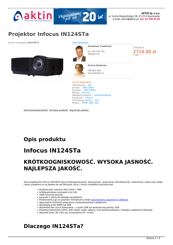 Projektor Infocus IN124STa Numer katalogowy:IN124STa Twój konsultant Arkadiusz Trzebiński tel. 503 030 555 [email protected] NOWOŚĆ W OFERCIE 2719.00 zł 2719.00 zł z VAT Karina Gładecka 796 603 606 [email protected] CECHY PRODUKTU: Interaktywny - Nie Jasność - 3001-4000 Kontrast - 1000-1999:1 Montaż - Ścienny Odległość projekcji - krótkoogniskowy Producent - InFocus Technologia obrazu - DLP Wejśce - HDMI, USB, VGA KRÓTKOOGNISKOWOŚĆ. WYSOKA JASNOŚĆ. NAJLEPSZA JAKOŚĆ. Opis produktu Infocus IN124STa KRÓTKOOGNISKOWOŚĆ. WYSOKA JASNOŚĆ. NAJLEPSZA JAKOŚĆ. Seria projektorów InFocus IN124STa łączy krótkoogniskowość, dużą jasność, opcjonalnie interaktywność, networking i niską cenę, dzięki czemu projektory te są idealne do sali lekcyjnej, biura i innych niewielkich pomieszczeń. Rozdzielczość natywna XGA (1024 x 768) Krótkoogniskowa soczewka (rzut 0.6) 3300 lumenów jasności Łączność z siecią dla łatwego zarządzania Przekonwertuj go na projektor interaktywny dzięki opcjonalnemu adapterowi LiteBoard. Opcjonalnie możliwość połączenia z bezprzewodowym adapterem. Wyświetlaj przez HDMI lub USB. Wyświetlaj bez użycia komputera – z dysku USB lub wewnętrznej pamięci 2GB Prezentuj dokumenty Office, pliki wideo, audio, zdjęcia i inne bezprzewodowo z Twojego urządzenia mobilnego. Wyświetl treści 3D z Blu-ray, komputerów PC i innych Dlaczego IN124STa? Strona 1 / 3 Duży, szerokoekranowy obraz z niewielkiej odległości bez przeszkadzających cieni Wysoka jasność, która zapewnia wyraźny obraz nawet przy zapalonym świetle Możliwość bezprzewodowego wyświetlania z urządzeń mobilnych za pomocą bezprzewodowego adaptera USB. Darmowa aplikacja EZ Display umożliwia Ci robienie adnotacji do dokumentów, które prezentujesz, za pomocą bezprzewodowego adaptera USB. Łączność z siecią dla łatwego zarządzania Opcja przekonwertowania na interaktywny projektor Bardzo duży kontrast – ciemniejsze cienie i jaśniejsza biel Wyświetlaj przez HDMI, USB, VGA i inne 2GB wewnętrznej pamięci umożliwia szybki dostęp do często odtwarzanych plików. Tryb Eco Blanking umożliwi Ci szybkie, zdalne przyciemnienie ekranu, by skierować uwagę odbiorców na prelegencie i zarazem przedłużyć żywotność lampy. Łatwe Odtwarzanie z Dowolnego Urządzenia WYŚWIETLAJ Z DYSKU USB LUB Z WEWNĘTRZNEJ PAMIĘCI Wbudowane aplikacje i opcjonalny adapter bezprzewodowy umożliwiają wyświetlanie plików z urządzeń z Androidem lub firmy Apple. Wyświetlaj zdjęcia, pliki audio i wideo z 2GB wewnętrznej pamięci projektora. Wyświetlaj bezpośrednio z dysku USB. Wyświetlaj przez HDMI, USB, VGA i inne Crestron RoomView Connected i technologia AMX Device Discovery, a także port RS232 dla łatwej łączności, programowania i kontroli. Postaw na jakość. TECHNOLOGIA TOP-NOTCH IMAGE JUŻ W TAK NISKIEJ CENIE Obraz o wysokiej jakości i realne kolory dzięki technologii DLP® i InFocus BrilliantColor™. Niesamowity kontrast 15000:1 dodaje ostrości, ściemniając czerń i zjaśniając biel. Dzięki specjalnym programom Twoja prezentacja będzie miała najwyższą jakość, niezależnie od powierzchni, na której wyświetlasz. Efekt 3D: wyświetlaj treści 3D z Blu-raya lub komputera PC za pośrednictwem HDMI – łatwiej pokażesz i wyjaśnisz złożone treści. Kompaktowa Moc KOMPAKTOWY ROZMIAR SPRAWIA, ŻE ŁATWO GO PRZENOSIĆ Z POMIESZCZENIA DO POMIESZCZENIA, A ZARAZEM JEST DOŚĆ MOCNY DO INSTALACJI 2GB wbudowanej pamięci pozwala Ci zapomnieć o komputerze. Prezentuj obrazy, zdjęcia i pliki wideo z dysku USB. Wejście HDMI dla szybkiego wyświetlania w wysokiej jakości przy użyciu cyfrowych urządzeń Wysoka jasność zda egzamin nawet przy dużym oświetleniu. Wbudowany głośnik i wyjście audio 3,5 mm zapewniają wyraźny dźwięk. Port RS232 oznacza łatwą integrację z układem sterowania w pomieszczeniu. Waży 7 funtów (3.17 kg) Infocus IN124STa - Krótkoogniskowy projektor XGA Dane techniczne: Strona 2 / 3 Technologia: DLP Rozdzielczość: XGA 1024x768 Jasność: 3300 Kontrast: 15000:1 Proporcje obrazu: 4:3 Żywotność lampy*: do 6000 h Szum pracy*: 30 dBA Współczynnik projekcji: 0.6:1 Zoom: stały Korekcja Keystone: ±40 stopni w pionie Lens Shift: Nie Głośniki: 1x 2W Waga (kg): 3,2 Gwarancja produktu: 2 lata Gwarancja lampy wbudowanej fabrycznie: 6 miesięcy Symbol lampy: SP-Lamp-087 Interfejs: Złącze HDMI: Tak Złącze VGA-In: Tak Złącze VGA-Out: Tak Złącze S-Video: Tak Złącze Kompozytowe: Tak Złącze Komponentowe: Nie Złącze USB-A (prezentacja bez PC): Nie Złącze R5232: Tak Złącze RJ45: Tak LiteBoard Interactive Port: Tak Łączność WiFi przez adapter USB (opcja)**: Tak Pamięć wewnętrzna: 2 GB *W trybie Eco **Wszystkie projektory InFocus opcjonalnie mogą łączyć bezprzewodowo przez bramkę LiteShow v.3/v.4 Strona 3 / 3 Powered by TCPDF (www.tcpdf.org)