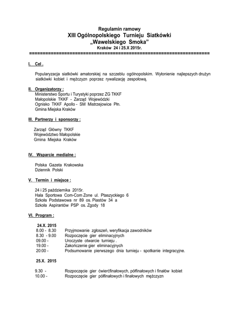 Regulamin ramowy XIII Ogólnopolskiego Turnieju Siatkówki „Wawelskiego Smoka” Kraków 24 i 25.X 2015r. =================================================================== I. Cel . Popularyzacja siatkówki amatorskiej na szczeblu ogólnopolskim. Wyłonienie najlepszych drużyn siatkówki kobiet i mężczyzn poprzez rywalizację zespołową. II. Organizatorzy : Ministerstwo Sportu i Turystyki poprzez ZG TKKF Małopolskie TKKF - Zarząd Wojewódzki Ognisko TKKF Apollo - SM Mistrzejowice Płn. Gmina Miejska Kraków III. Partnerzy i sponsorzy : Zarząd Główny TKKF Województwo Małopolskie Gmina Miejska Kraków IV. Wsparcie medialne : Polska Gazeta Krakowska Dziennik Polski V. Termin i miejsce : 24 i 25 października 2015r. Hala Sportowa Com-Com Zone ul. Ptaszyckiego 6 Szkoła Podstawowa nr 89 os. Piastów 34 a Szkoła Aspirantów PSP os. Zgody 18 VI. Program : 24.X. 2015 8.00 - 8.30 8.30 - 9.00 09.00 19.00 20:00 - Przyjmowanie zgłoszeń, weryfikacja zawodników Rozpoczęcie gier eliminacyjnych Uroczyste otwarcie turnieju . Zakończenie gier eliminacyjnych Podsumowanie pierwszego dnia turnieju - spotkanie integracyjne. 25.X. 2015 9.30 10.00 - Rozpoczęcie gier ćwierćfinałowych, półfinałowych i finałów kobiet Rozpoczęcie gier półfinałowych i finałowych mężczyzn 14.30 15.00 - Podsumowanie wyników , wręczenie pucharów , dyplomów i upominków. Zakończenie imprezy, wyjazd ekip. VII. Zasady uczestnictwa i zgłoszenia : 1. W turnieju uczestniczyć mogą : - Drużyny amatorskie mężczyzn i kobiet, - amatorzy oraz zawodnicy, którzy posiadają licencję PZPS za wyjątkiem zawodników I , II Plus Ligi. Dopuszcza się do udziału w turnieju dwóch zawodników Plus Ligi, którzy ukończyli 35 rok życia - posiadają aktualne badania lekarskie lub złożą pisemne oświadczenie o starcie w turnieju podpisane przez oboje rodziców lub prawnych opiekunów - dokonali wpłaty tytułem wpisowego, 2. Zgłoszenia : - pisemne zgłoszenia należy kierować na adres Małopolskiego TKKF w Krakowie ul. Lenartowicza 14 lub na adres : e mail tkkf @ tkkf.com - w zgłoszeniu należy podać : nazwę drużyny , imię i nazwisko , datę urodzenia zawodników. VIII. Sposób przeprowadzenia turnieju : - Turniej rozegrany zostanie zgodnie z przepisami PZPS z podziałem na grupy. - Szczegółowy system rozgrywek ustalony zostanie przed turniejem w zależności od ilości zgłoszonych drużyn, - Piłki do turnieju zapewnia organizator , do rozgrzewki zespoły winny posiadać własne piłki . IX. Klasyfikacja końcowa : Ustalona będzie na podstawie uzyskanych wyników osobno dla Kobiet , osobno dla Mężczyzn. X. Nagrody : I - IV miejsce - Puchary (smoki), upominki , dyplomy Pozostałe miejsca - okolicznościowe dyplomy. Dla wszystkich uczestniczących zespołów w turnieju przewidziane są okolicznościowe koszulki. XI. Zasady finansowania : - koszty związane z przeprowadzeniem imprezy pokrywają organizatorzy, - koszty dojazdu , wyżywienia , noclegu i opłaty startowej pokrywają uczestnicy we własnym zakresie. XII. Postanowienia końcowe : 1. Organizatorzy nie biorą odpowiedzialności za wypadki spowodowane złym stanem zdrowia startujących, 2. Kluby i uczestnicy winni ubezpieczyć się we własnym zakresie od następstw nieszczęśliwych wypadków. 3. Organizatorzy zapewniają opiekę medyczną i ubezpieczenie NNW. 4. Organizatorzy nie ponoszą odpowiedzialności za straty materialne powstałe w trakcie imprezy, 5. Sekretariat zawodów będzie czynny w godz. 8;00 - 18;00 w każdym dniu zawodów, 6. Wszystkie sprawy sporne rozstrzygać będzie „Komisja odwoławcza” złożona z trzech osób (sędzia główny, 2 przedstawicieli organizatorów) po wniesieniu wadium w wysokości 50 zł. 7. Organizatorzy zastrzegają sobie prawo ostatecznej interpretacji niniejszego regulaminu. Organizator