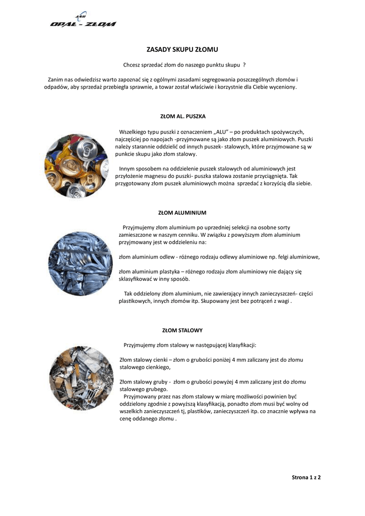 ZASADY SKUPU ZŁOMU Chcesz sprzedać złom do naszego punktu skupu ? Zanim nas odwiedzisz warto zapoznać się z ogólnymi zasadami segregowania poszczególnych złomów i odpadów, aby sprzedaż przebiegła sprawnie, a towar został właściwie i korzystnie dla Ciebie wyceniony. ZŁOM AL. PUSZKA Wszelkiego typu puszki z oznaczeniem „ALU” – po produktach spożywczych, najczęściej po napojach -przyjmowane są jako złom puszek aluminiowych. Puszki należy starannie oddzielić od innych puszek- stalowych, które przyjmowane są w punkcie skupu jako złom stalowy. Innym sposobem na oddzielenie puszek stalowych od aluminiowych jest przyłożenie magnesu do puszki- puszka stalowa zostanie przyciągnięta. Tak przygotowany złom puszek aluminiowych można sprzedać z korzyścią dla siebie. ZŁOM ALUMINIUM Przyjmujemy złom aluminium po uprzedniej selekcji na osobne sorty zamieszczone w naszym cenniku. W związku z powyższym złom aluminium przyjmowany jest w oddzieleniu na: złom aluminium odlew - różnego rodzaju odlewy aluminiowe np. felgi aluminiowe, złom aluminium plastyka – różnego rodzaju złom aluminiowy nie dający się sklasyfikować w inny sposób. Tak oddzielony złom aluminium, nie zawierający innych zanieczyszczeń- części plas kowych, innych złomów itp. Skupowany jest bez potrąceń z wagi . ZŁOM STALOWY Przyjmujemy złom stalowy w następującej klasyfikacji: Złom stalowy cienki – złom o grubości poniżej 4 mm zaliczany jest do złomu stalowego cienkiego, Złom stalowy gruby - złom o grubości powyżej 4 mm zaliczany jest do złomu stalowego grubego. Przyjmowany przez nas złom stalowy w miarę możliwości powinien być oddzielony zgodnie z powyższą klasyfikacją, ponadto złom musi być wolny od wszelkich zanieczyszczeń tj, plas ków, zanieczyszczeń itp. co znacznie wpływa na cenę oddanego złomu . Strona 1 z 2 ZŁOM MIEDZI W punkcie skupu przyjmujemy złom miedzi, poszczególne sorty klasyfikowane są przez naszych wykwalifikowanych pracowników. W przypadku większej ilości złom miedzi powinien być wstępnie oddzielony od wszelkich zanieczyszczeń i pozostałych złomów, co znacznie wpływa na cenę. ZŁOM MOSIĄDZU W punkcie skupu przyjmowany jest złom mosiądzu w postaci mosiądzu żółtegozłomu o zabarwieniu żółto- złotym, oraz mosiądzu pobiału – pobielanego cyną lub srebrem. W przypadku większej ilości oddawanego złomu mosiądzu ważne, aby w momencie przyjęcia w punkcie skupu sorty te były oddzielone , by z korzyścią dla siebie je sprzedać. Przyjmujemy również złom chłodnic samochodowych, zarówno mosiężnych jak i aluminiowych. Klasyfikowane są one w zależności od przewagi danego surowca w składzie na te, które stanowią mieszankę mosiądzu i miedzi, oraz na te które złożone są z aluminium. Nie powinny być zanieczyszczone innymi metalami. W razie wątpliwości dotyczących klasyfikacji złomu i innych odpadów nasi pracownicy obsługi punktu skupu służą profesjonalną pomocą . Zapraszamy.