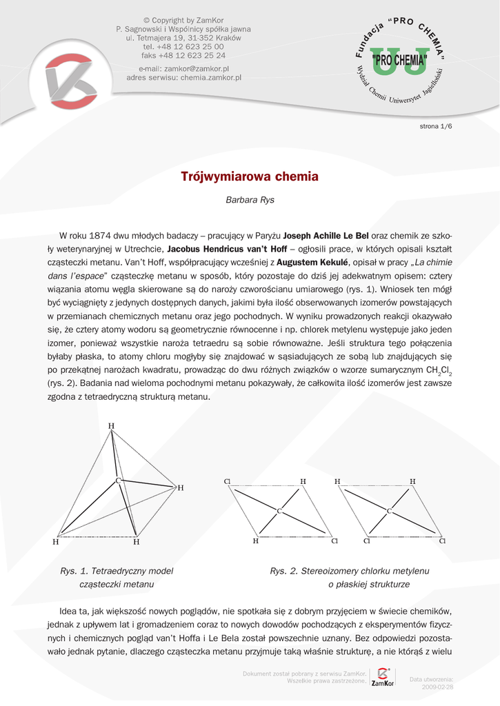 strona 1/6 Trójwymiarowa chemia Barbara Rys W roku 1874 dwu młodych badaczy – pracujący w Paryżu Joseph Achille Le Bel oraz chemik ze szkoły weterynaryjnej w Utrechcie, Jacobus Hendricus van’t Hoff – ogłosili prace, w których opisali kształt cząsteczki metanu. Van’t Hoff, współpracujący wcześniej z Augustem Kekulé, opisał w pracy „La chimie dans l’espace” cząsteczkę metanu w sposób, który pozostaje do dziś jej adekwatnym opisem: cztery wiązania atomu węgla skierowane są do naroży czworościanu umiarowego (rys. 1). Wniosek ten mógł być wyciągnięty z jedynych dostępnych danych, jakimi była ilość obserwowanych izomerów powstających w przemianach chemicznych metanu oraz jego pochodnych. W wyniku prowadzonych reakcji okazywało się, że cztery atomy wodoru są geometrycznie równocenne i np. chlorek metylenu występuje jako jeden izomer, ponieważ wszystkie naroża tetraedru są sobie równoważne. Jeśli struktura tego połączenia byłaby płaska, to atomy chloru mogłyby się znajdować w sąsiadujących ze sobą lub znajdujących się po przekątnej narożach kwadratu, prowadząc do dwu różnych związków o wzorze sumarycznym CH2Cl2 (rys. 2). Badania nad wieloma pochodnymi metanu pokazywały, że całkowita ilość izomerów jest zawsze zgodna z tetraedryczną strukturą metanu. Rys. 1. Tetraedryczny model cząsteczki metanu. Rys. 1. Tetraedryczny model cząsteczki metanu Rys. 2. Stereoizomery chlorku metylenu o płaskiej strukturze Idea ta, jak większość nowych poglądów, nie spotkała się z dobrym przyjęciem w świecie chemików, jednak z upływem lat i gromadzeniem coraz to nowych dowodów pochodzących z eksperymentów fizycznych i chemicznych pogląd van’t Hoffa i Le Bela został powszechnie uznany. Bez odpowiedzi pozostawało jednak pytanie, dlaczego cząsteczka metanu przyjmuje taką właśnie strukturę, a nie którąś z wielu Data utworzenia: 2009-02-28 strona 2/6 innych możliwych. Odpowiedź na to pytanie mogła się pojawić dopiero wraz z rozwojem w latach 20. i 30. naszego wieku mechaniki kwantowej. Atomy wodoru do wytworzenia wiązania z atomem węgla wykorzystują orbitale 1s, tak samo, jak przy tworzeniu cząsteczki H2. W stanie podstawowym (rys. 3) atom węgla posiada dwa niesparowane elektrony, a więc można było oczekiwać, że zamiast tworzenia metanu, atom węgla utworzy dwa wiązania z dwoma atomami wodoru, pozostawiając jeden niezajęty orbital 2p. Cząsteczka o wzorze CH2, nosząca nazwę karben, jest wprawdzie znana, lecz tak reaktywna, że tuż po powstaniu ulega natychmiastowym przemianom. Odpowiedź na tę zagadkę została bardzo szybko znaleziona. Jeśli dostarczy się do atomu węgla energii 96 kcal/mol, to jeden z elektronów z orbitalu 2s zostanie wzbudzony na orbital 2p, dając konfigurację, która umożliwia wytworzenie czterech wiązań z atomami wodoru, prowa dząc do konfiguracji gazu szlachetnego wokół atomu węgla. Wytworzenie wiązania kowalencyjnego powoduje obniżenie energii układu atomów i dla reakcji CH2 + 2H. → CH4 prowadzi do obniżenia energii o 174 kcal/mol, a więc zysk stabilizujący jest znacznie większy, niż wzrost energii spowodowany przeniesieniem elektronu do stanu wzbudzonego. Tak więc udało się znaleźć odpowiedź na pytanie, dlaczego atom węgla jest w swych związkach czterowiązalny (jedynym powszechnie występującym połączeniem węgla o wartościowości dwa jest tlenek węgla). Jednak w dalszym ciągu niezrozumiałe pozostaje to dlaczego atom węgla w metanie przyjmuje geometrię tetraedryczną. Z czterech orbitali, z których tworzone są wiązania, trzy są orbitalami 2p ułożonymi względem siebie pod kątem prostym, a jeden orbitalem 2s, bez wyróżnionego kierunku (rys. 4). Rys. 3. Struktura elektronowa atomu węgla w stanie podstawowym i wzbudzonym 2s 2p x 2p y 2p z Rys. 4. Kształty i orientacja w przestrzeni orbitali 2s i 2p. Data utworzenia: 2009-02-28 strona 3/6 Wiązanie pomiędzy dwoma atomami jest mocniejsze, jeśli atomy leżą na linii najwyższej gęstości elektronowej, stąd należy oczekiwać, że atom węgla będzie znajdował się w narożu sześcianu, a trzy atomy wodoru w trzech sąsiednich narożach. Ponieważ orbital 2s jest sferyczny, nie można wyróżnić żadnego kierunku w przestrzeni, w którym znajdzie się czwarty atom wodoru (rys. 5). Taka struktura jest jednak niezgodna z faktami eksperymentalnymi – z ilością izomerycznych pochodnych metanu. Tak więc podany opis tworzenia się wiązań nie jest adekwatny, lub też orbitale nie są właściwe do opisu atomu węgla. Jednak system złożony z jednego orbitalu 2s i trzech wzajemnie prostopadłych orbitali 2p jest zadowalającym, chociaż przybliżonym rozwiązaniem równania Schrödingera. Okazuje się, że równie dobrym przybliżonym rozwiązaniem jest liniowa kombinacja wszystkich czterech orbitali. Jak można skonstruować takie hybrydowe orbitale? Matematyka mówi, że można to zrobić w dowolny sposób, jeśli tylko do konstrukcji czterech nowych orbitali użyjemy dokładnie jednego s i trzech orbitali p. Jednym ze sposobów przeprowadzenia operacji mieszania orbitali jest wygenerowanie czterech nowych orbitali, z których każdy posiada 1/4 charakteru orbitalu s i 3/4 orbitalu p. Tak więc te nowe zhybrydyzowane orbitale są sobie równoważne, a ponieważ posiadają trzykrotnie więcej charakteru orbitalu p, nazywane są hybrydami sp3. Jeśli się przyjrzeć rozkładowi gęstości elektronowej orbitalu sp3 (rys. 6), to okazuje się, że podobnie jak orbitale p, posiadają one dwa loby, które nie są jednak równej wielkości. Rys. 5. Struktura cząsteczki metanu, której należałoby oczekiwać na podstawie kształtu i orientacji przestrzennej orbitali 2s i 2p Rys. 6. Mapa gęstości elektronowej odpowiadająca orbitalowi sp3 Data utworzenia: 2009-02-28 strona 4/6 Orbital sp3 posiada największą gęstość elektronową w pewnym określonym kierunku w